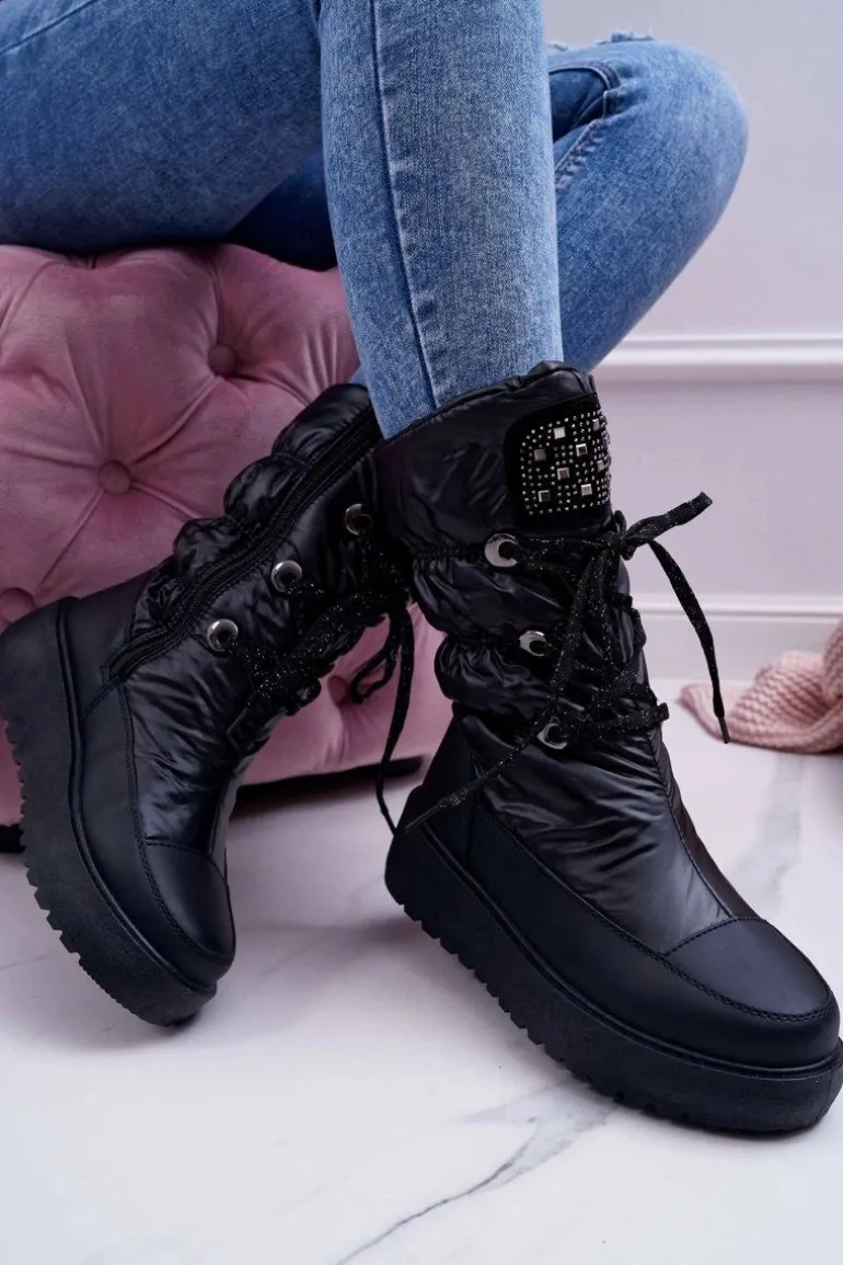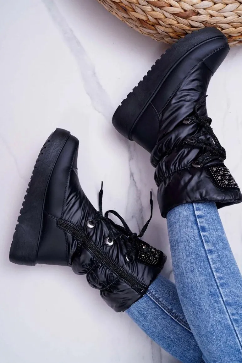 Damskie Botki Śniegowce Ocieplane Futerkiem Czarne Honor