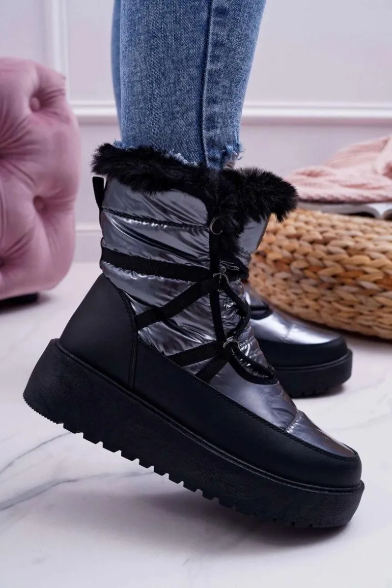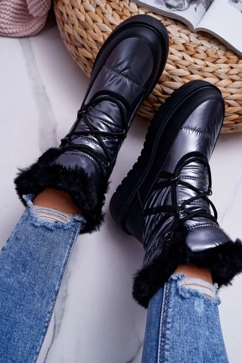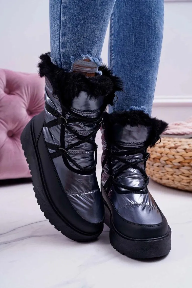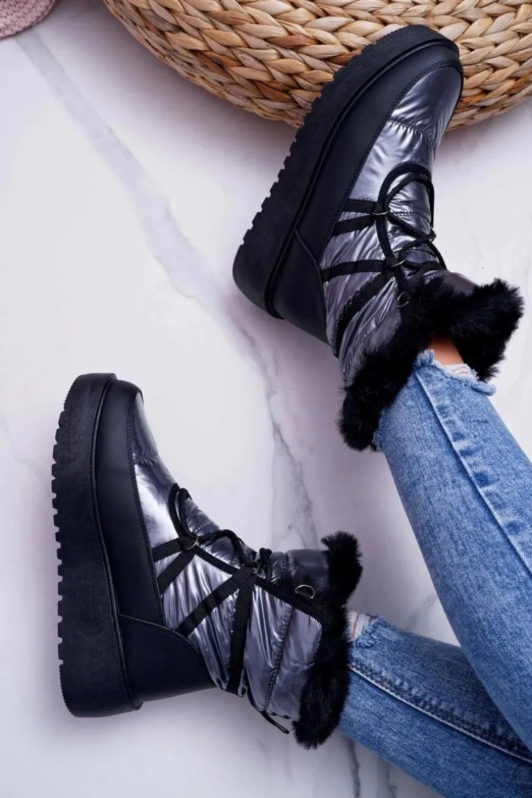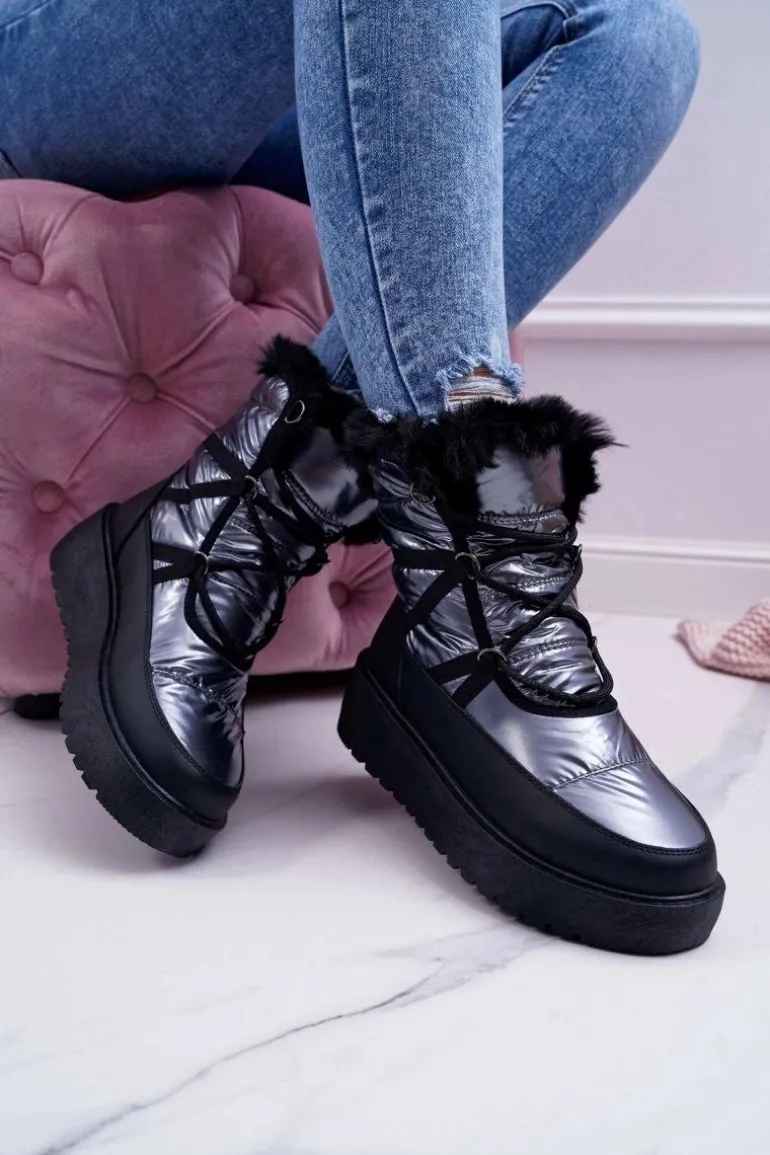 Damskie Botki Śniegowce Ocieplane Futerkiem Srebrne Calma