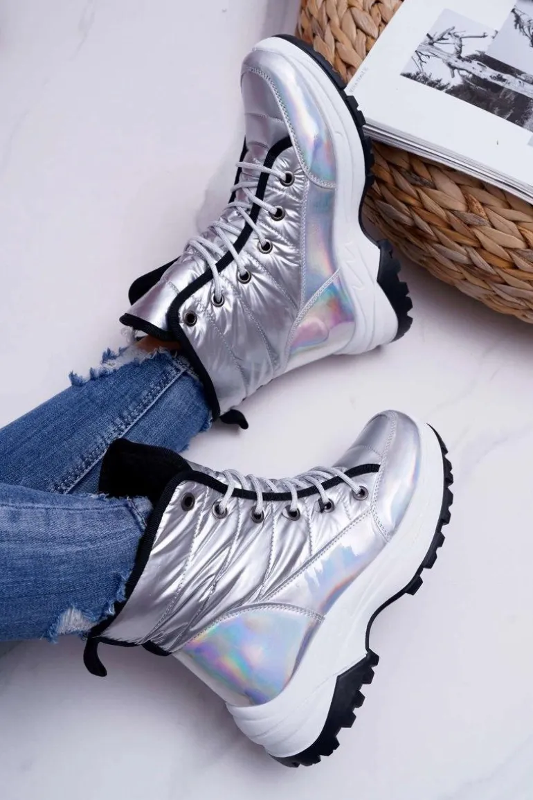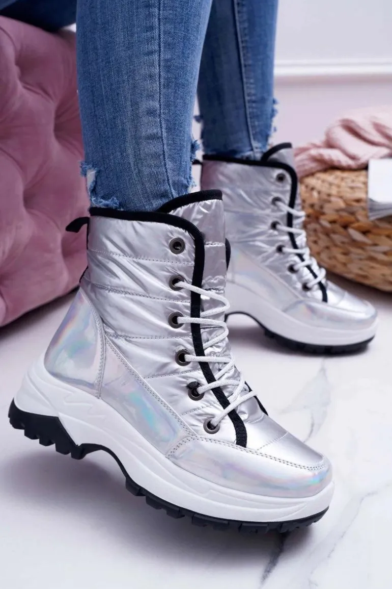 Damskie Botki Śniegowce Ocieplane Futerkiem Srebrne Muffin