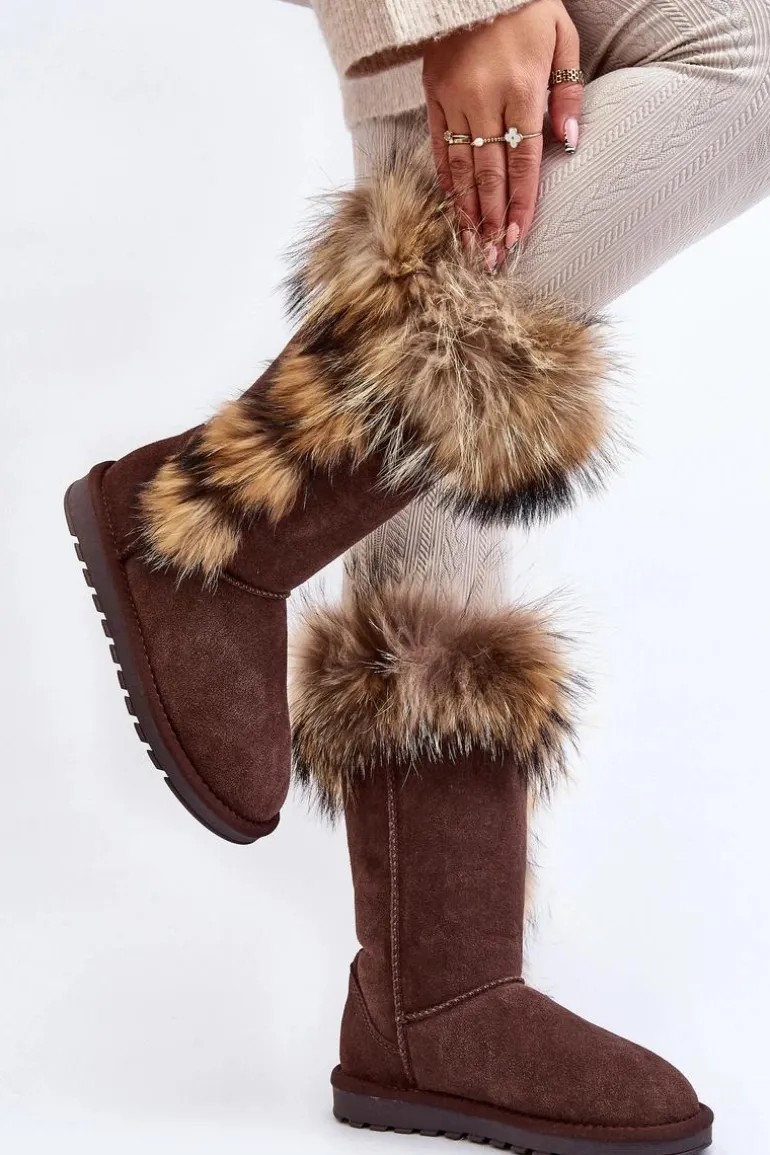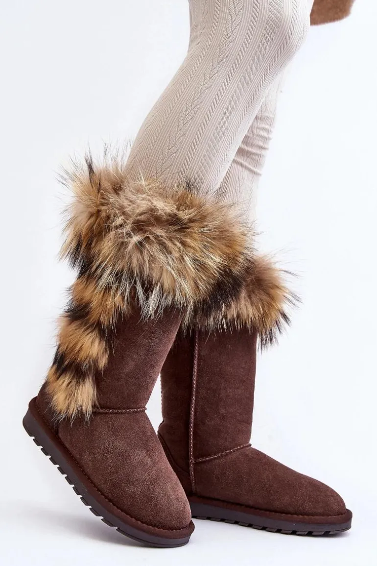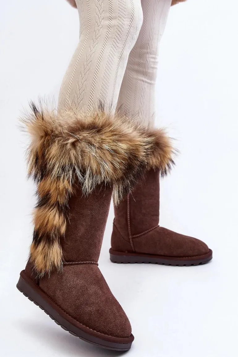 Świetnym wyborem na zimową porę są śniegowce! Wysoka cholewka sięgająca aż do połowy łydki oraz wnętrze pokryte grubym i ciepłym futerkiem. Dodatkowo góra cholewki oraz bok ozdobione są puszystym futerkiem, które nadaje im niesamowitego uroku. Śniegowce wykonane zostały z naturalnej zamszowej skóry. Są to buty idealne na chłodne jesienne, a nawet zimowe dni! Przy wyborze rozmiaru prosimy sugerować się tabelą rozmiarów.