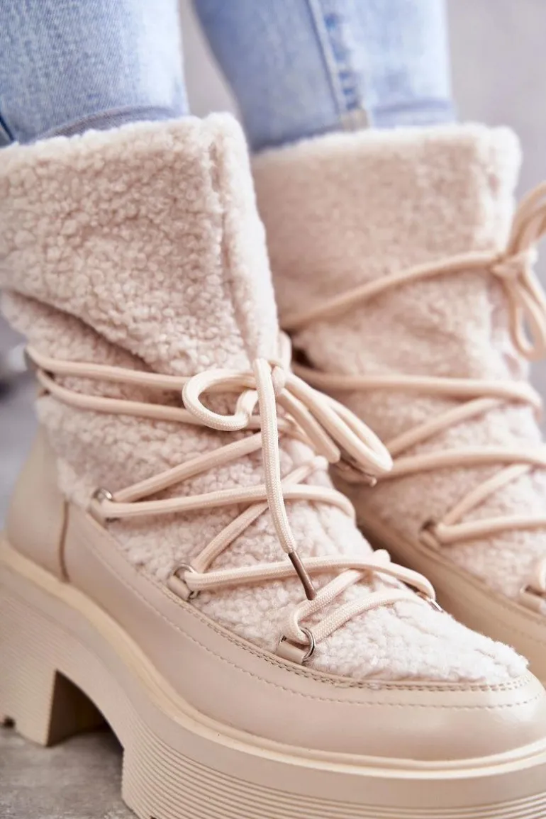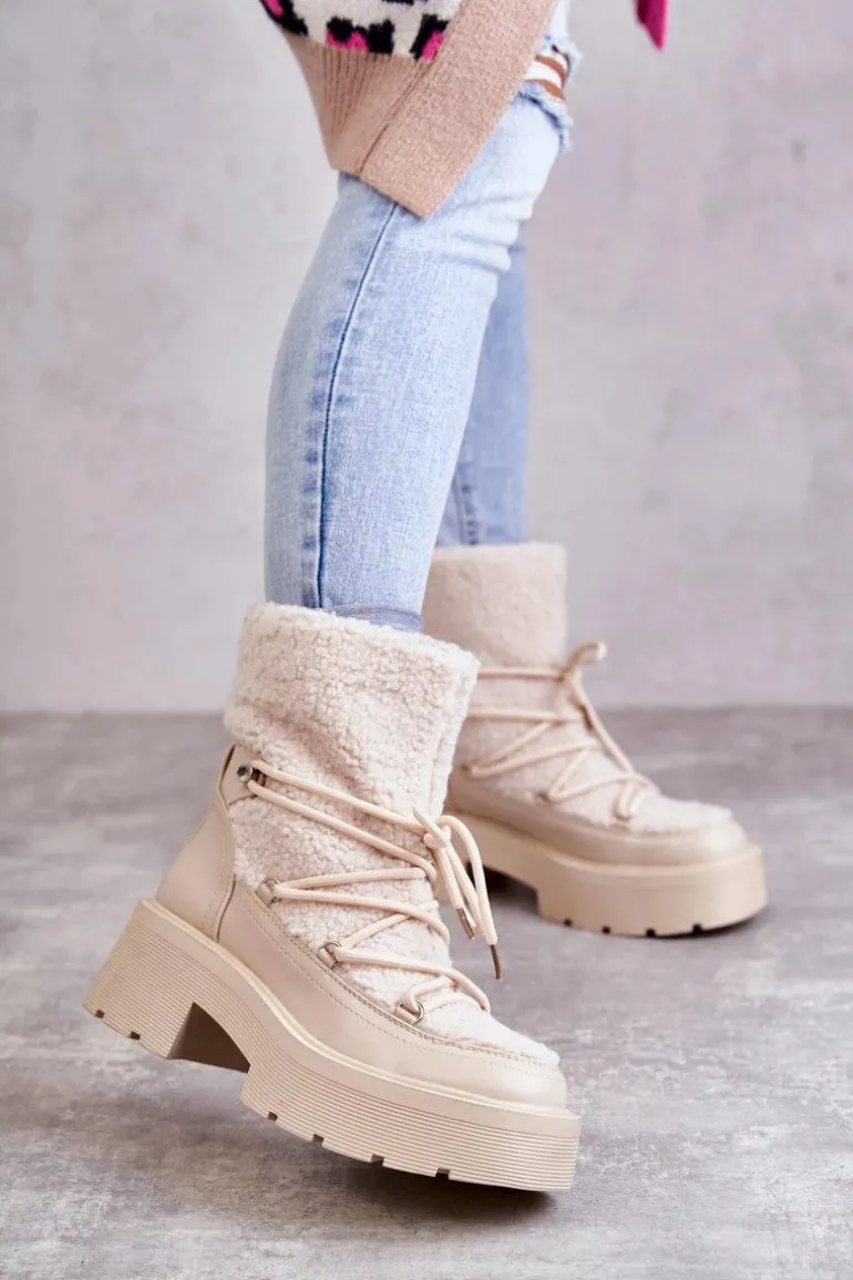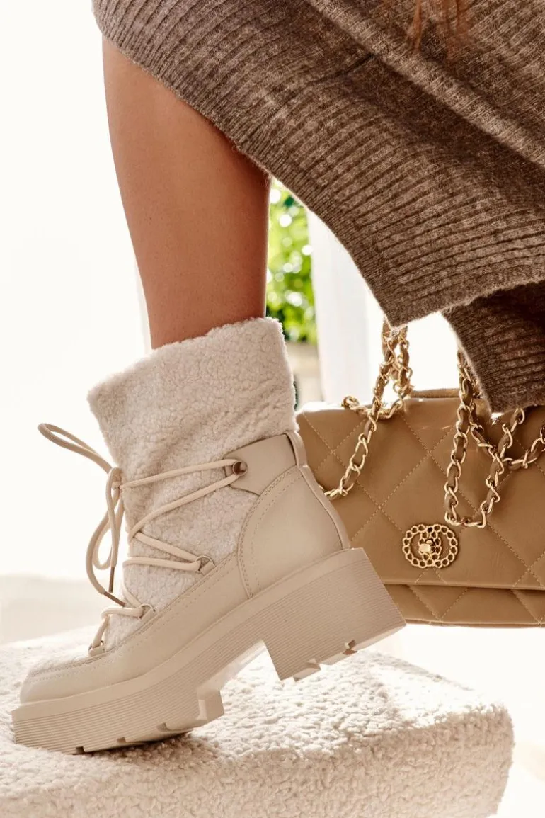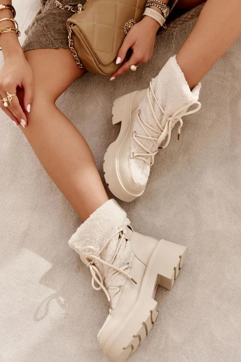 Cudowne botki w formie śniegowców zostały wykonane z materiału przypominającego kożuszek oraz eko skóry. Model klasycznie sznurowany. Botki zostały osadzone na płaskim obcasie i masywnej platformie. Posiadają w środku ocieplenie w postaci koca obuwniczego. Antypoślizgowa podeszwa zapewni stabilność na każdym kroku! Przy wyborze rozmiaru prosimy sugerować się tabelą rozmiarów.