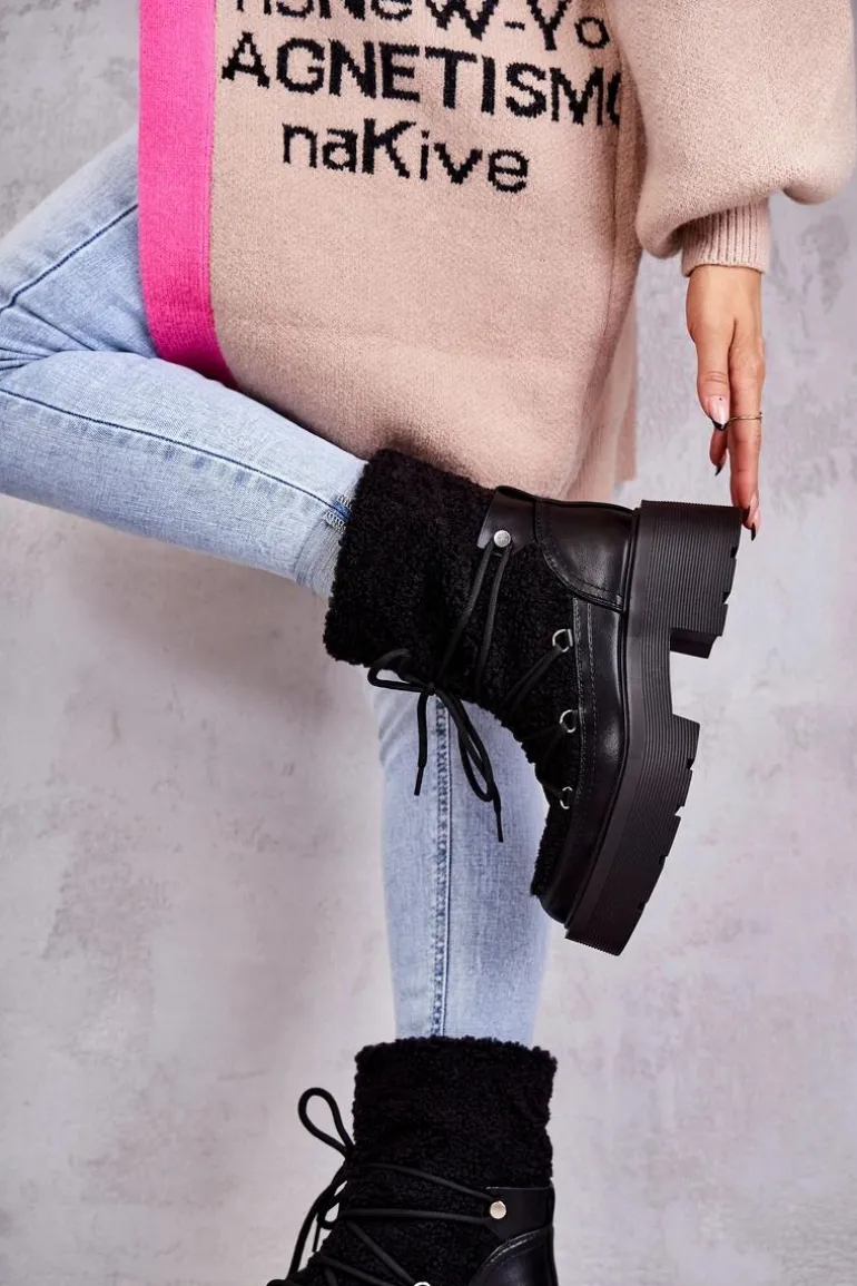 Cudowne botki w formie śniegowców zostały wykonane z materiału przypominającego kożuszek oraz eko skóry. Model klasycznie sznurowany. Botki zostały osadzone na płaskim obcasie i masywnej platformie. Posiadają w środku ocieplenie w postaci koca obuwniczego. Antypoślizgowa podeszwa zapewni stabilność na każdym kroku! Przy wyborze rozmiaru prosimy sugerować się tabelą rozmiarów.