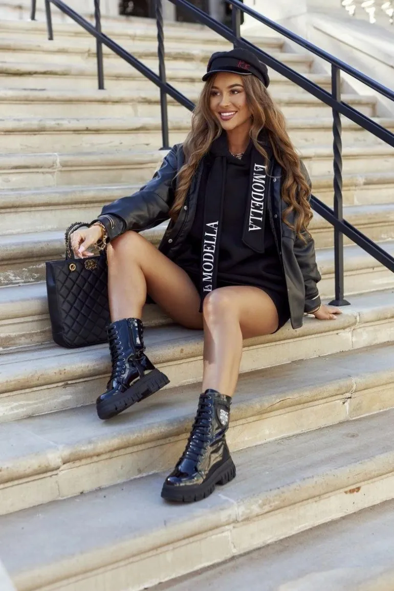 Cholewka wykonana z lakierowanej skóry ekologicznej. Wnętrze ocieplane kocem obuwniczym. Stabilny platforma. Suwak na boku ułatwi zakładanie. Sznurowanie z przodu jak i z tyłu cholewki. Przy wyborze rozmiaru prosimy sugerować się tabelą rozmiarów.