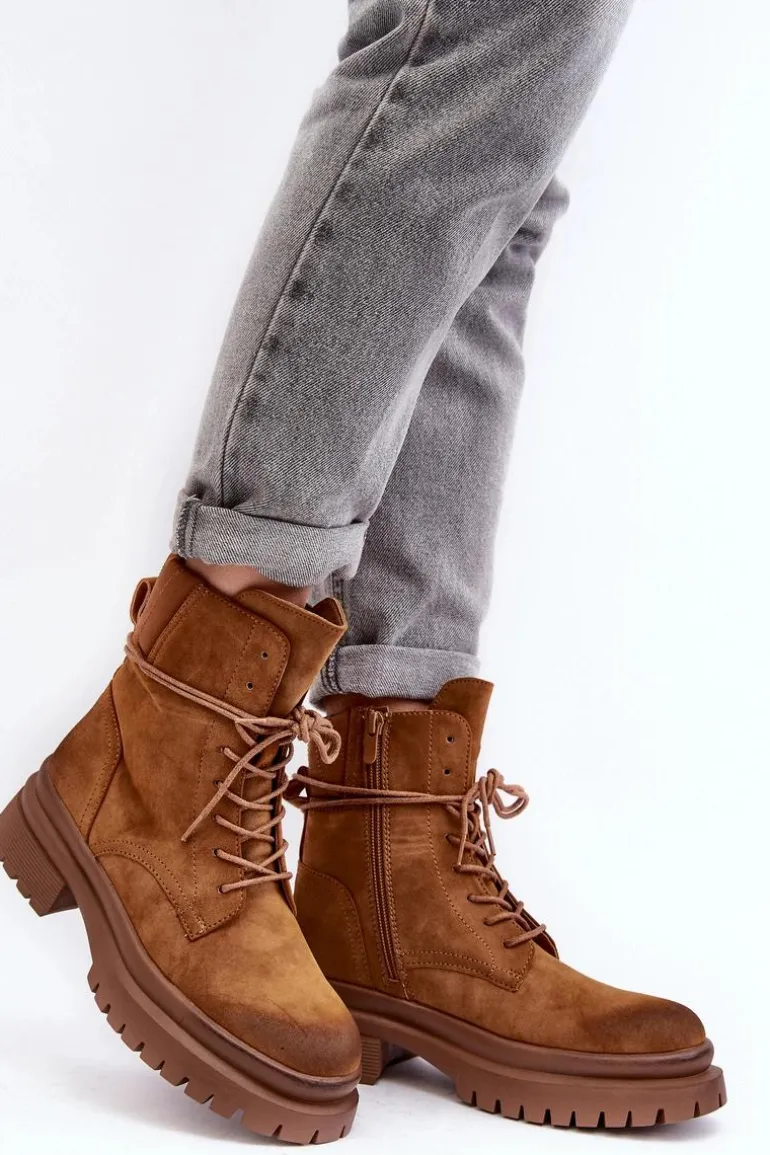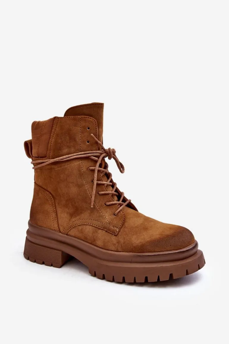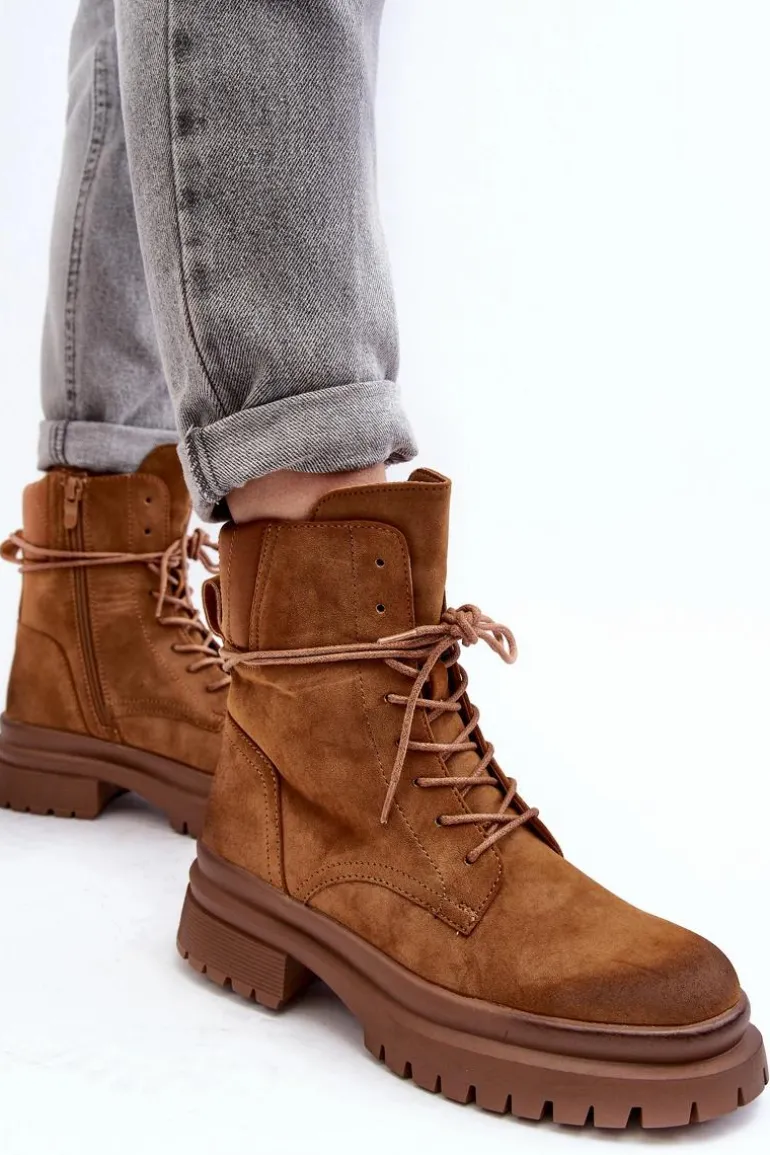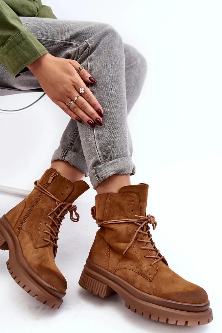 Damskie trapery wykonane z eko skóry. Osadzone na płaskim obcasie i platformie. Noski zaokrąglone. Model ten zapinany jest na suwak z boku oraz dodatkowo posiada sznurowanie. Usztywniony zapiętek zwiększy stabilizacje stopy. Koniecznie powinnaś je mieć! Przy wyborze rozmiaru prosimy sugerować się tabelą rozmiarów.