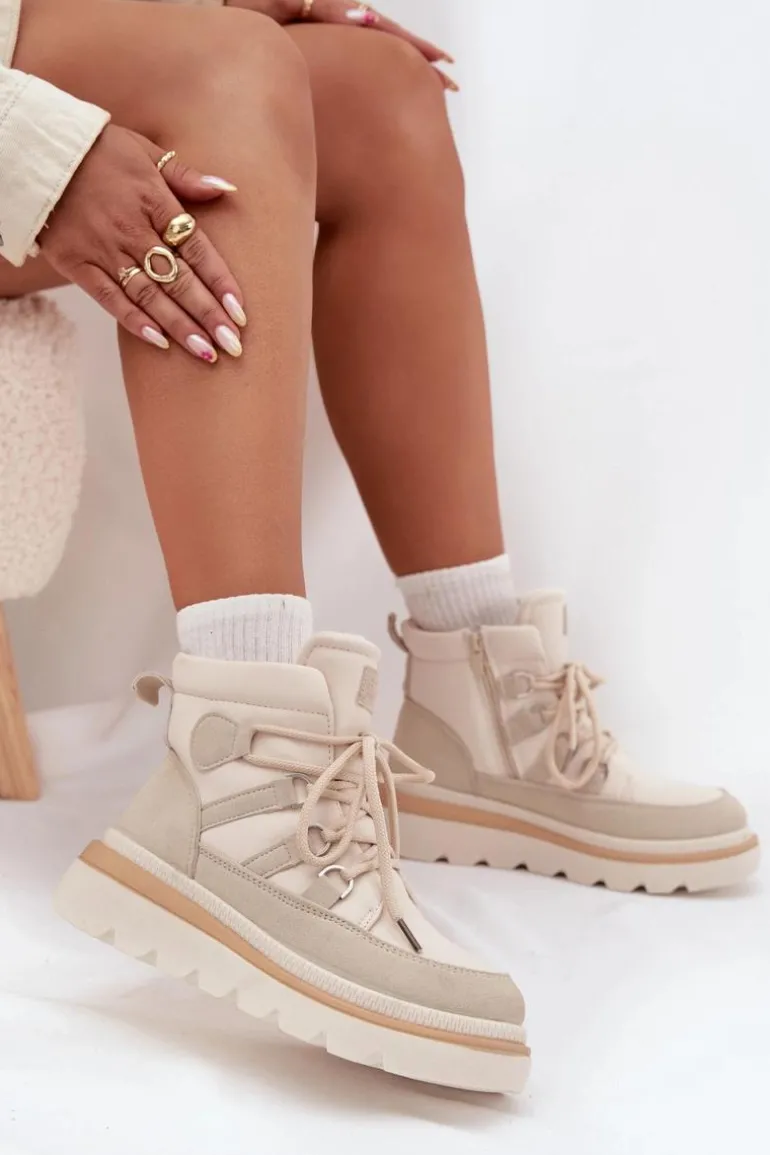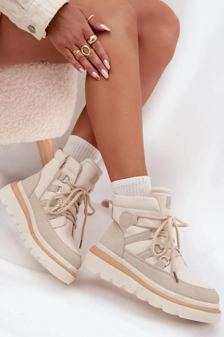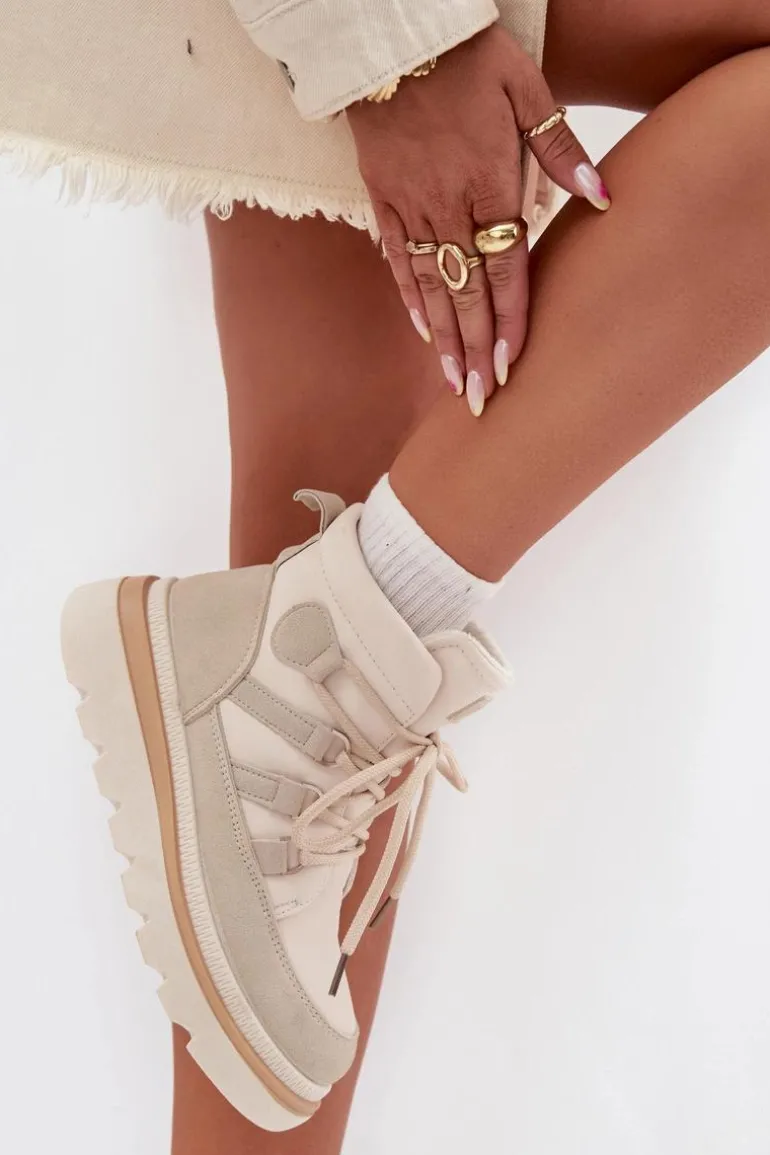 Botki damskie ocieplane to doskonały wybór na zimowe dni. Osadzone na platformie, zapewniają komfort i stabilność podczas chodzenia. Model ten wyposażony jest w sznurowanie oraz dodatkowe zapięcie na zamek, co ułatwia zakładanie i dopasowanie do stopy. Ocieplenie wewnątrz buta gwarantuje ciepło nawet w mroźne dni. Stylowy fason sprawia, że te botki będą świetnym uzupełnieniem każdej zimowej stylizacji. Przy wyborze rozmiaru prosimy sugerować się tabelą rozmiarów.