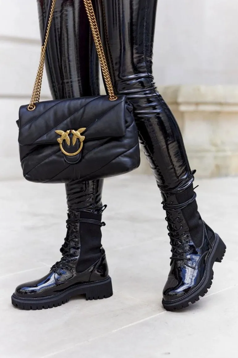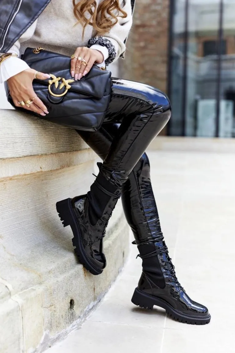 Modne botki, które są hitem tego sezonu! Wierzch wykonany z lakierowanej skóry ekologicznej. Wysoka, rozciągliwa cholewka, z wszytymi po bokach gumkami zapewni idealne dopasowanie. Model klasycznie sznurowany. Przy wyborze rozmiaru prosimy sugerować się tabelą rozmiarów.