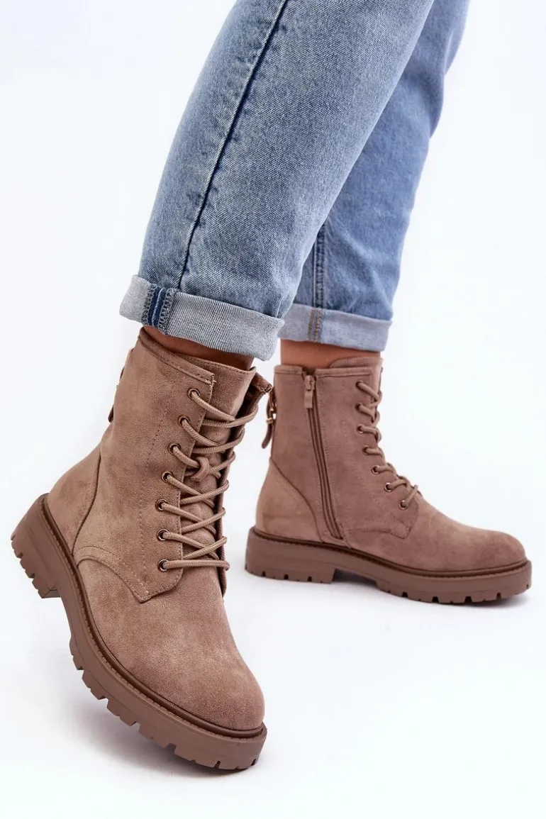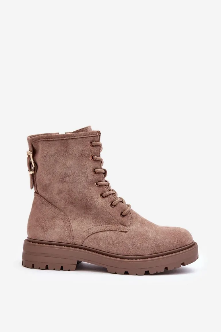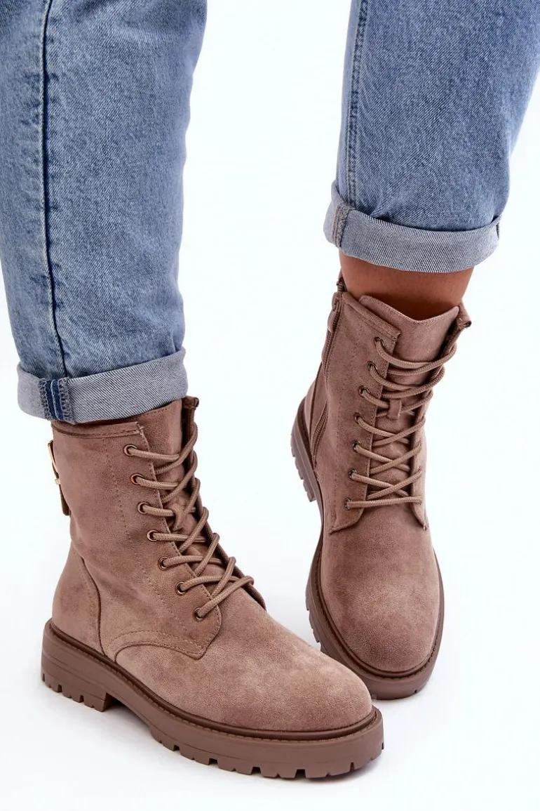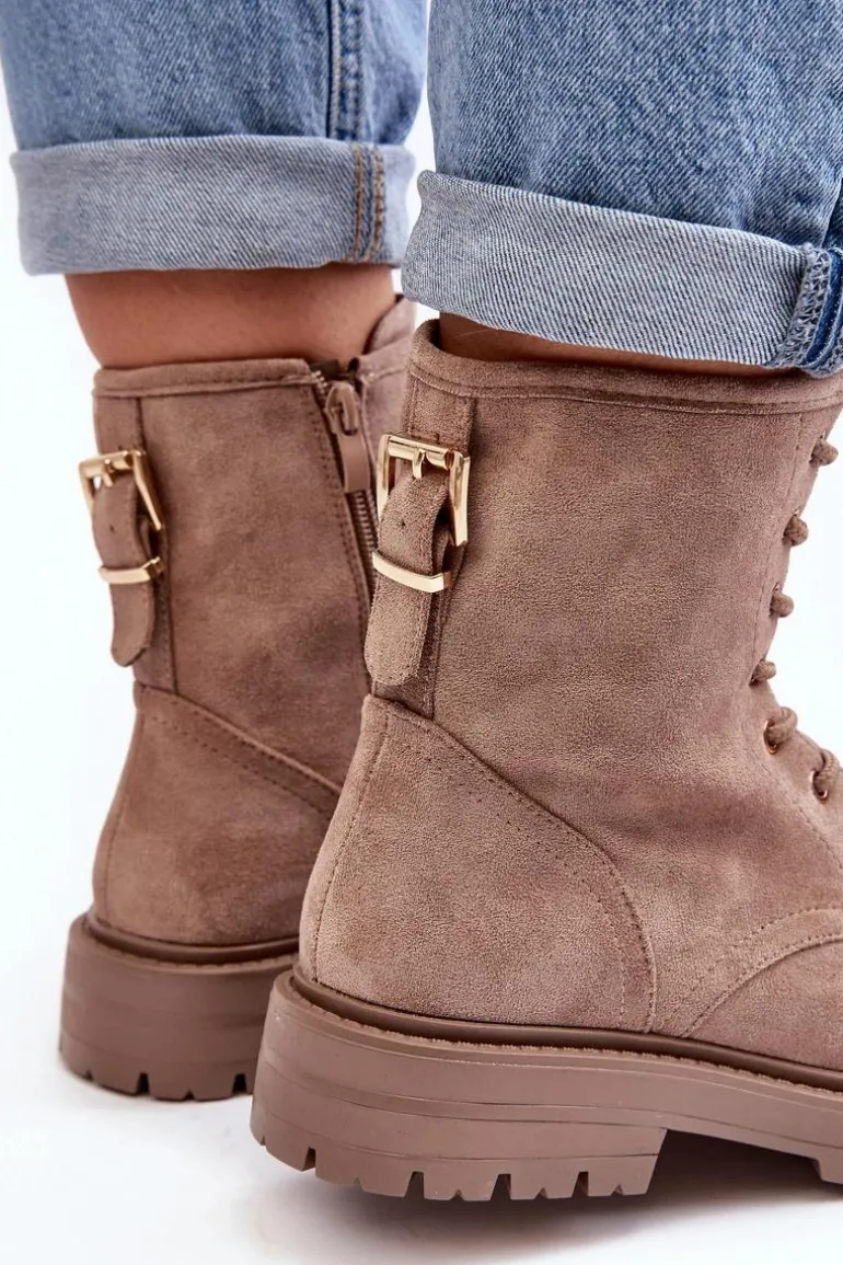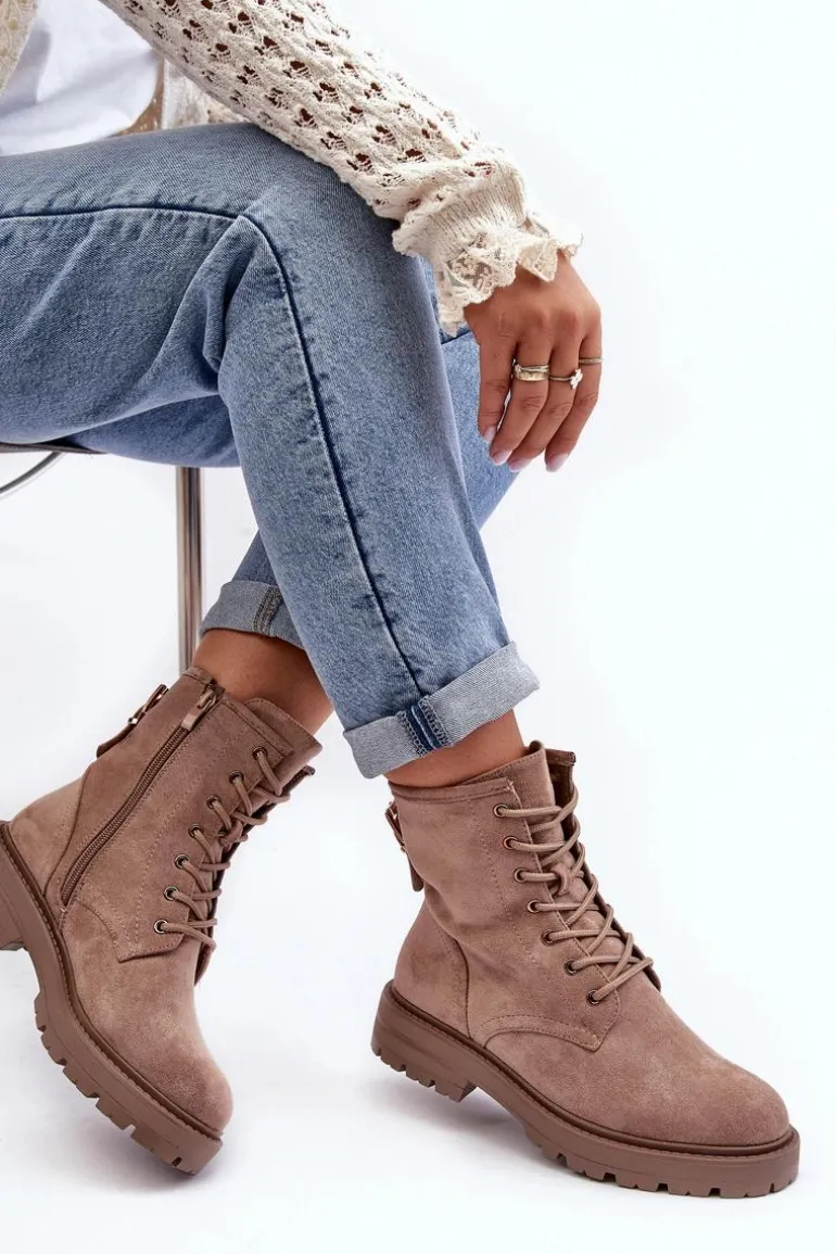 Klasyczne botki damskie wykonane z eko zamszu. Osadzone na platformie oraz płaskim obcasie. Model ten zapinany jest na suwak oraz dodatkowo posiada sznurowanie. Noski zaokrąglone. Zapiętek usztywniany pozwoli na odpowiednią stabilizację stopy. Z tyłu cholewki krótki pasek z klamrą. Koniecznie powinnaś je mieć! Przy wyborze rozmiaru prosimy sugerować się tabelą rozmiarów.