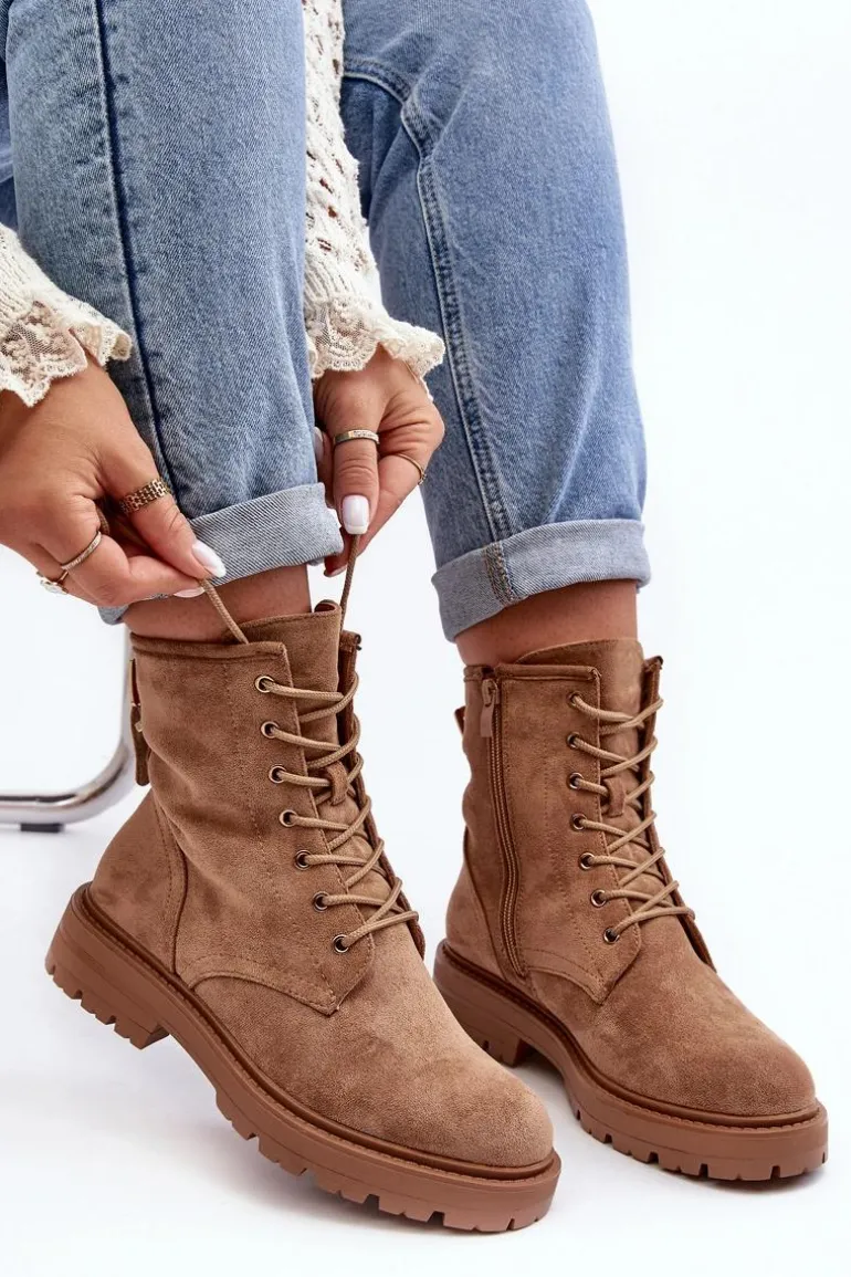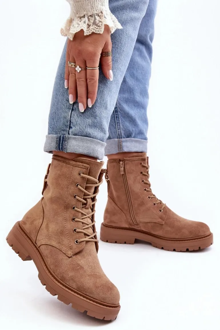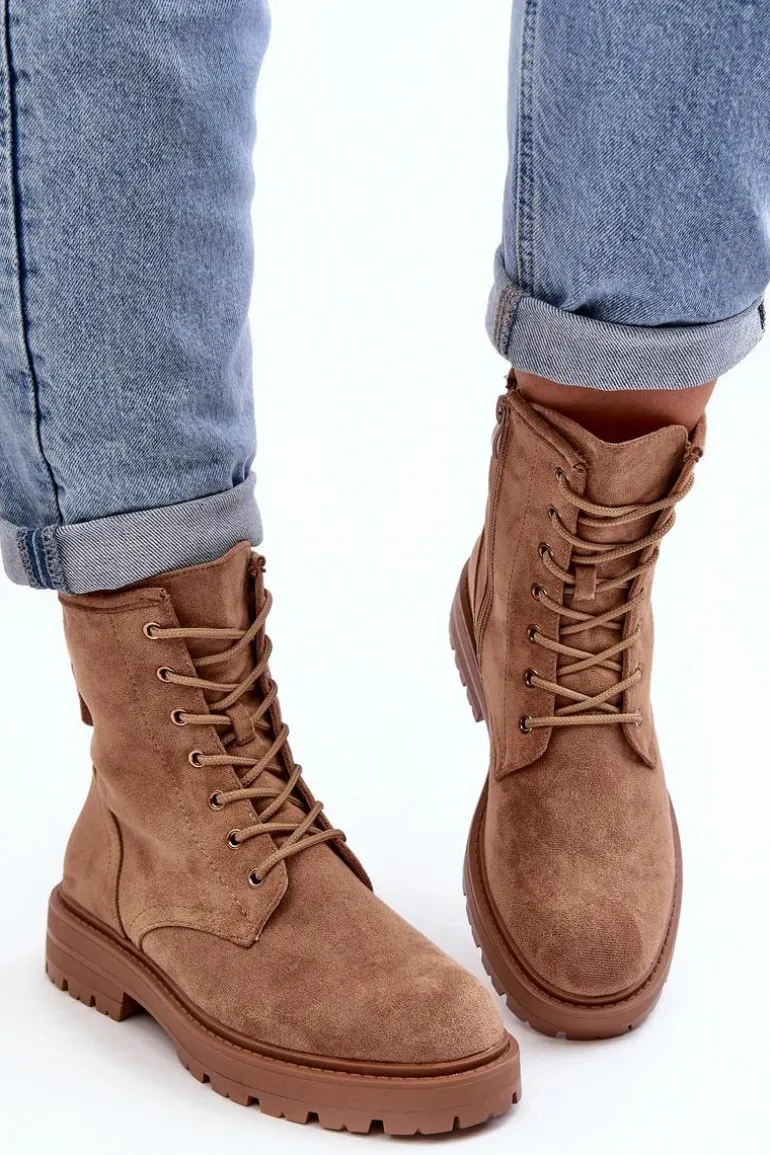 Klasyczne botki damskie wykonane z eko zamszu. Osadzone na platformie oraz płaskim obcasie. Model ten zapinany jest na suwak oraz dodatkowo posiada sznurowanie. Noski zaokrąglone. Zapiętek usztywniany pozwoli na odpowiednią stabilizację stopy. Z tyłu cholewki krótki pasek z klamrą. Koniecznie powinnaś je mieć! Przy wyborze rozmiaru prosimy sugerować się tabelą rozmiarów.