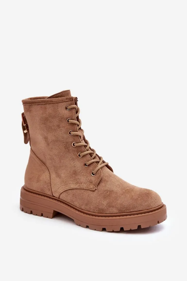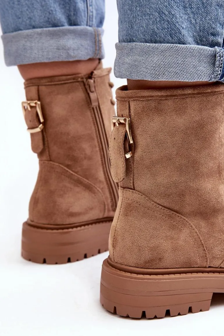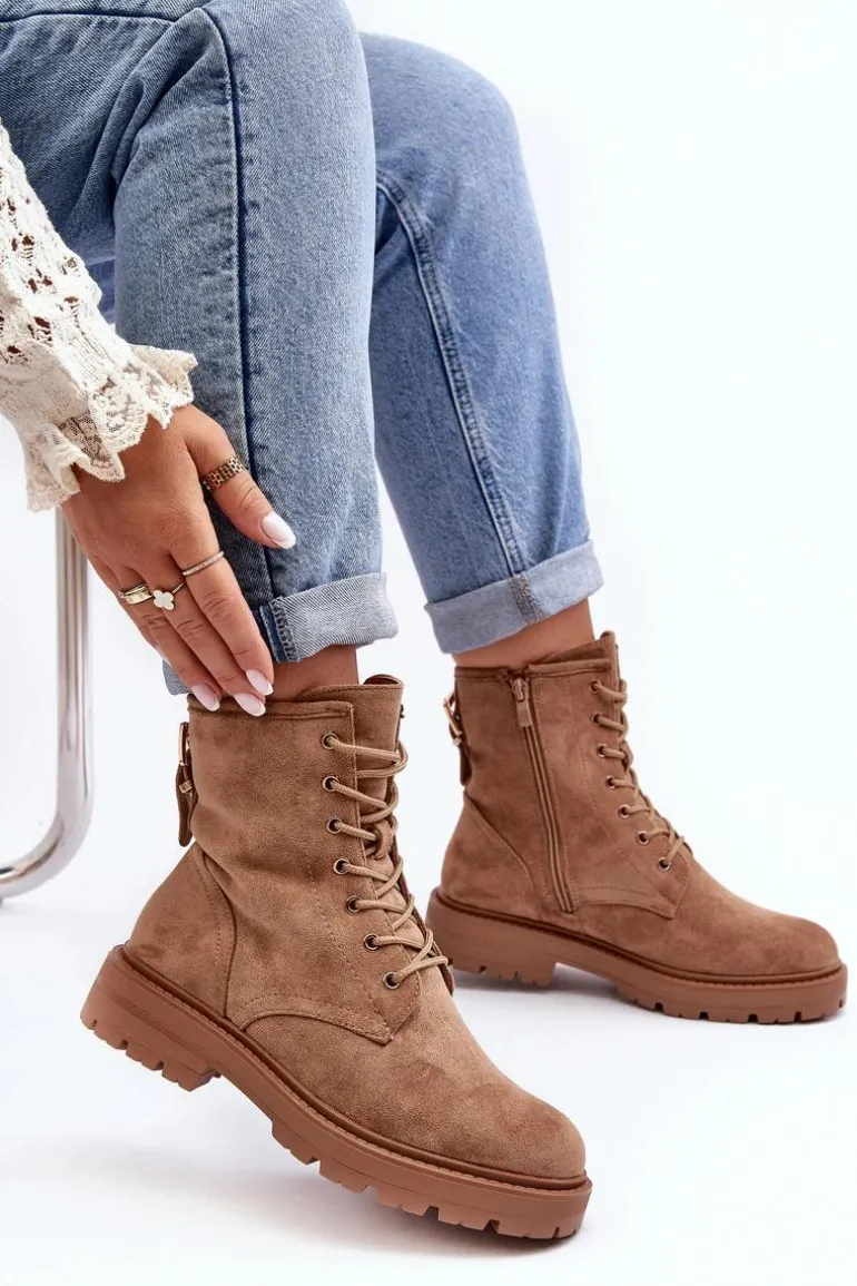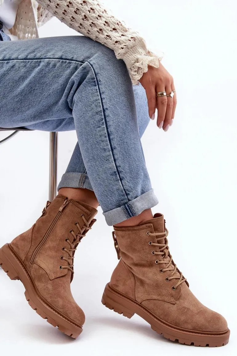 Klasyczne botki damskie wykonane z eko zamszu. Osadzone na platformie oraz płaskim obcasie. Model ten zapinany jest na suwak oraz dodatkowo posiada sznurowanie. Noski zaokrąglone. Zapiętek usztywniany pozwoli na odpowiednią stabilizację stopy. Z tyłu cholewki krótki pasek z klamrą. Koniecznie powinnaś je mieć! Przy wyborze rozmiaru prosimy sugerować się tabelą rozmiarów.