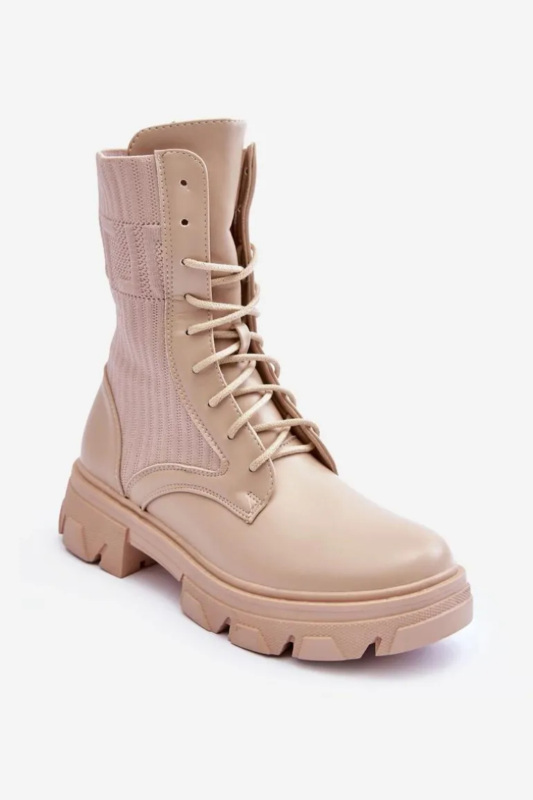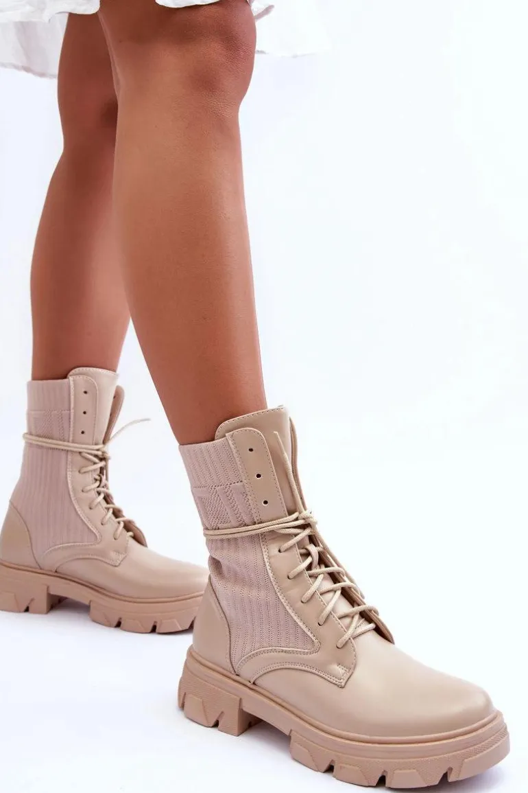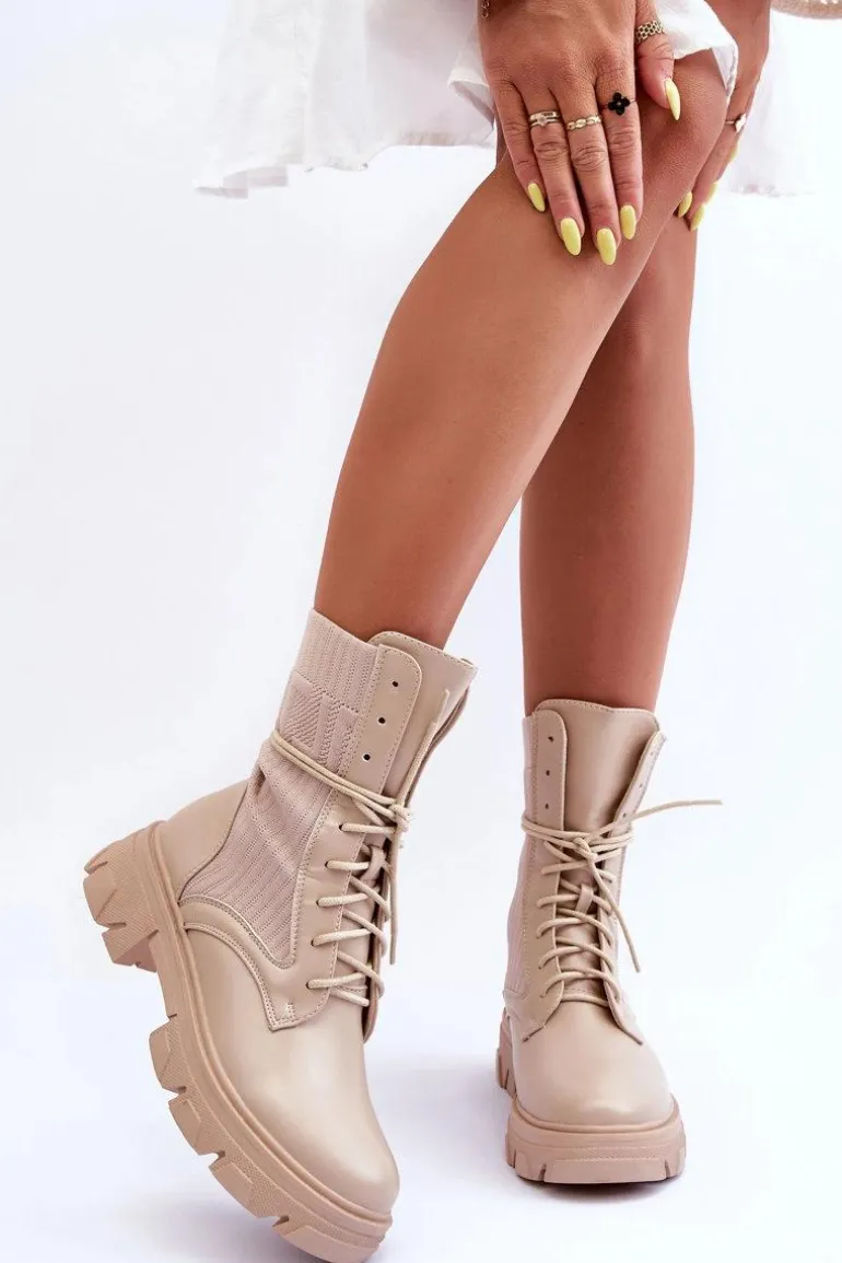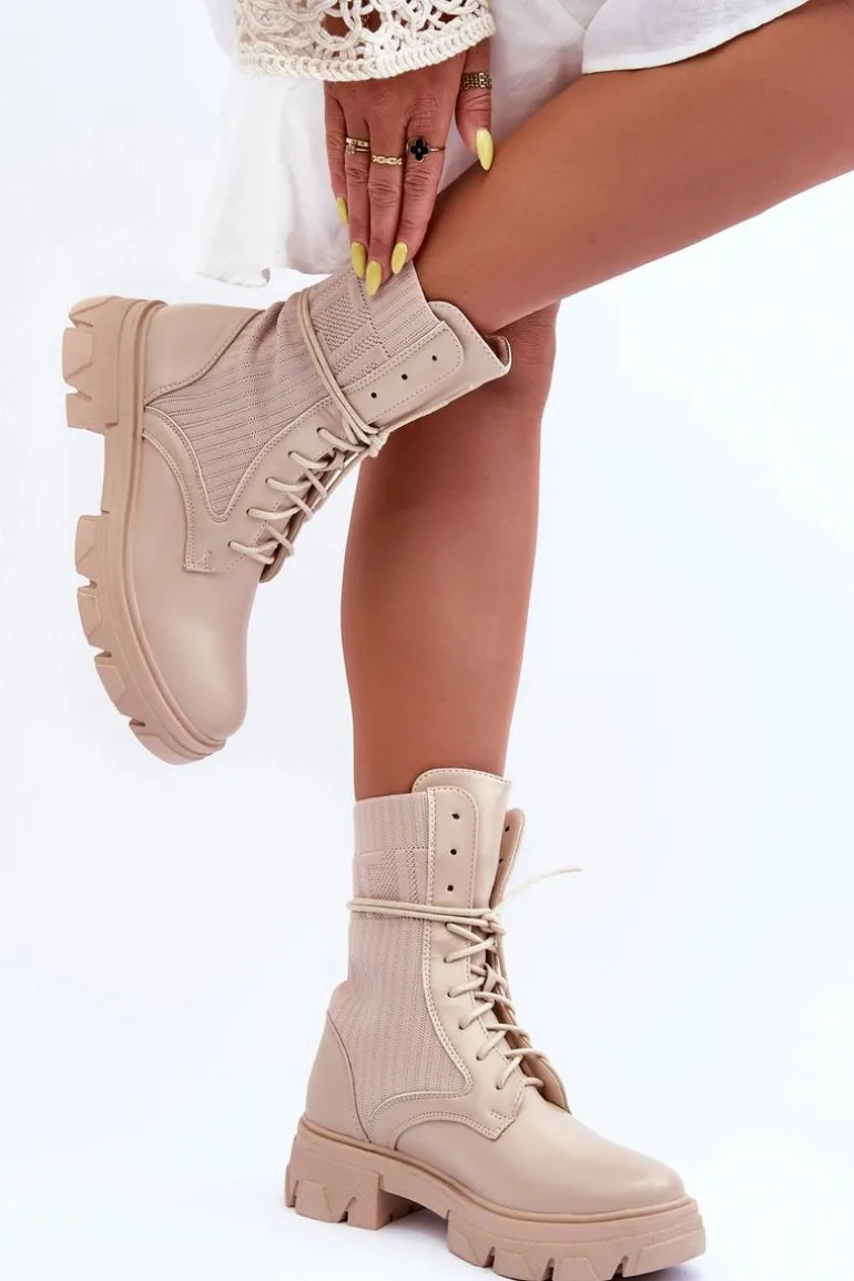 Damskie botki na płaskim, masywnym obcasie i platformie świetnie sprawdzą się do wielu stylizacji! Wykonane z połączenia elastycznej tkaniny oraz eko skóry. Model klasycznie sznurowany pozwoli na odpowiednie dopasowanie obuwia do tęgości nogi. Dodatkowo botki te posiadają usztywniany zapiętek. Materiałowa wkładka zapewni komfort podczas użytkowania. Przy wyborze rozmiaru prosimy sugerować się tabelą rozmiarów.