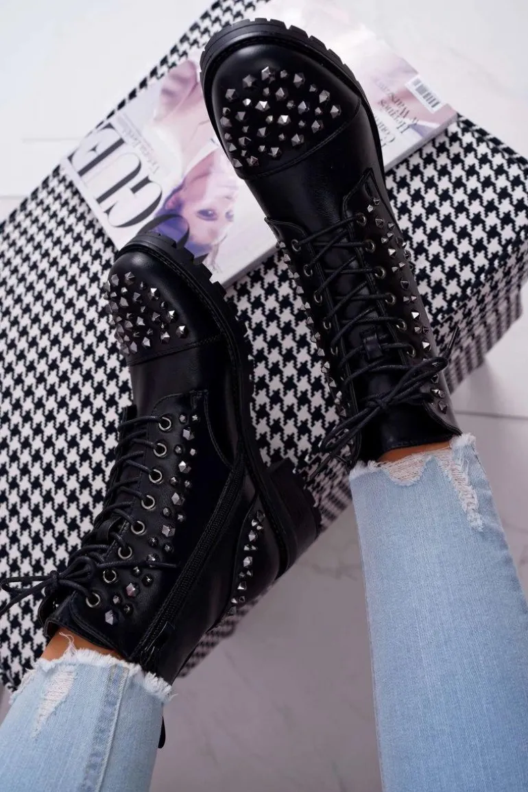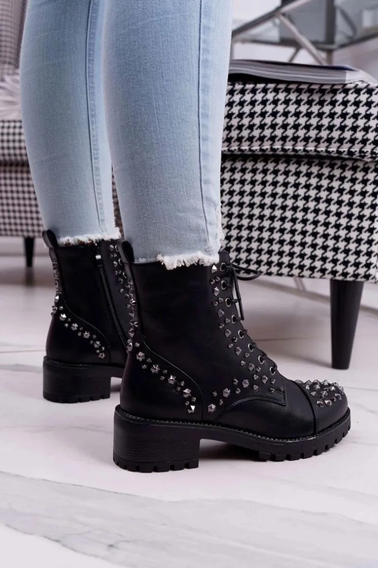 Damskie Botki Workery Z Dżetami Czarne Gether