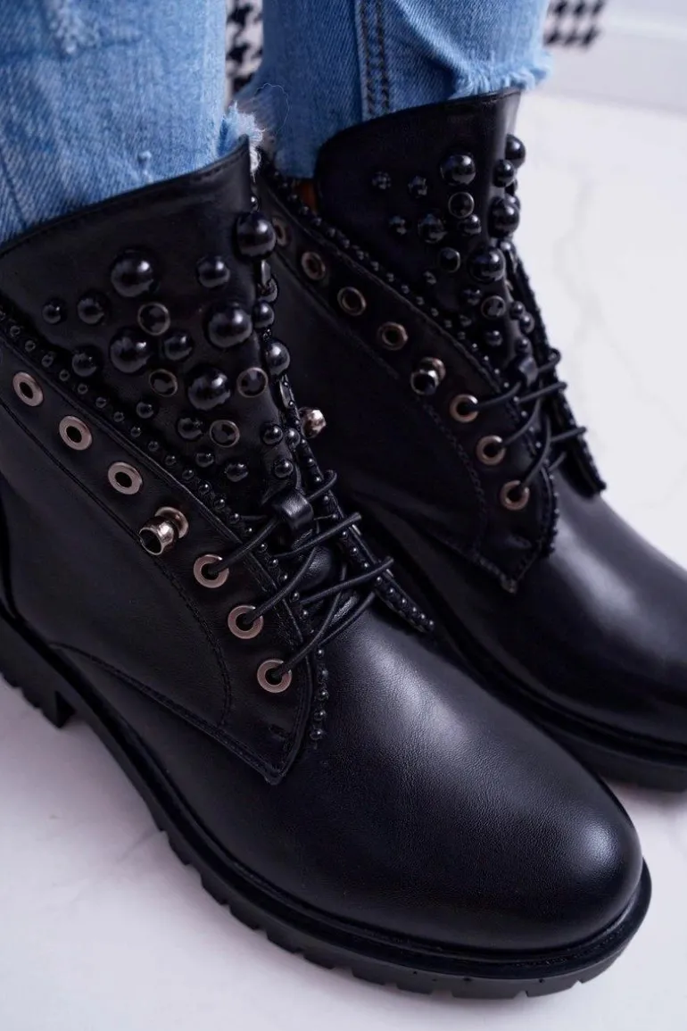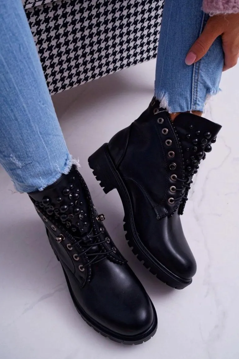Damskie Botki Z Perełkami Ciepłe Czarne Memer