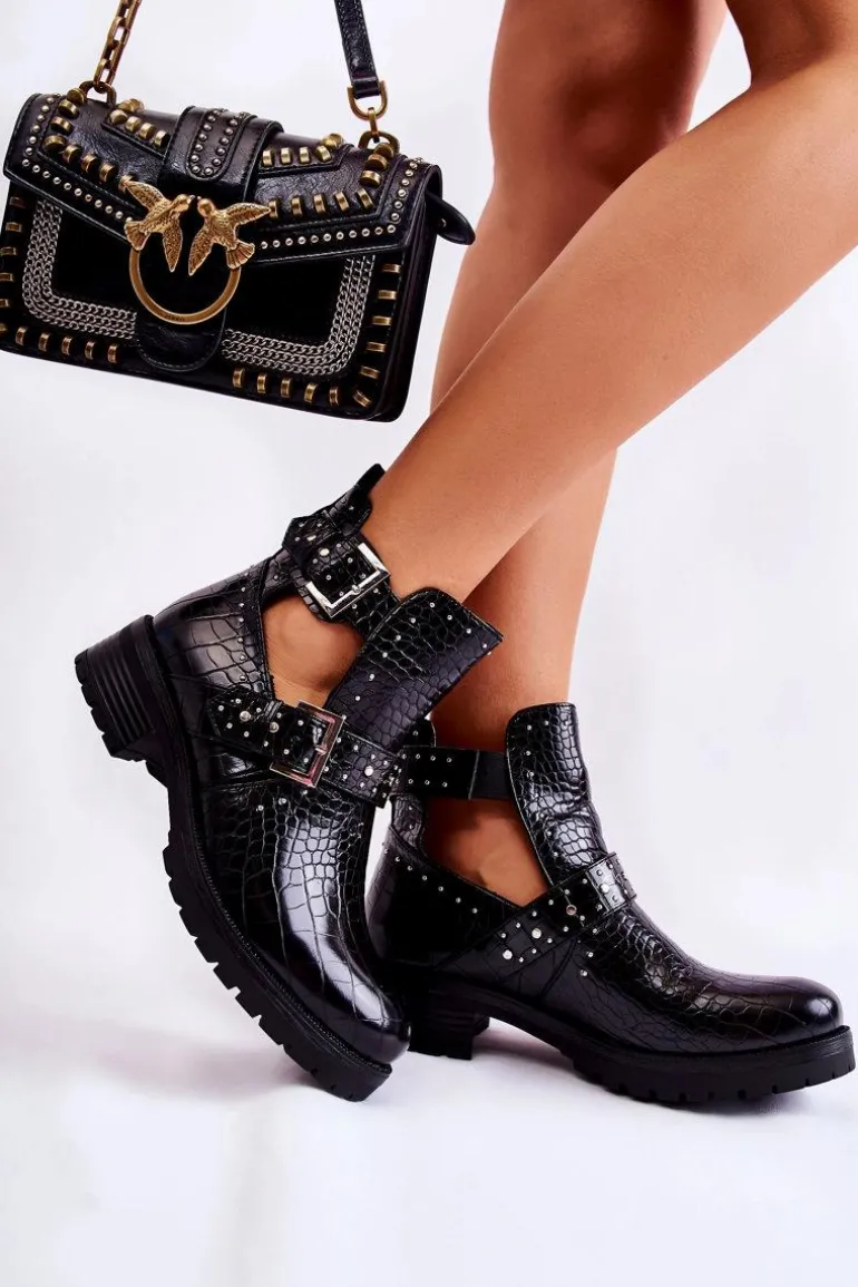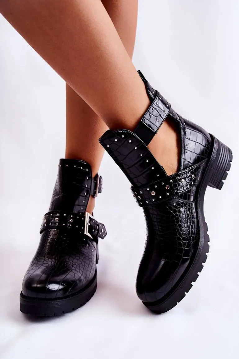 Wyjątkowe botki damskie z wycięciami po bokach cholewki. Wyglądają bardzo efektownie, dzięki sprzączkom na boku oraz zdobieniom w postaci ćwieków. Z wierzchu zostały wykonane ze skóry ekologicznej. Posiadają usztywniany zapiętek. Model osadzony na delikatnej platformie i płaskim obcasie. Koniecznie powinnaś je mieć! Nie czekaj dłużej i kup już teraz! Przy wyborze rozmiaru prosimy sugerować się tabelą rozmiarów.