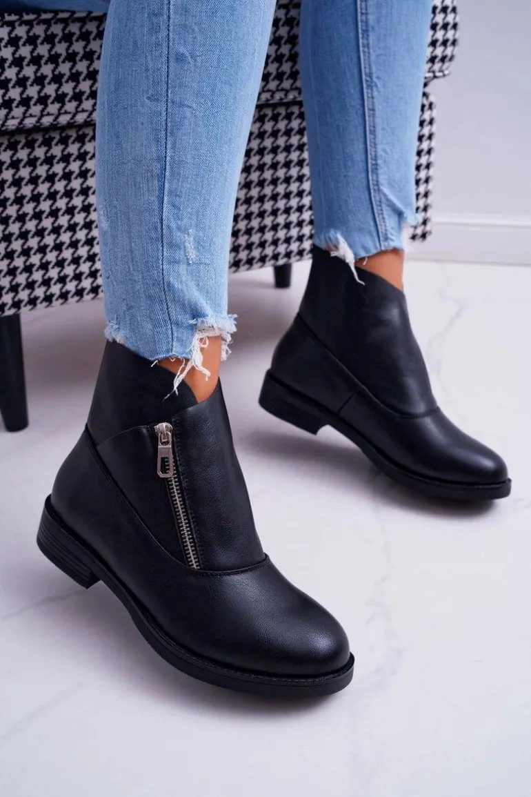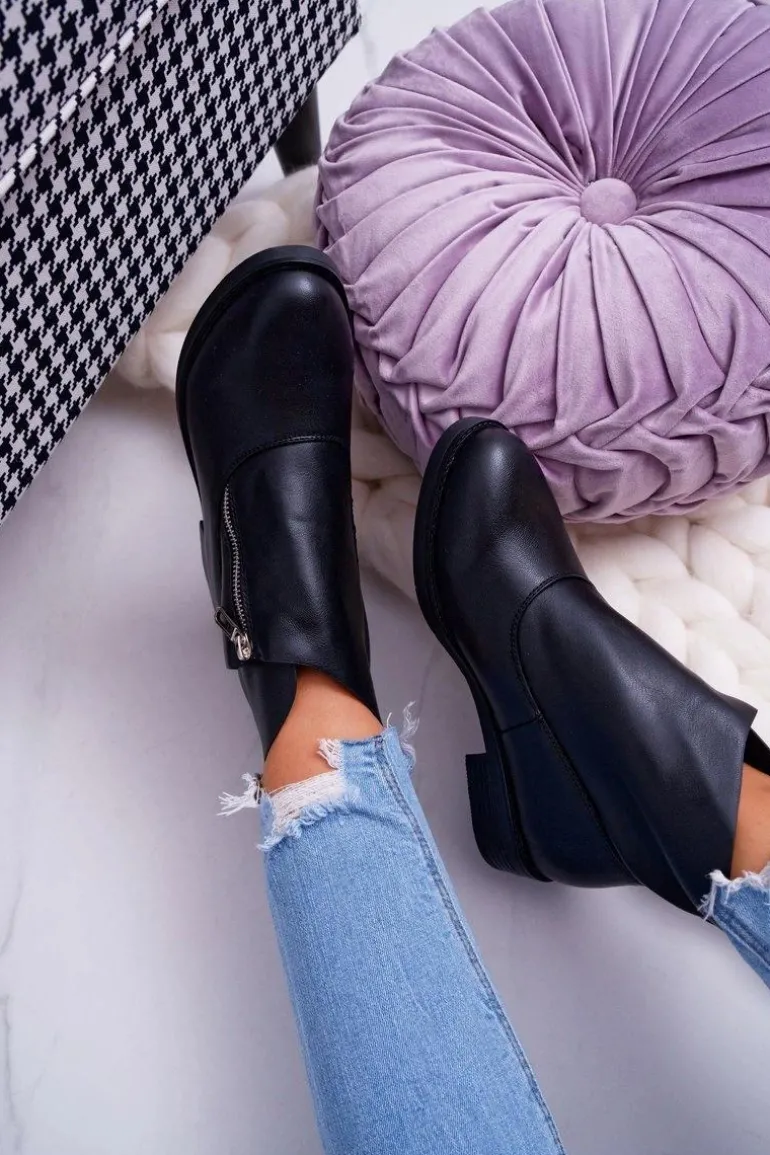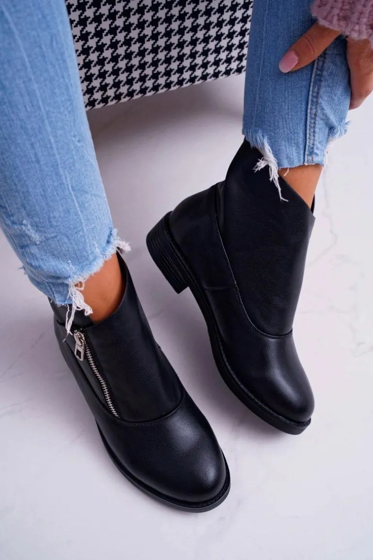 Klasyczne botki, które sprawdzą się w każdej sytuacji. Prosty krój z ozdobnym oraz ułatwiającym zakładanie zamkiem na boku. Wnętrze buta do połowy pokryte jest kocem obuwniczym. Przy wyborze rozmiaru prosimy sugerować się tabelą rozmiarów.