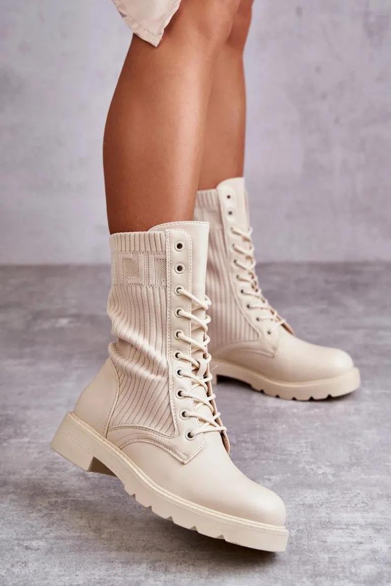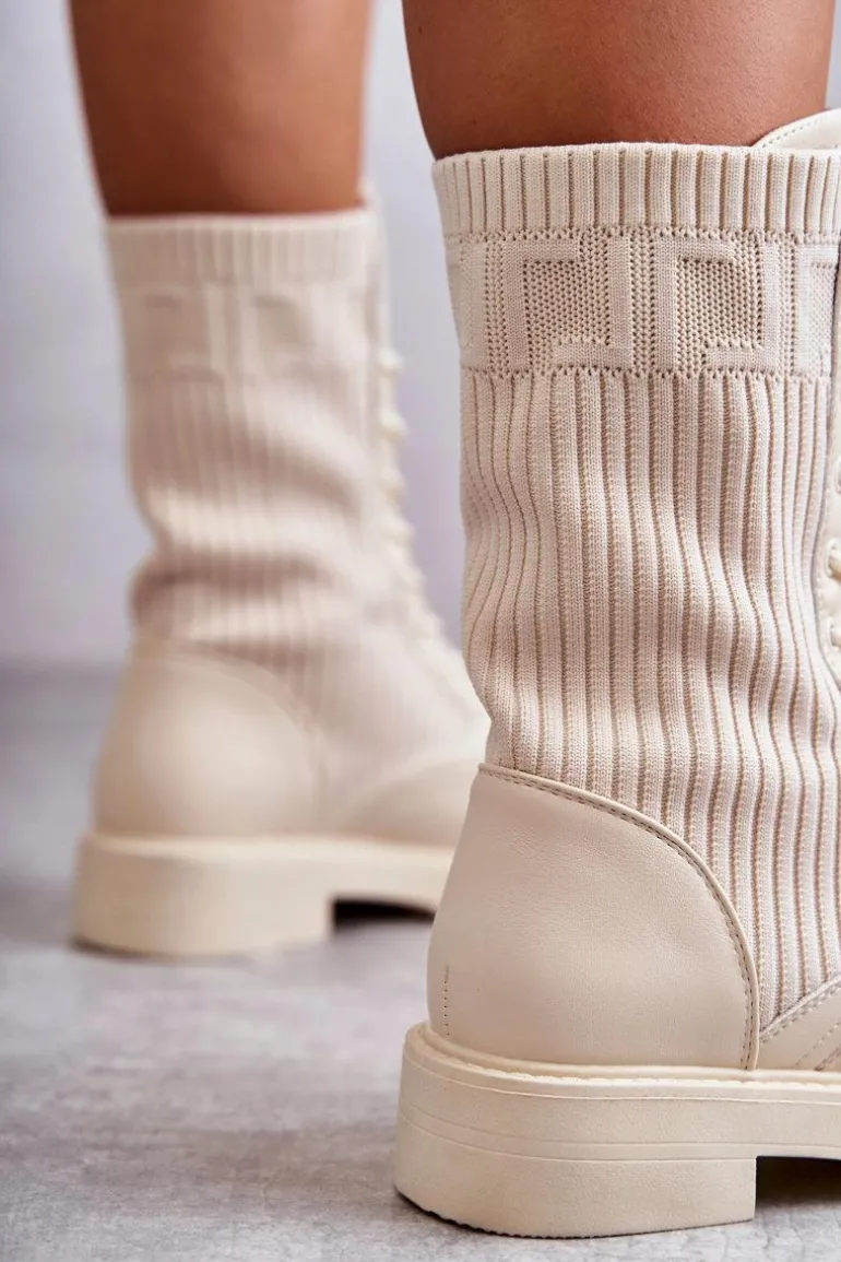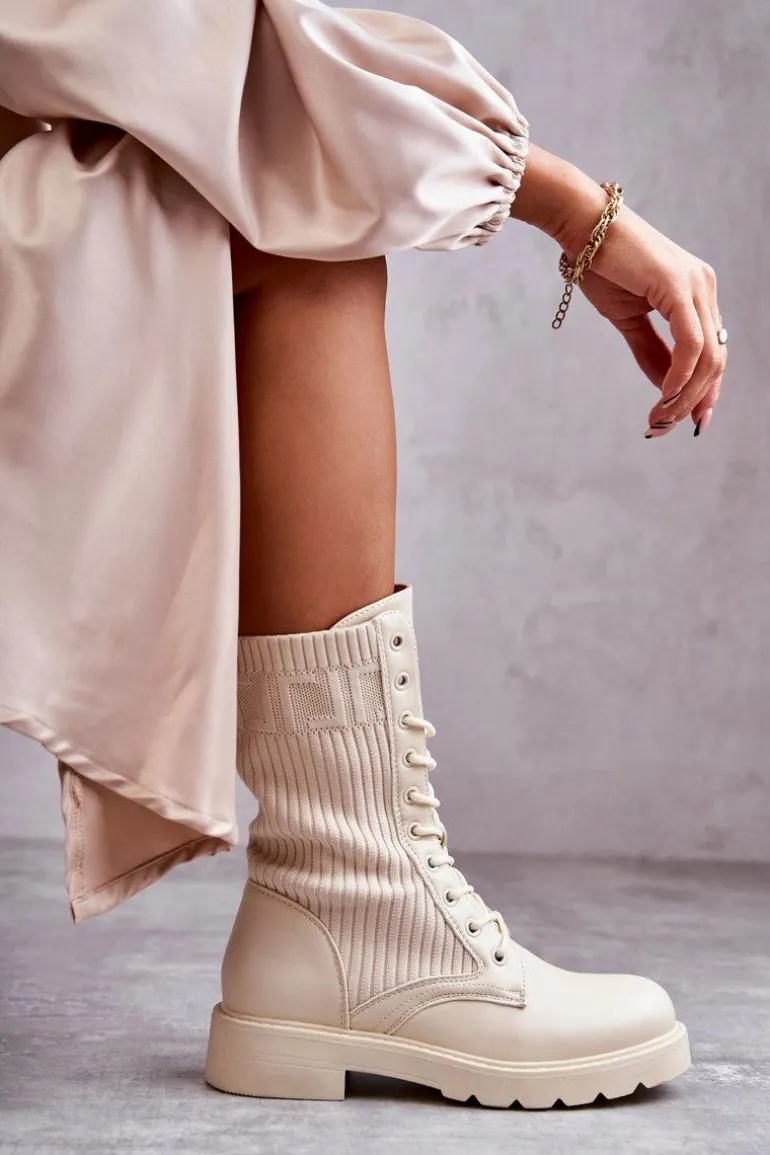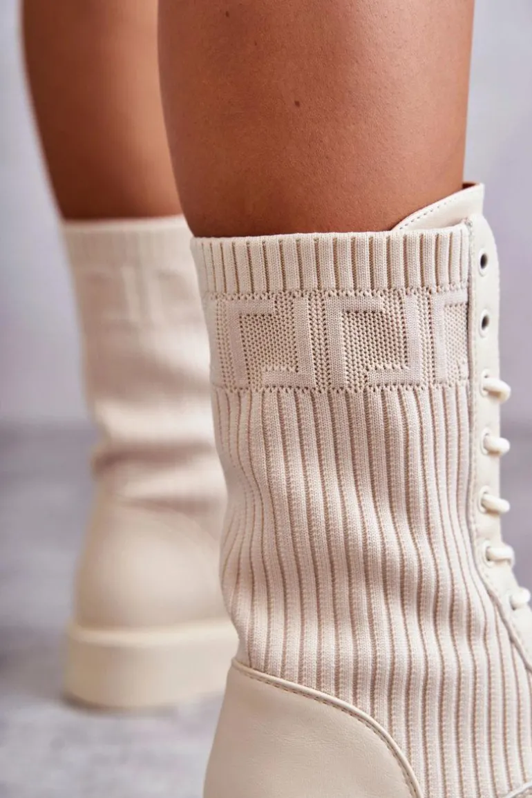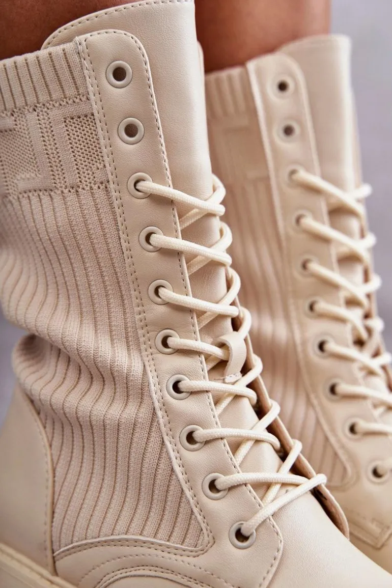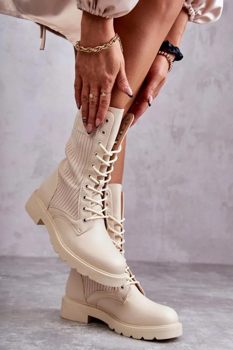 Klasyczne botki z wyższą cholewką wykonaną z połączenia eko skóry oraz elastycznego, prążkowanego materiału. Model klasycznie sznurowany. Botki zostały osadzone na płaskim obcasie i delikatnej platformie. Zapiętek jest usztywniany. Wkładka w tych butach jest ocieplana kocem obuwniczym. Świetny model do wielu stylizacji! Przy wyborze rozmiaru prosimy sugerować się tabelą rozmiarów.