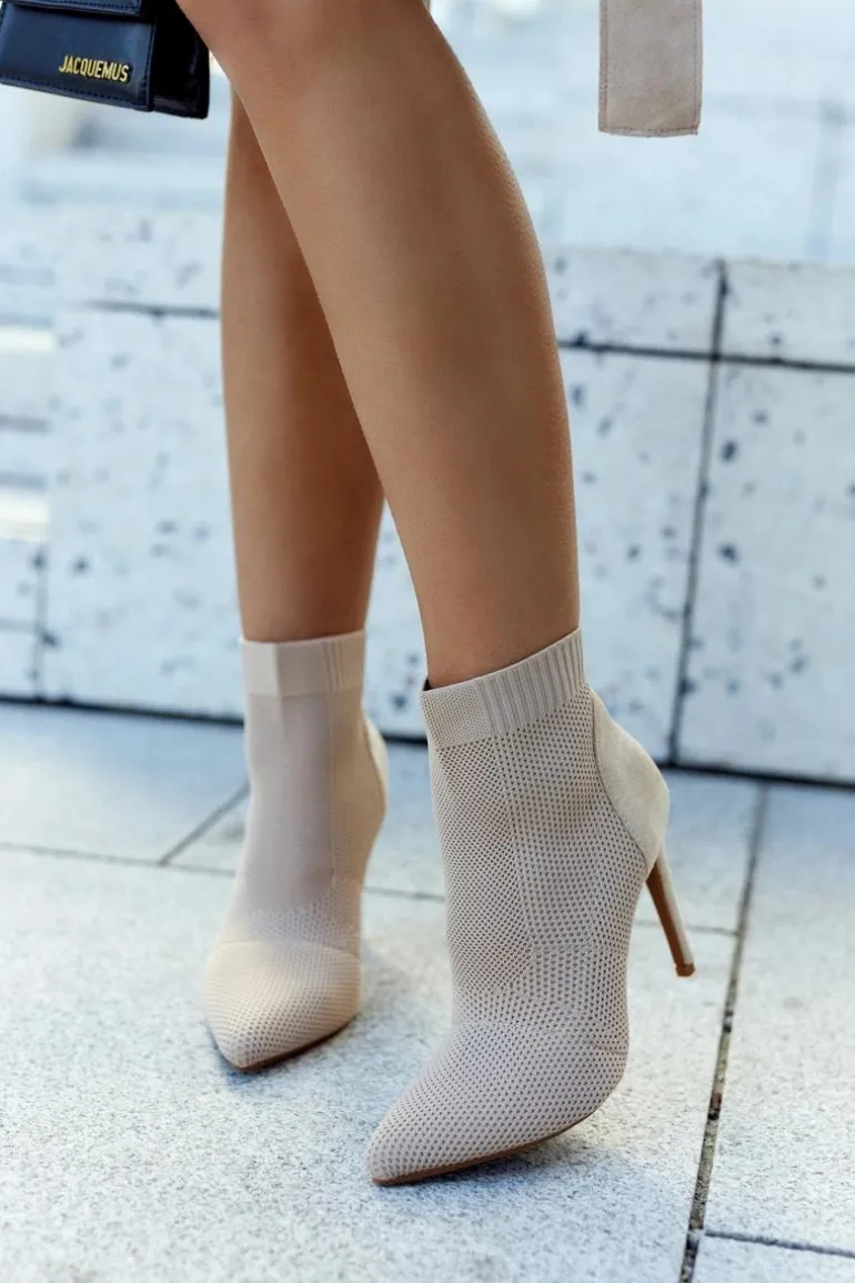 Botki posiadają stylową, skarpetkową cholewkę za kostkę. Osadzone na obcasie typu szpilka. Nosek w szpic świetnie wysmukli stopę. Model wsuwany, idealnie dopasuje się do nogi. Cholewka wykonana z połączenia elastycznego, prążkowanego materiału tekstylnego oraz zamszowej eko skóry. Wkładka z eko skóry. Buty posiadają usztywniany zapiętek. Idealne do do jeansów, joggerów czy dłuższych, koszulowych tunik.Przy wyborze rozmiaru prosimy sugerować się tabelą rozmiarów.