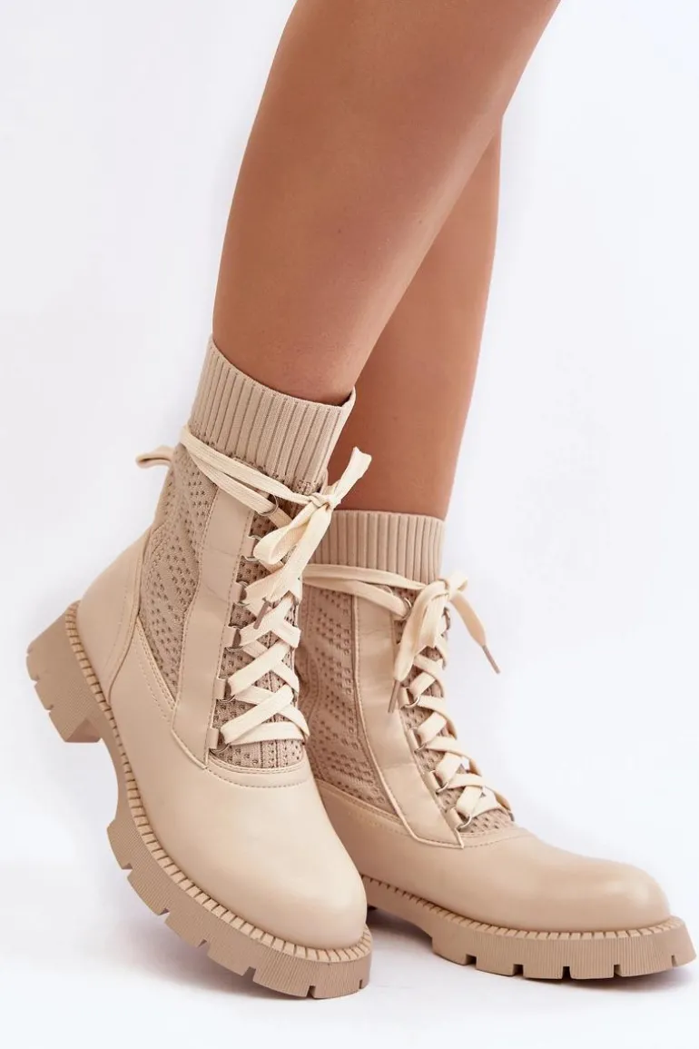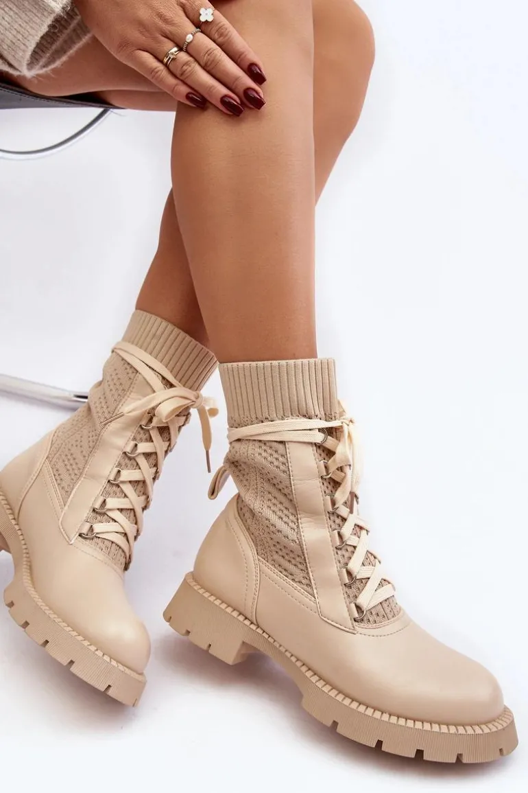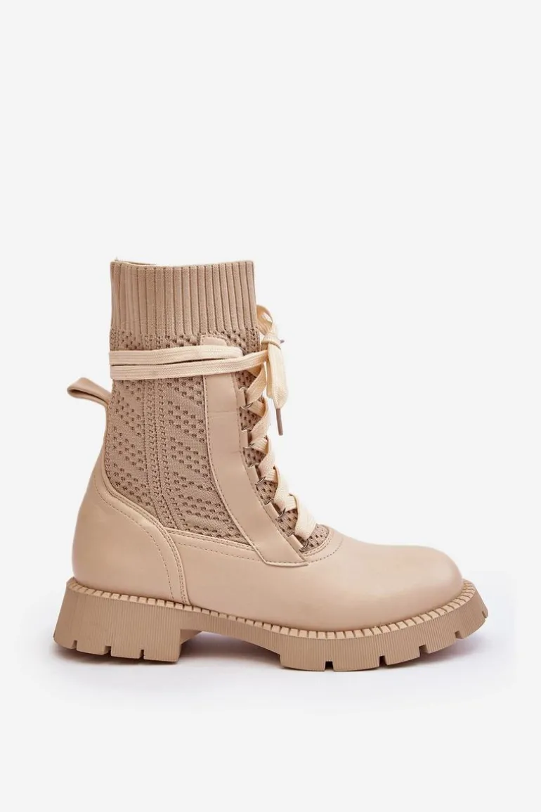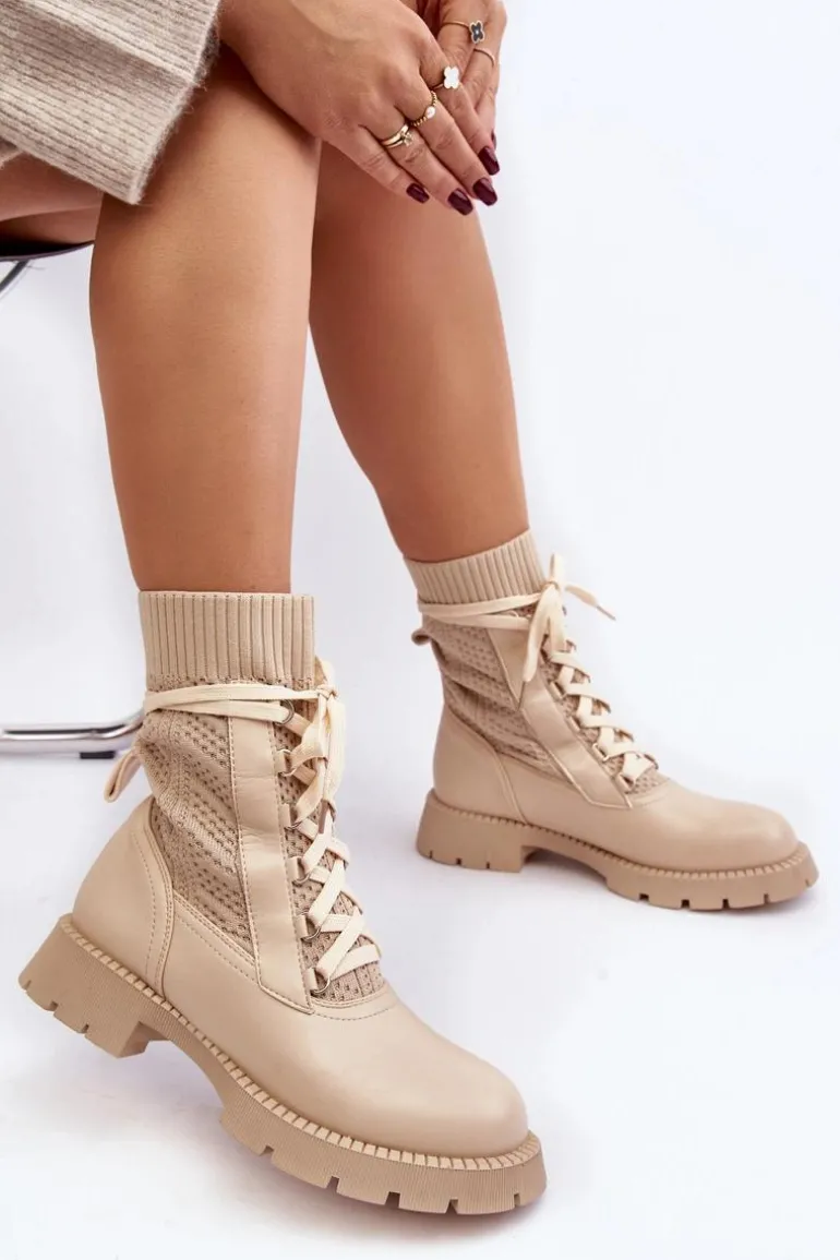 Damskie Botki Ze Skarpetą Sznurowane Jasnobeżowe Gentiana