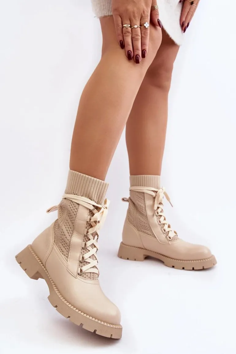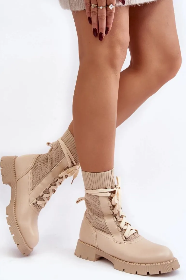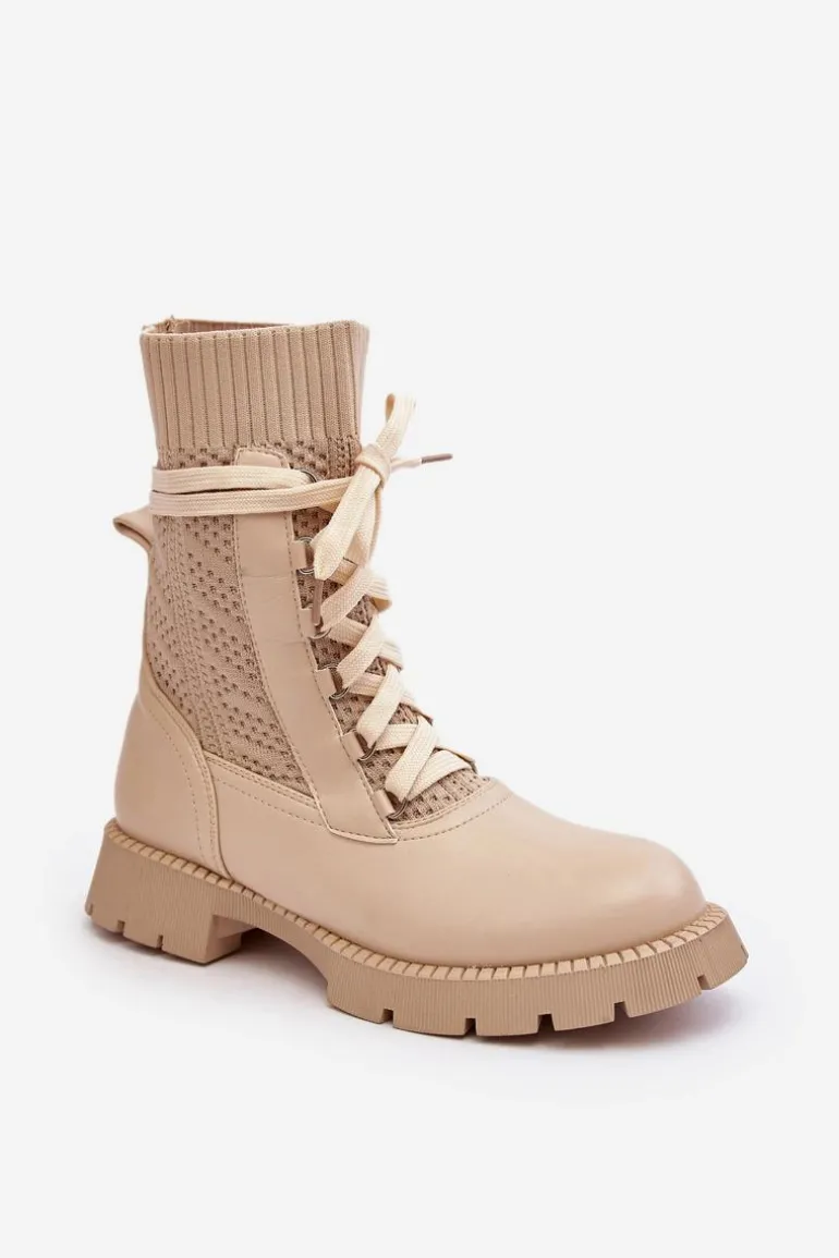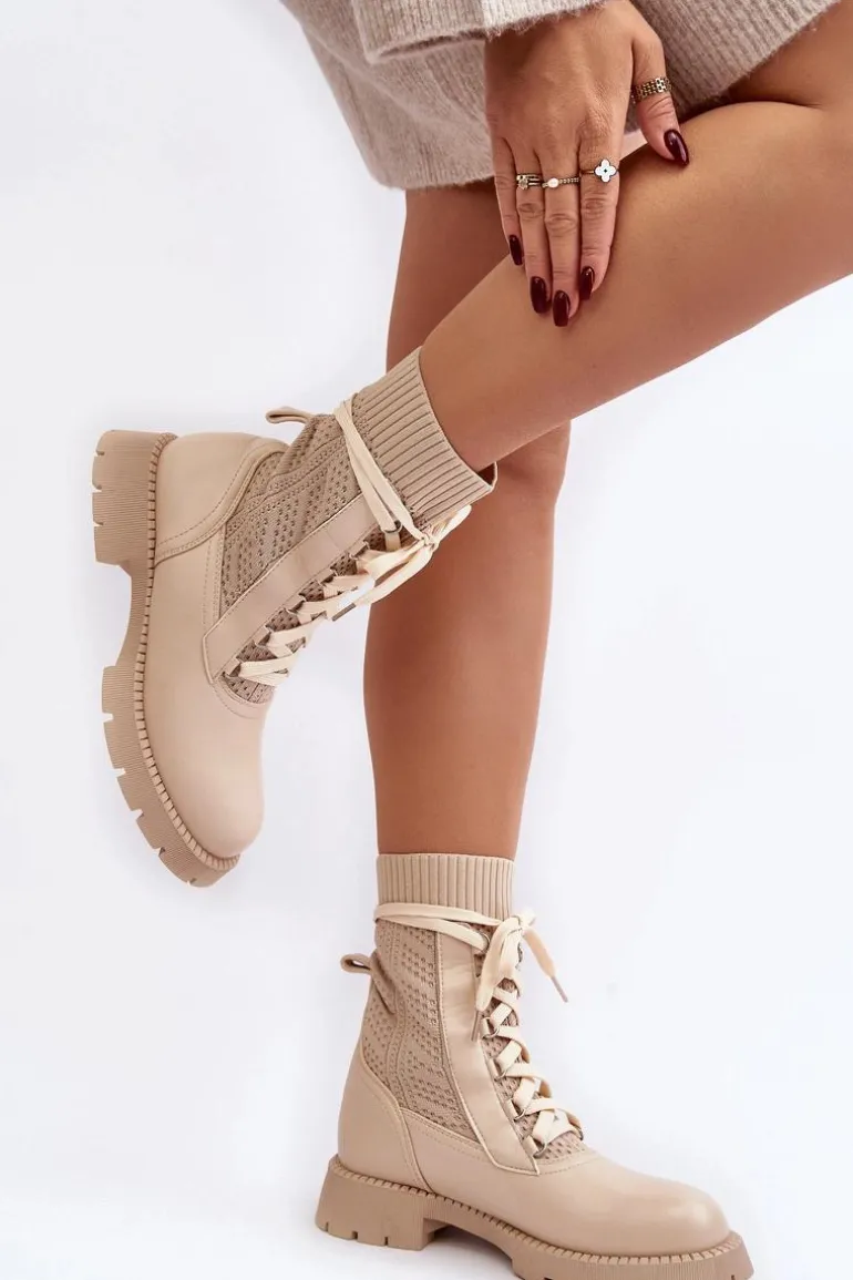Damskie Botki Ze Skarpetą Sznurowane Jasnobeżowe Gentiana