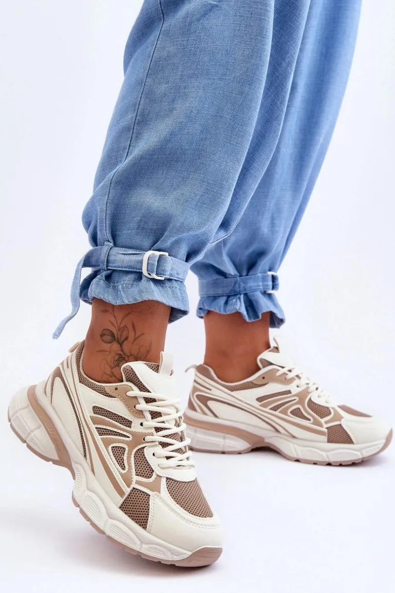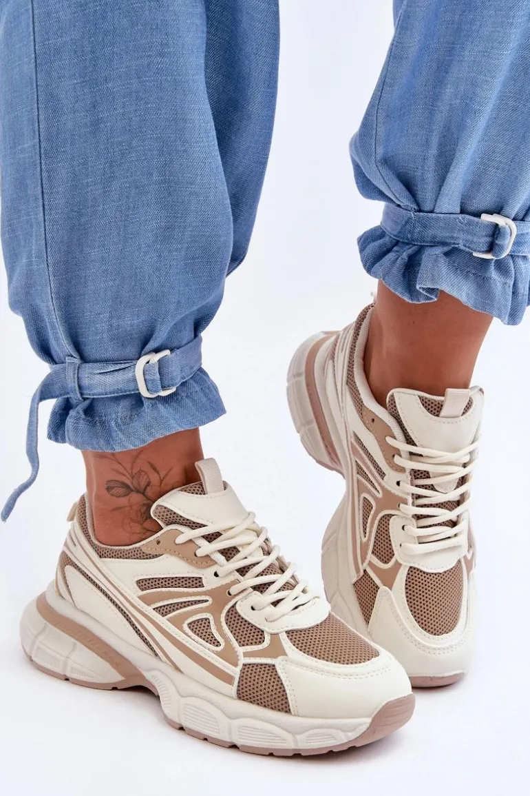 Damskie buty sportowe zostały wykonane z połączenia eko skóry oraz siateczkowego materiału tekstylnego. Model klasycznie sznurowany pozwoli na odpowiednie dopasowanie obuwia do tęgości nogi. Buty zostały osadzone na masywnej platformie z płaskim obcasem i antypoślizgową podeszwą. Wkładka z tkaniny zapewni komfortowe użytkowanie obuwia. Te modne sneakersy na pewno sprawdzą się w wielu stylizacjach! Przy wyborze rozmiaru prosimy sugerować się tabelą rozmiarów.