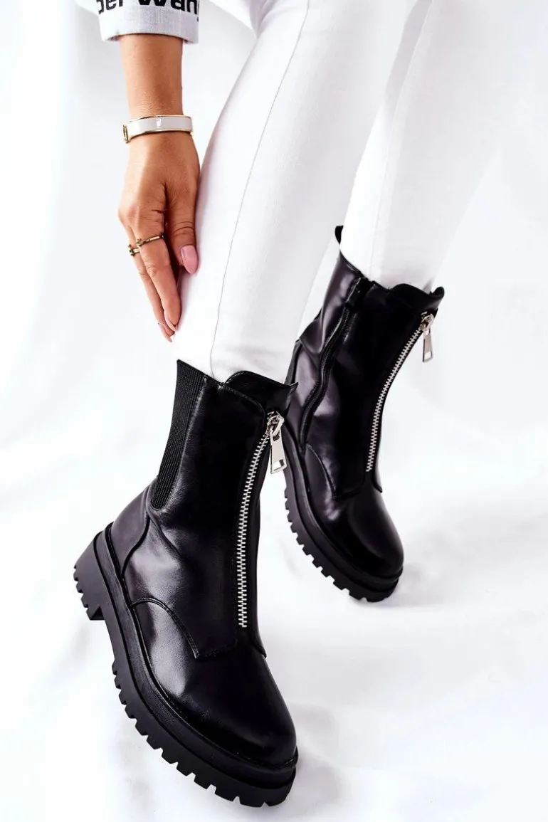Botki damskie wykonane ze skóry ekologicznej. Wnętrze ocieplone jest miłym w dotyku kocem obuwniczym. Zakładanie ułatwi wszyty suwak, a idealne dopasowanie zapewni wszyta gumka na boku. Przy wyborze rozmiaru prosimy sugerować się tabelą rozmiarów.