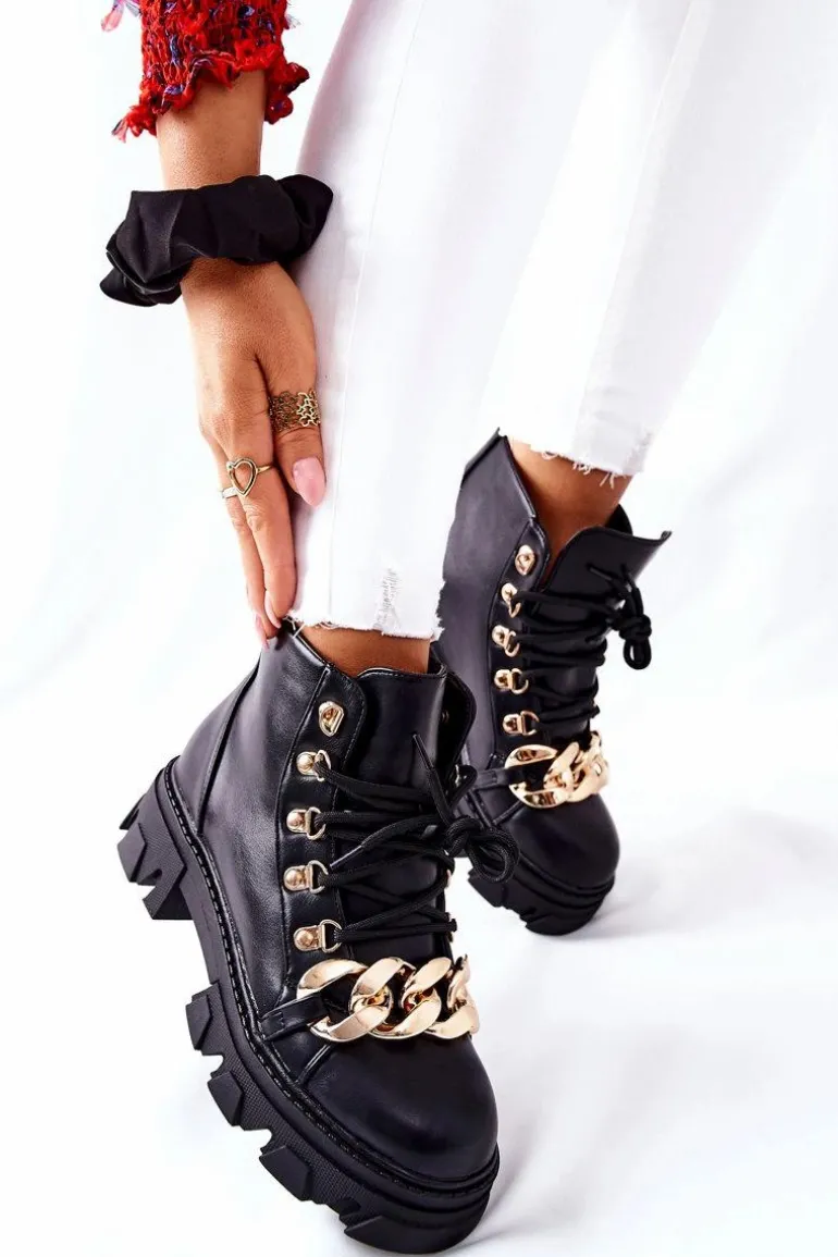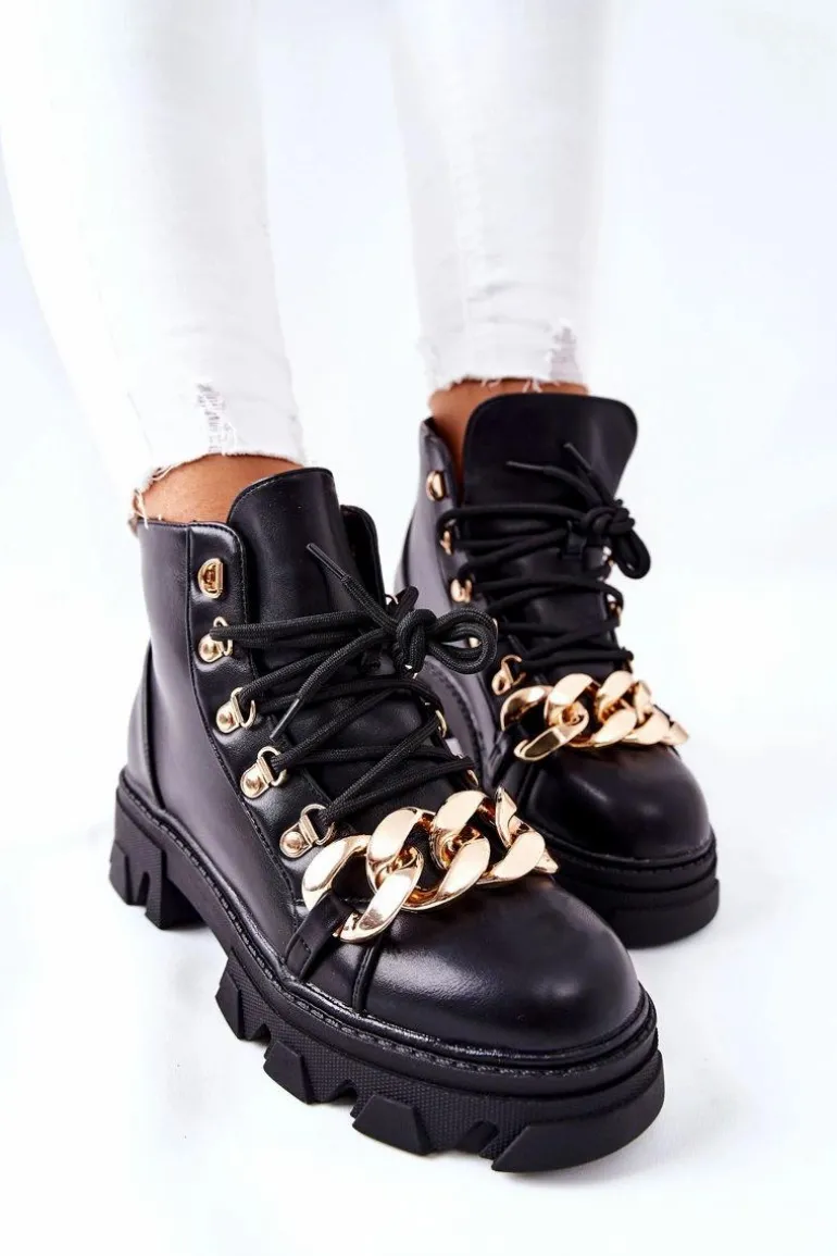 Buty, które są nieodłącznym elementem jesienno-zimowych stylizacji. Botki w całości zostały wykonane ze skóry ekologicznej. Gruba podeszwa oraz złote zdobienia w postaci łańcucha i złotych oczek, Wnętrze buta pokryte delikatnym ociepleniem w postaci koca obuwniczego. Przy wyborze rozmiaru prosimy sugerować się tabelą rozmiarów.