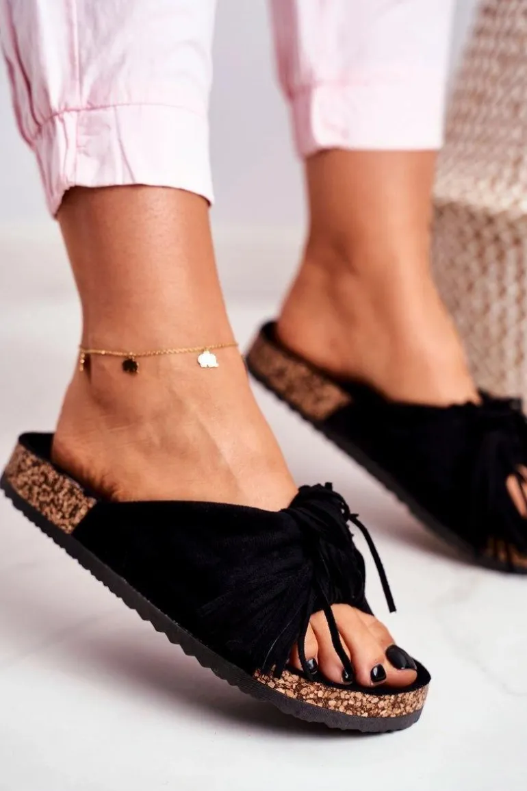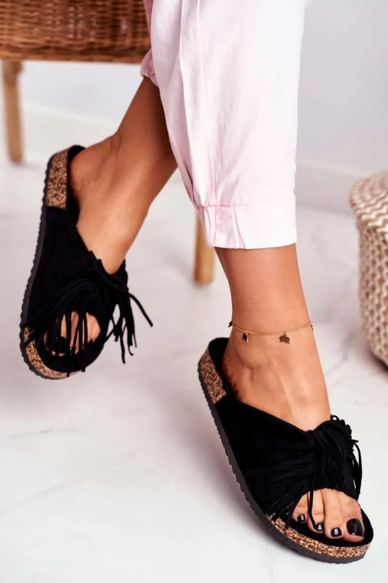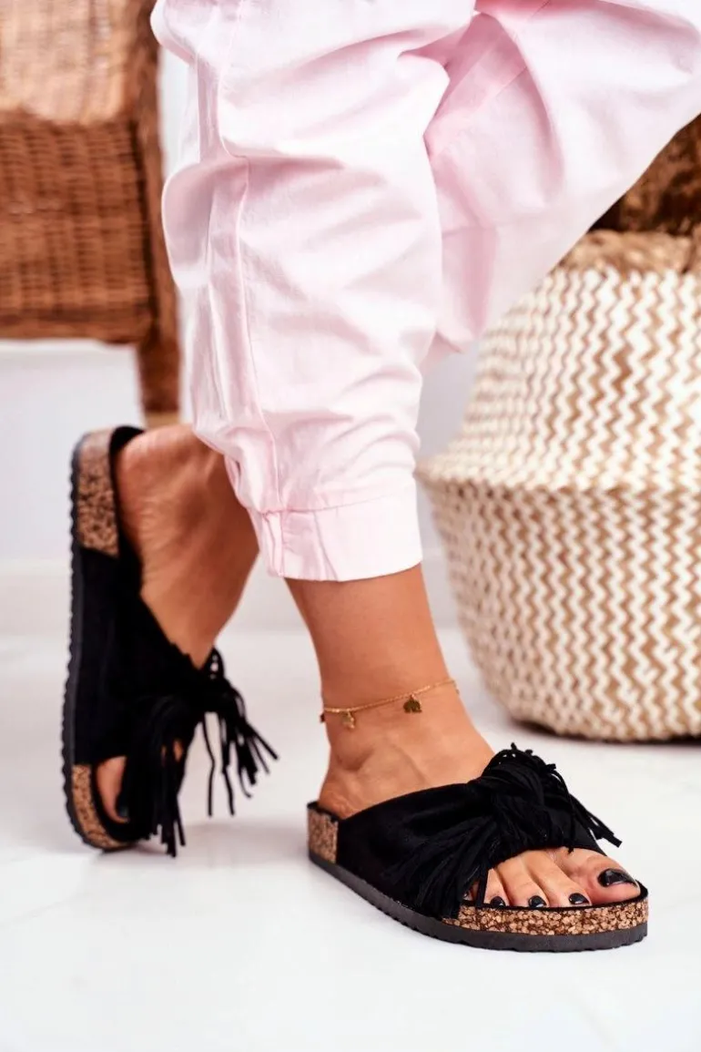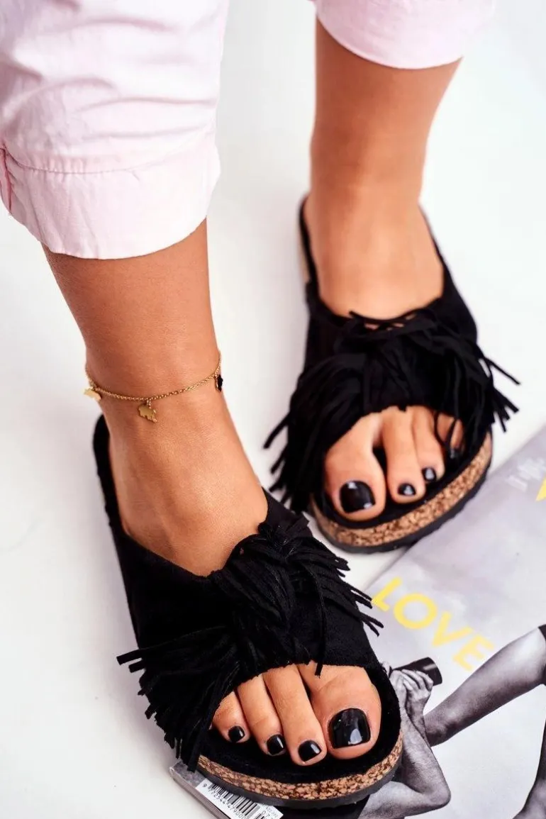 Damskie Czarne Klapki Na Korku Frędzle Marina