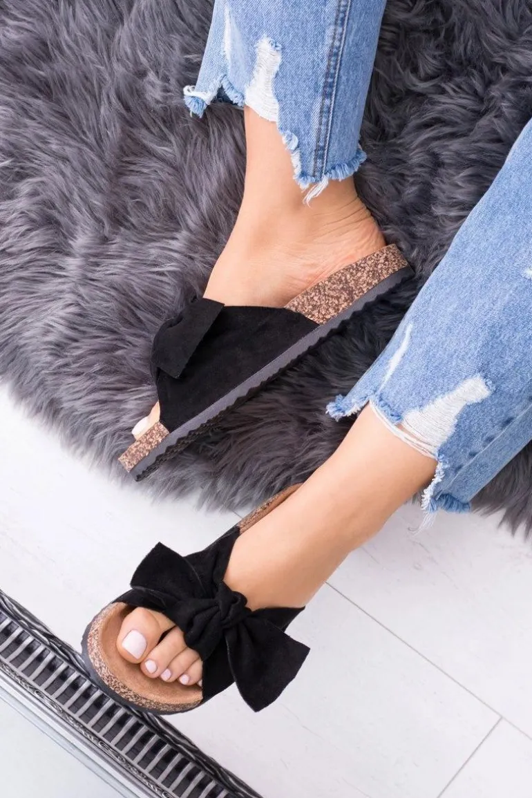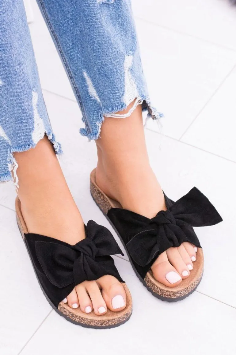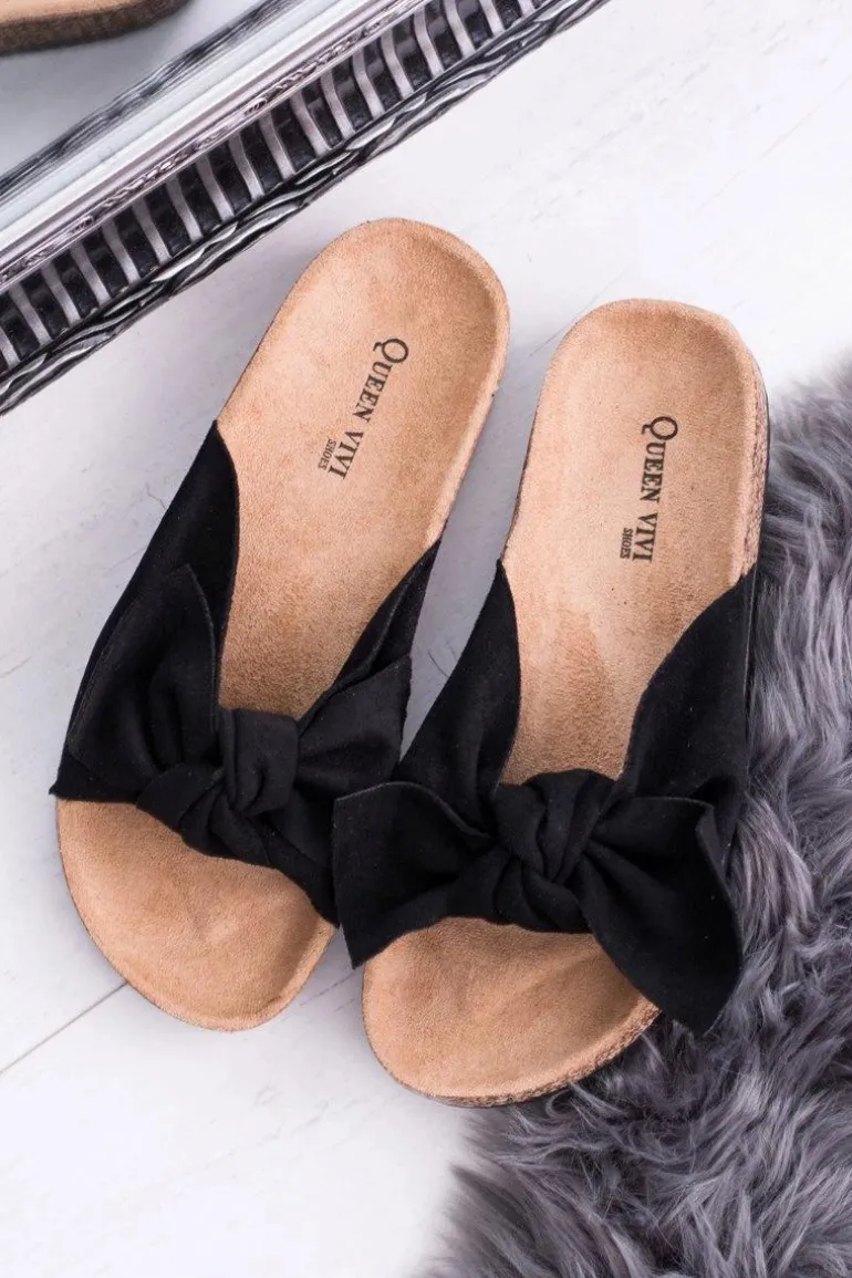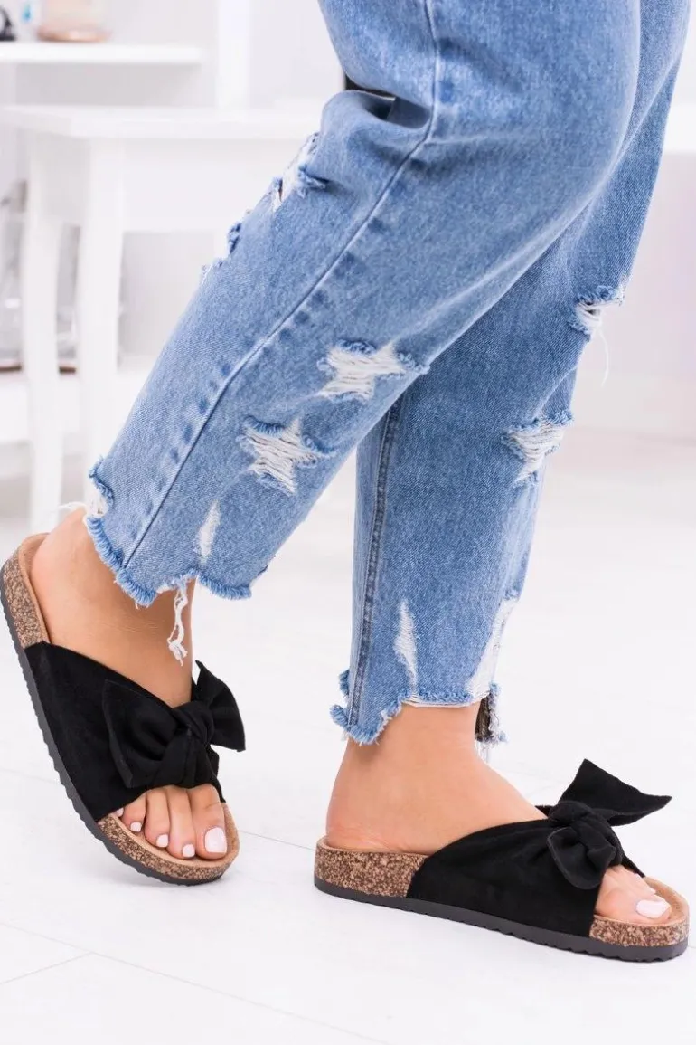 Damskie Czarne Klapki Na Korku Kokarda Dominica