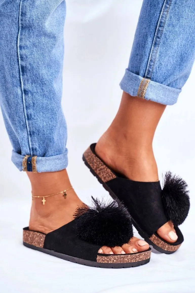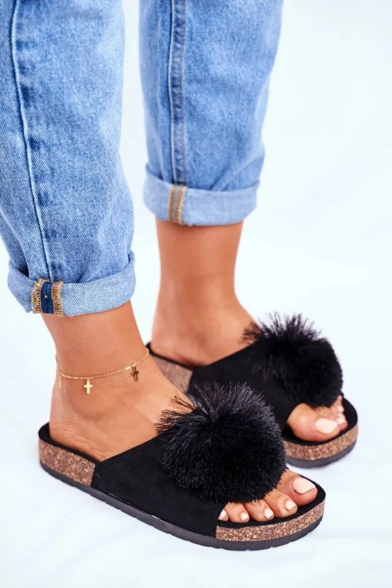 Damskie Czarne Klapki Na Korku z Pomponem Galaxo