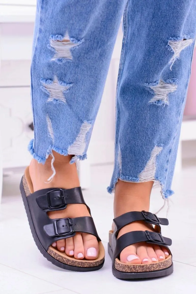 Damskie Czarne Klapki Z Klamrami Na Korku Ferone