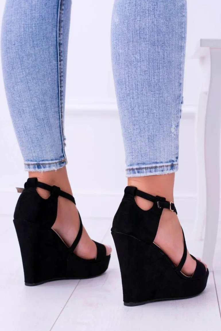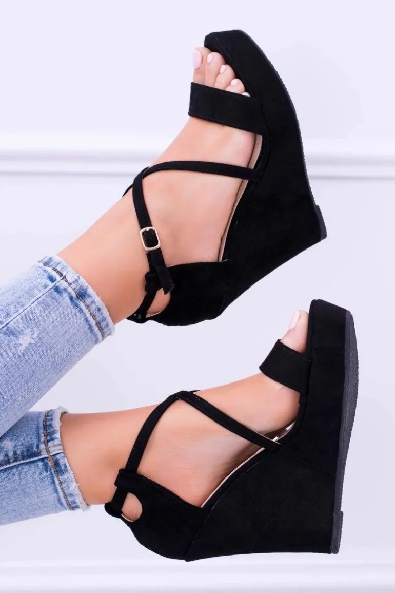 Damskie Czarne Zamszowe Sandały Na Koturnie Eline