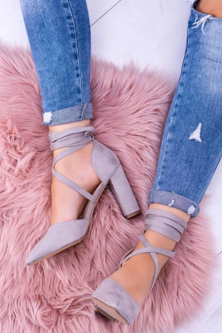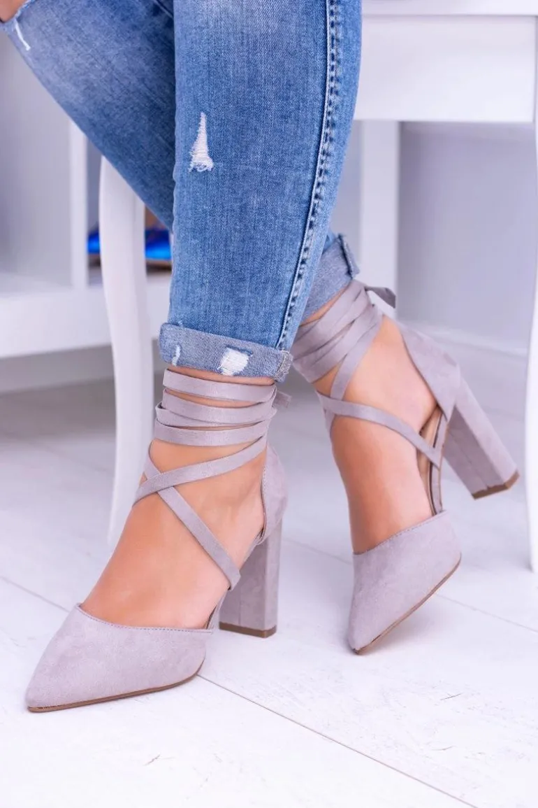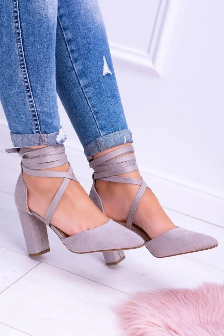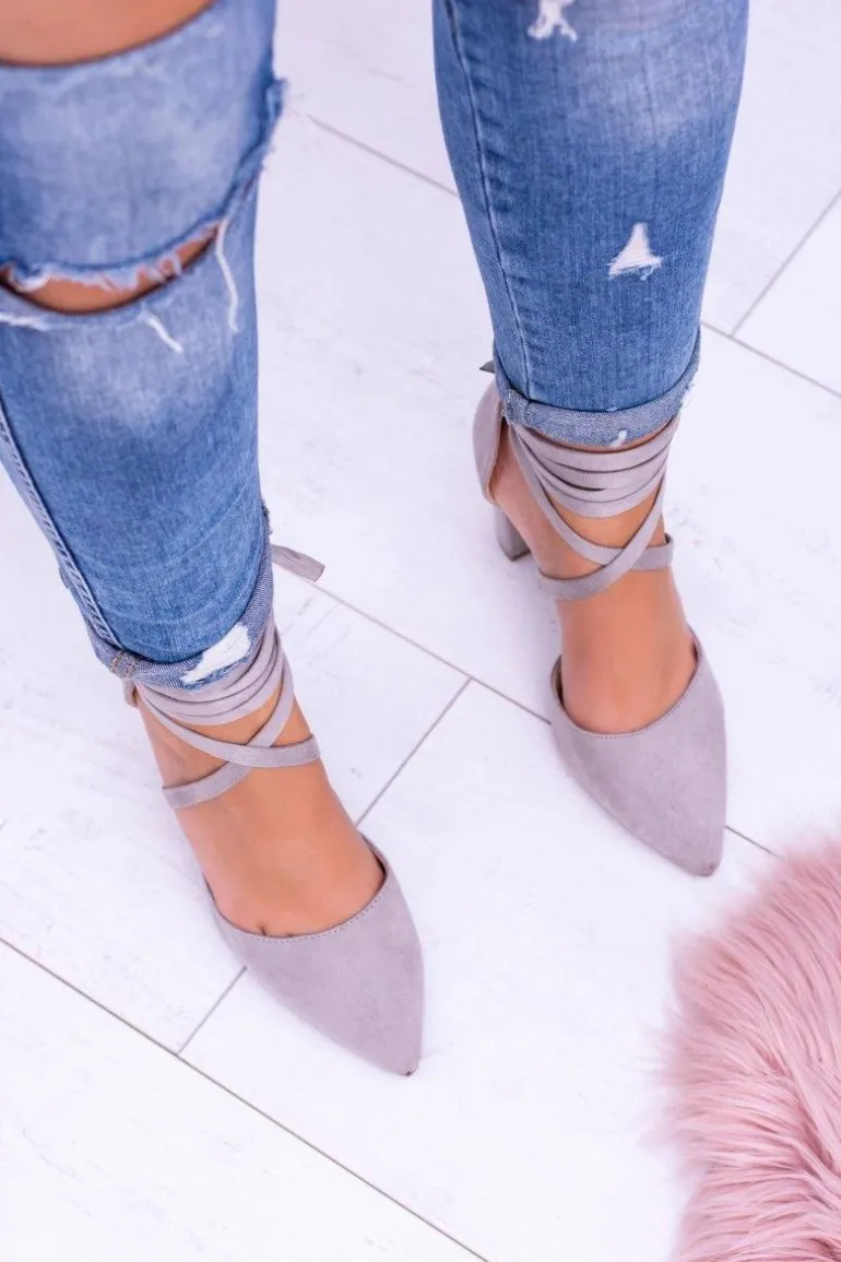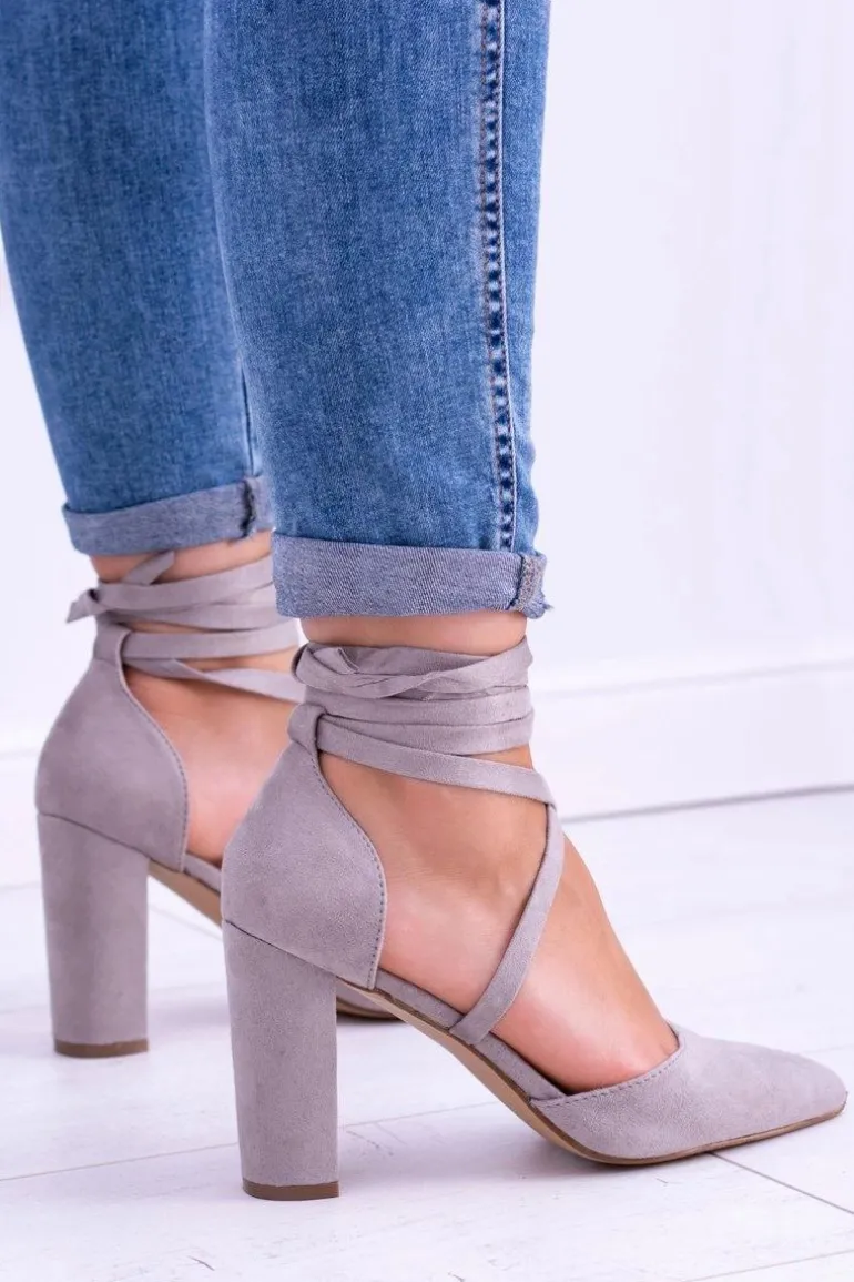 Damskie Czółenka Na Słupku Wiązane Szare Demmi