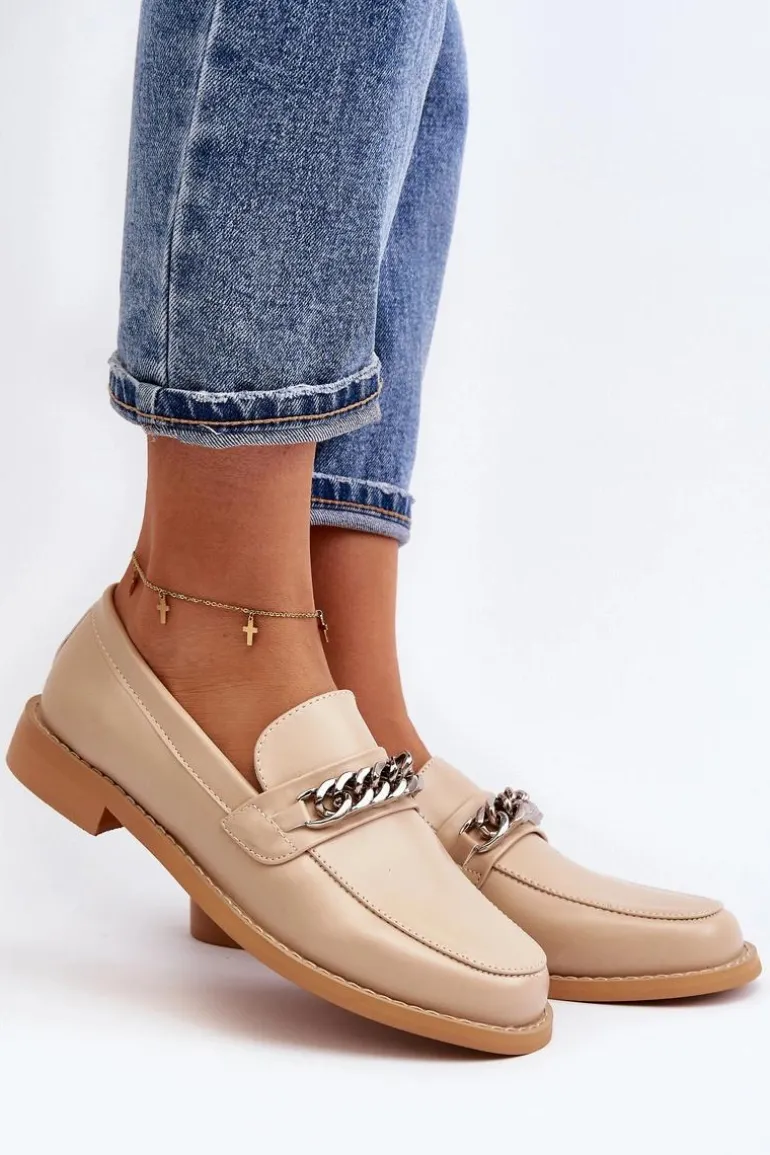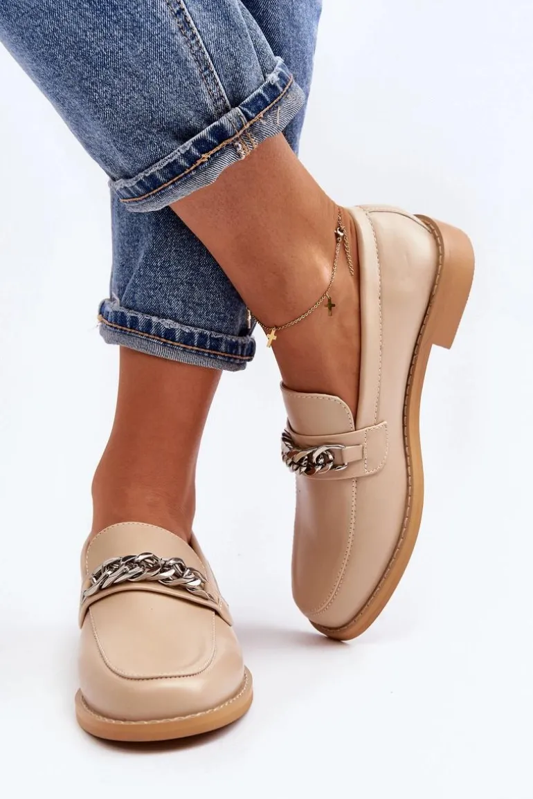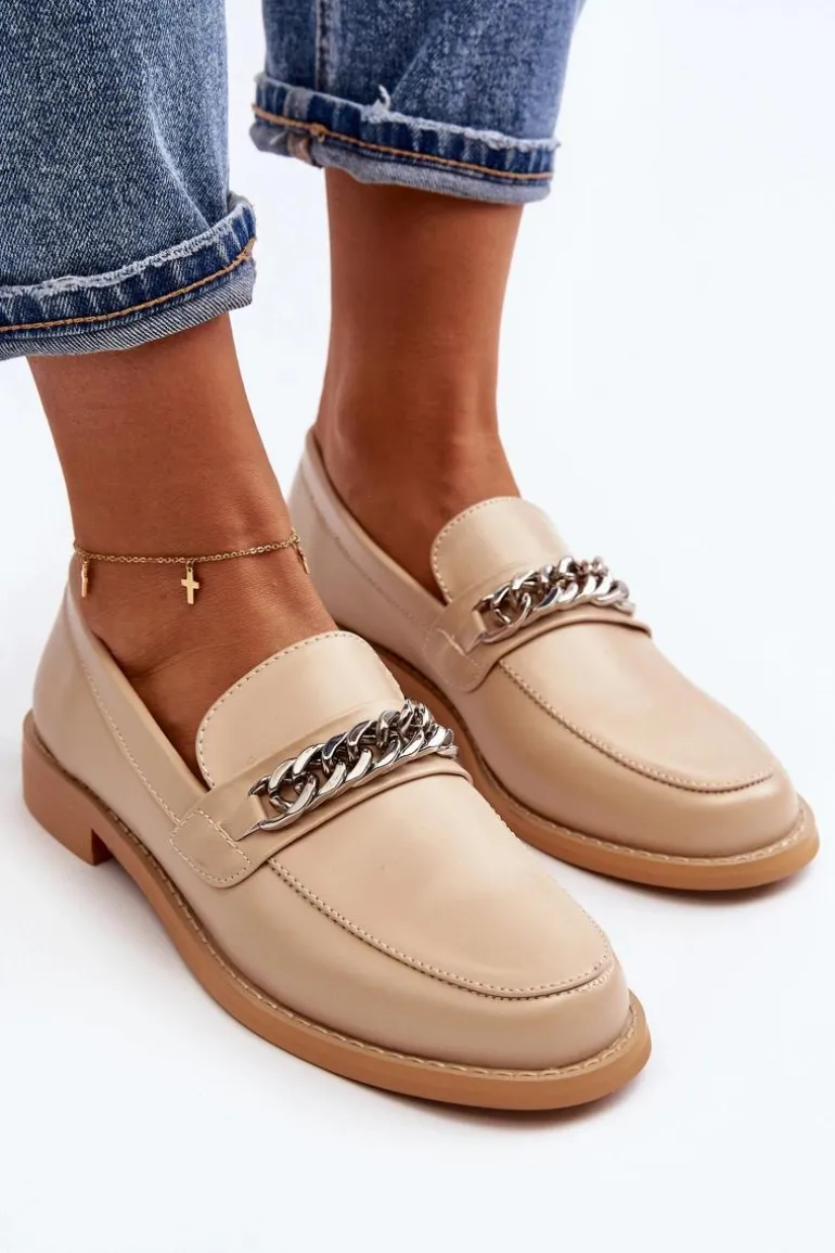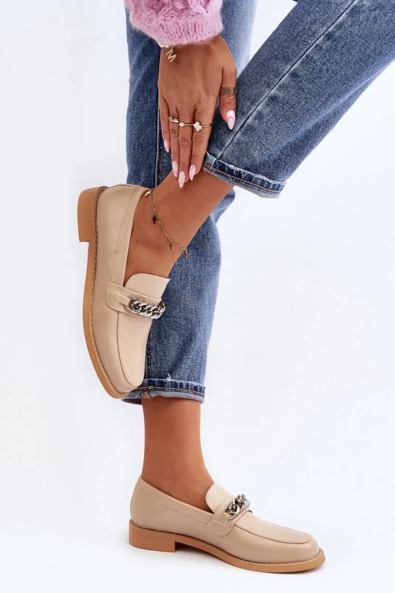 Klasyczne, wsuwane mokasyny damskie z pewnością sprawdzą się w wielu stylizacjach! Wykonane z eko skóry. Osadzone na płaskim obcasie, dzięki któremu są wygodne w użytkowaniu. Model ten posiada ozdobny łańcuch z przodu. Koniecznie powinnaś je mieć w swojej wiosennej garderobie! Przy wyborze rozmiaru prosimy sugerować się tabelą rozmiarów.