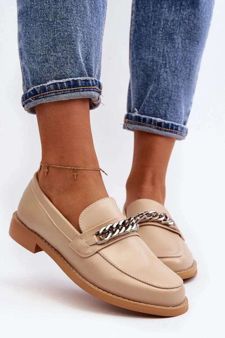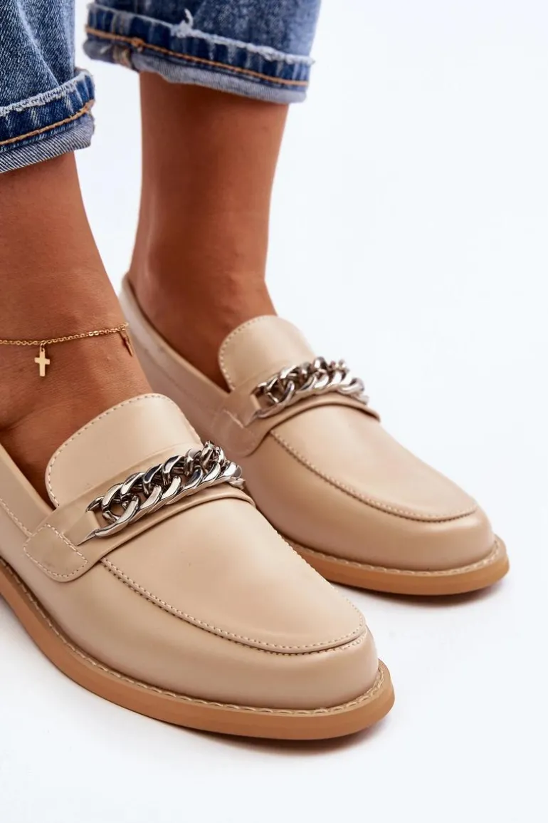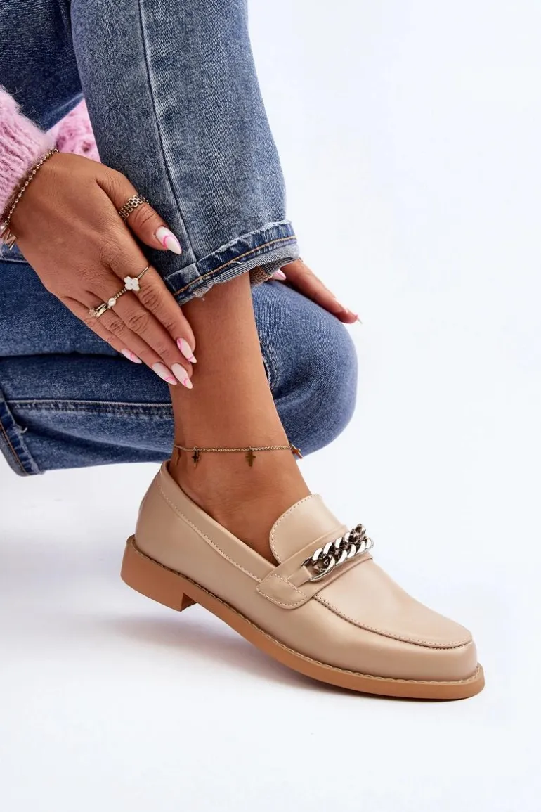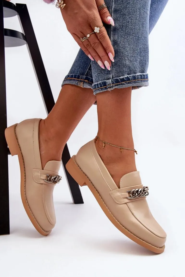Klasyczne, wsuwane mokasyny damskie z pewnością sprawdzą się w wielu stylizacjach! Wykonane z eko skóry. Osadzone na płaskim obcasie, dzięki któremu są wygodne w użytkowaniu. Model ten posiada ozdobny łańcuch z przodu. Koniecznie powinnaś je mieć w swojej wiosennej garderobie! Przy wyborze rozmiaru prosimy sugerować się tabelą rozmiarów.