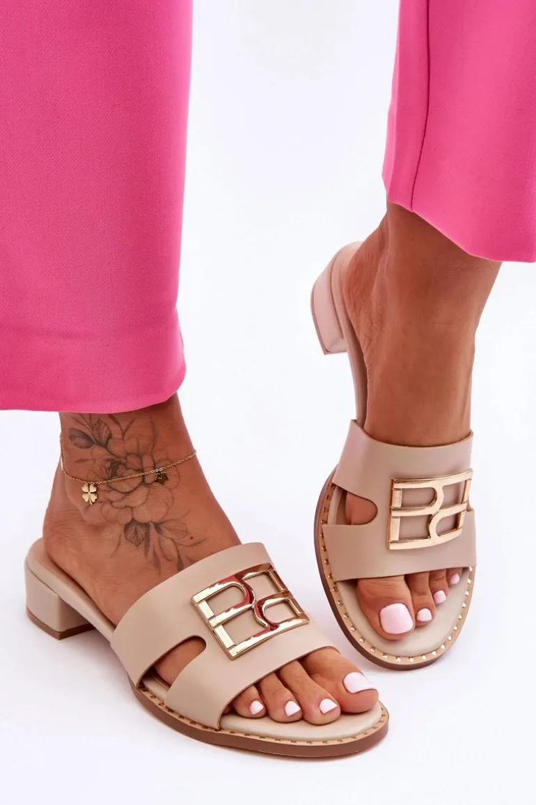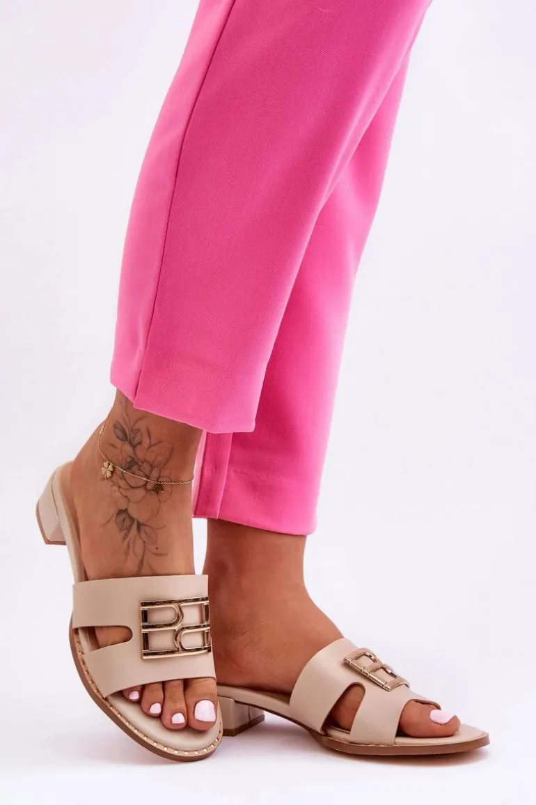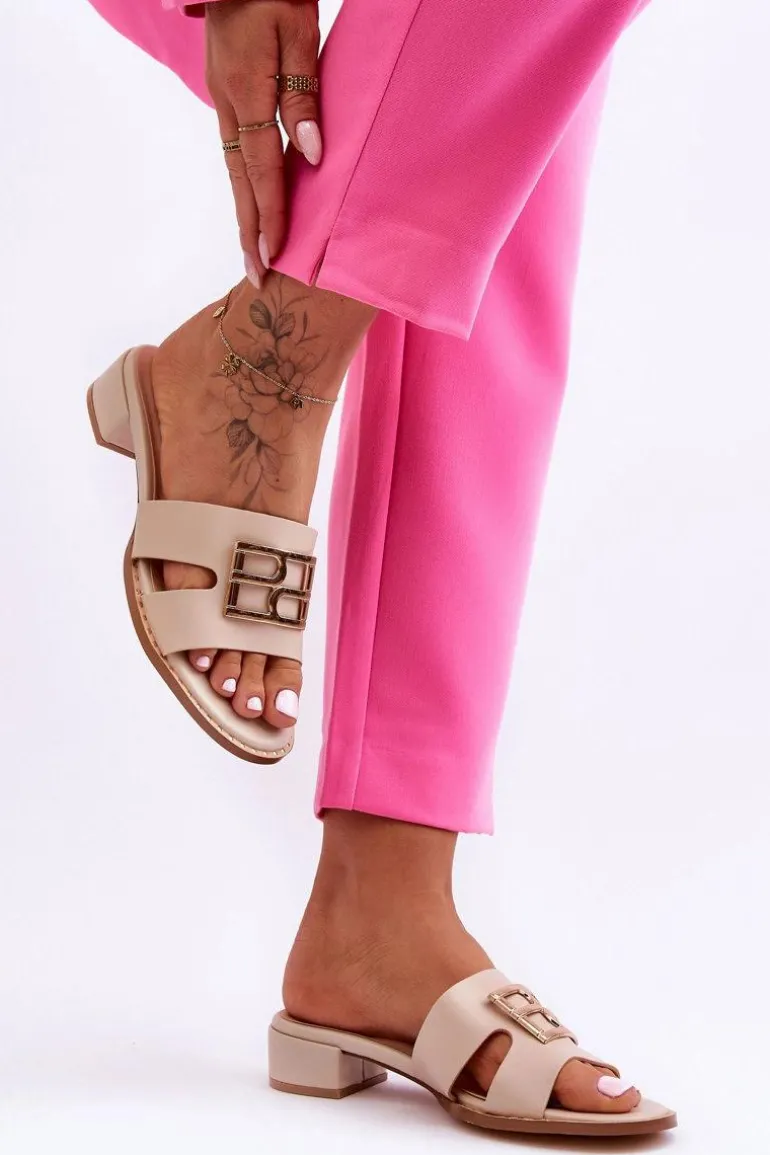 Eleganckie, damskie klapki zostały wykonane z eko skóry. Posiadają ozdobę na przodzie wykonaną z tworzywa sztucznego. Klapki osadzono na niskim obcasie. Wkładka jest niezwykle miękka i wygodna w użytkowaniu. Nosek jest odkryty i delikatnie zaokrąglony. Dodatkowo przy podeszwie klapki zostały ozdobione ćwiekami. Przy wyborze rozmiaru prosimy sugerować się tabelą rozmiarów.