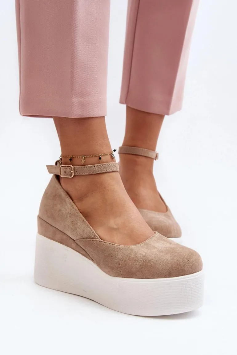 Espadryle damskie osadzone na platformie wraz z koturnem. Wykonane z eko zamszu. Noski zakryte, zaokrąglone. Zapinane na regulowany pasek ze sprzączką. Model ten posiada miękką wkładkę z eko skóry, która zapewni wygodę podczas użytkowania. Idealne do wiosenno-letnich stylizacji! Przy wyborze rozmiaru prosimy sugerować się tabelą rozmiarów.