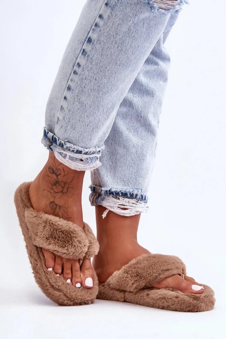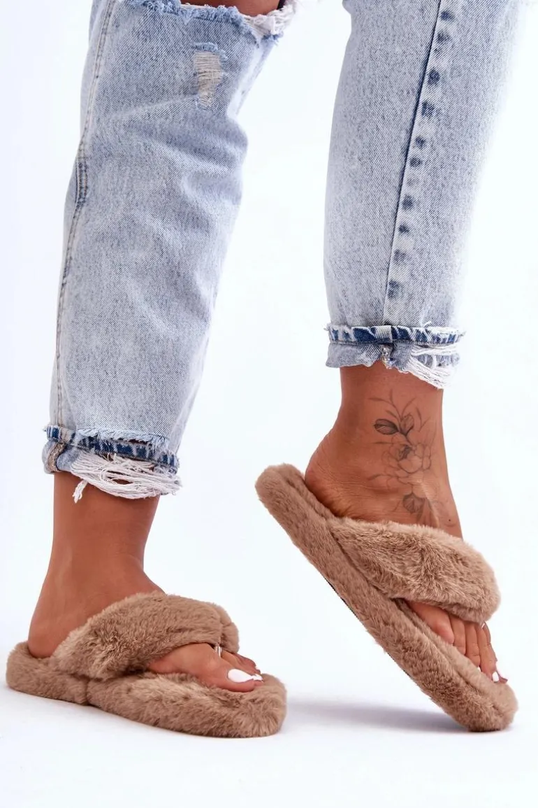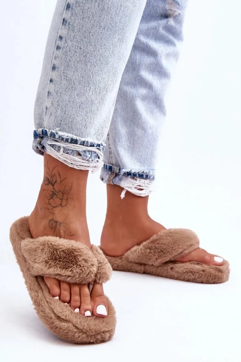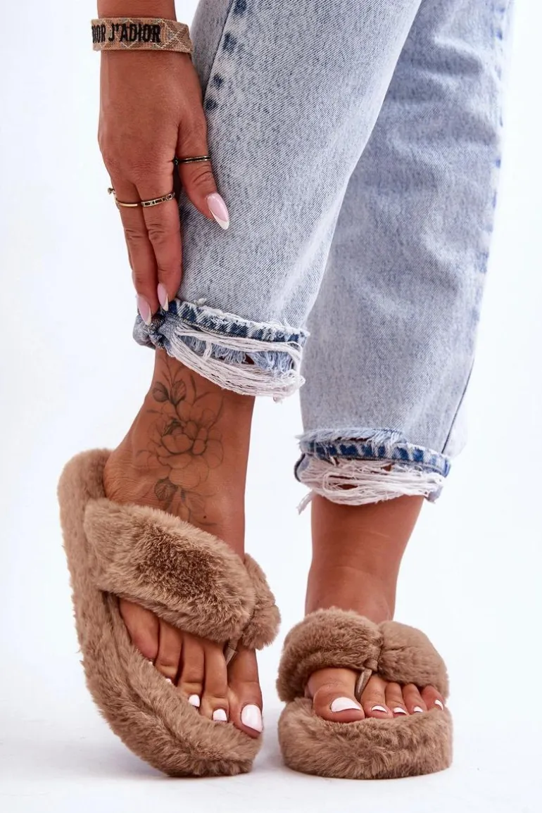 Damskie Futrzane Klapki Papcie Brązowe Elma