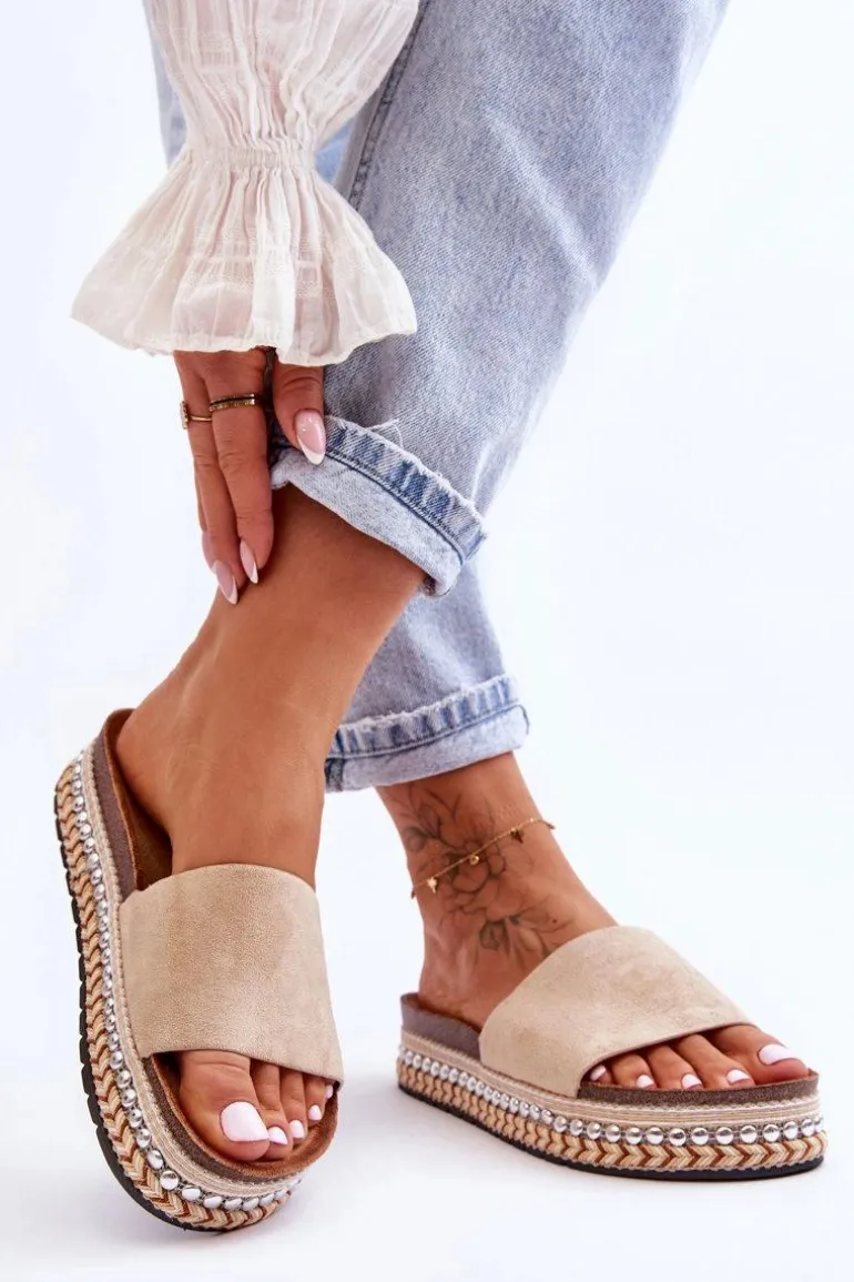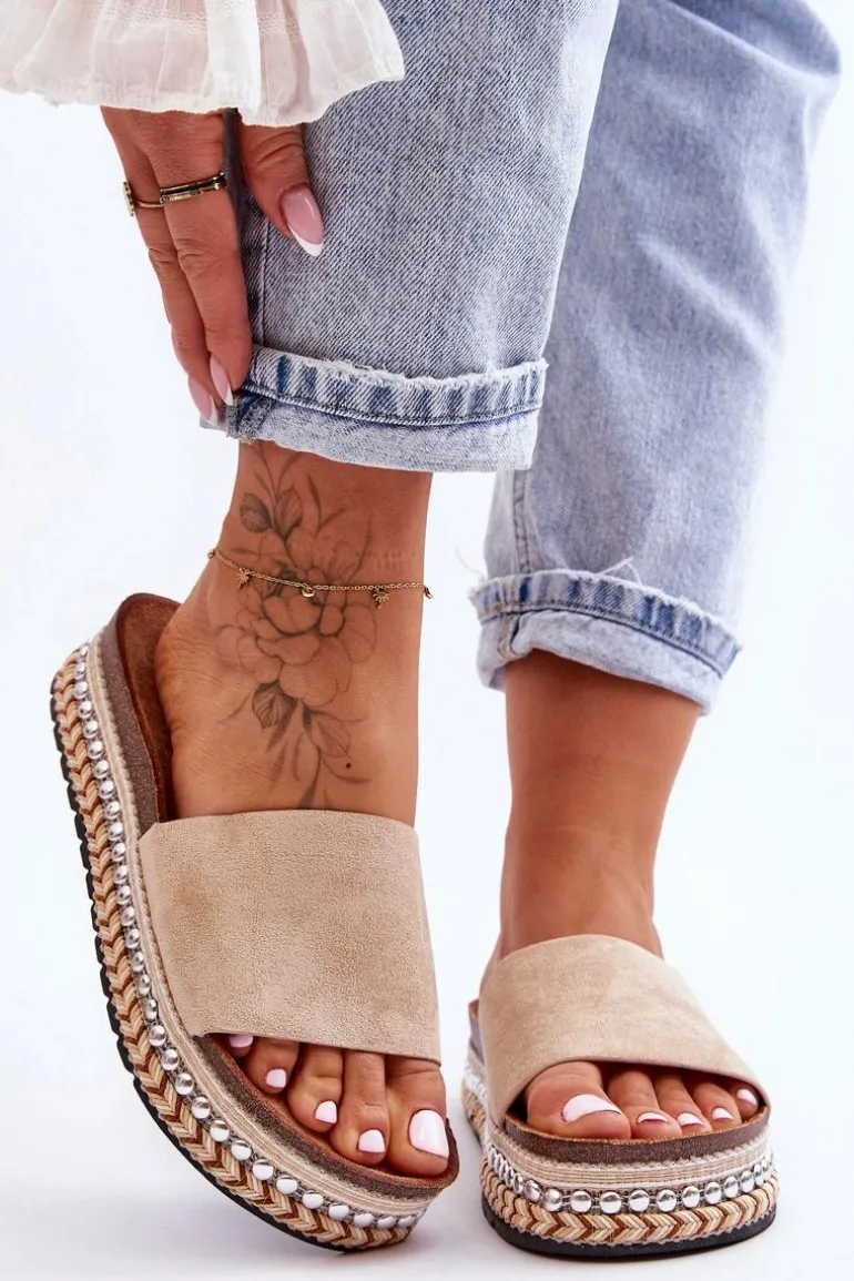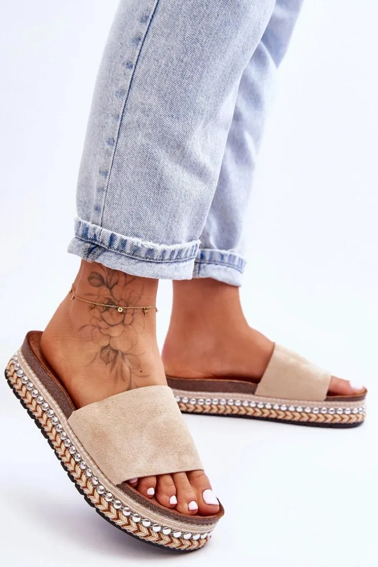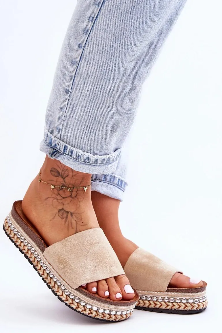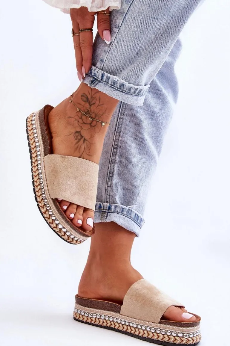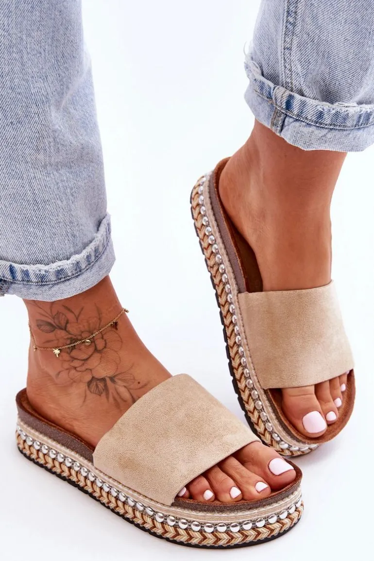 Damskie klapki zostały osadzone na masywnej platformie ze zdobieniami w postaci sznureczków oraz ćwieków. Profilowana wkładka jest wykonana z przyjemnego w dotyku eko zamszu. Platforma została ozdobiona sznureczkami oraz ćwiekami. Nosek jest odkryty i zaokrąglony. Ten model powinien być Twój! Przy wyborze rozmiaru prosimy sugerować się tabelą rozmiarów.