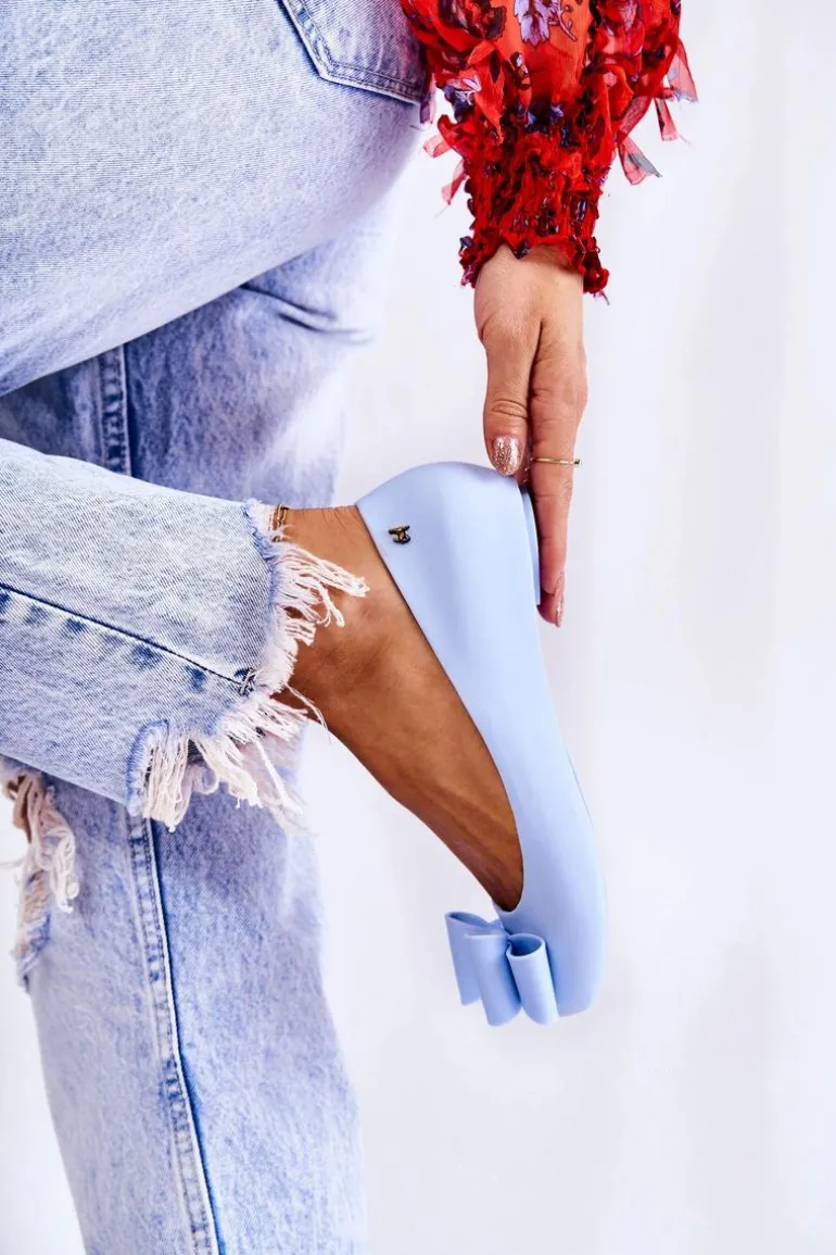 Wyjątkowe baleriny z ozdobną kokardą na przodzie. Dodatkowo na zaokrąglonym nosku znajduje się delikatne wycięcie. Buty zostały wykonane z gumowego tworzywa. Baleriny osadzone są na płaskim obcasie z antypoślizgową podeszwą. Miękka wkładka zapewni komfort podczas użytkowania. Z boku cholewki znajduje się ozdobny element. Te baleriny świetnie sprawdzą się na różnego rodzaju uroczystościach. Przy wyborze rozmiaru prosimy sugerować się tabelą rozmiarów.