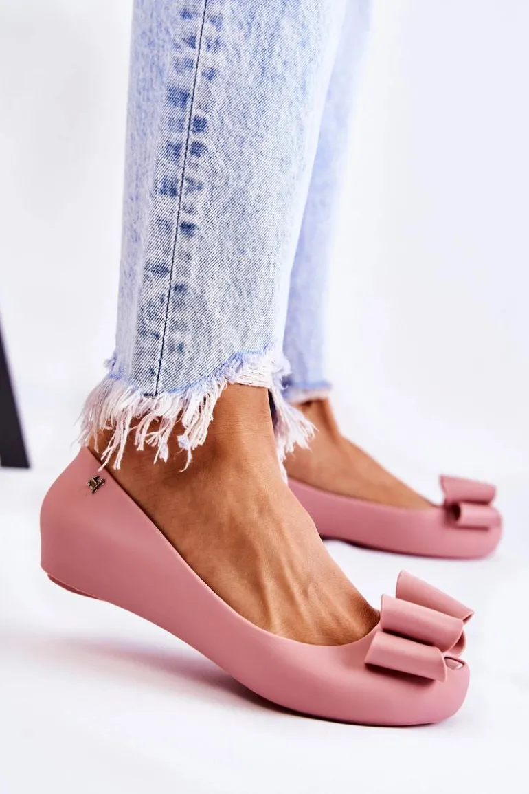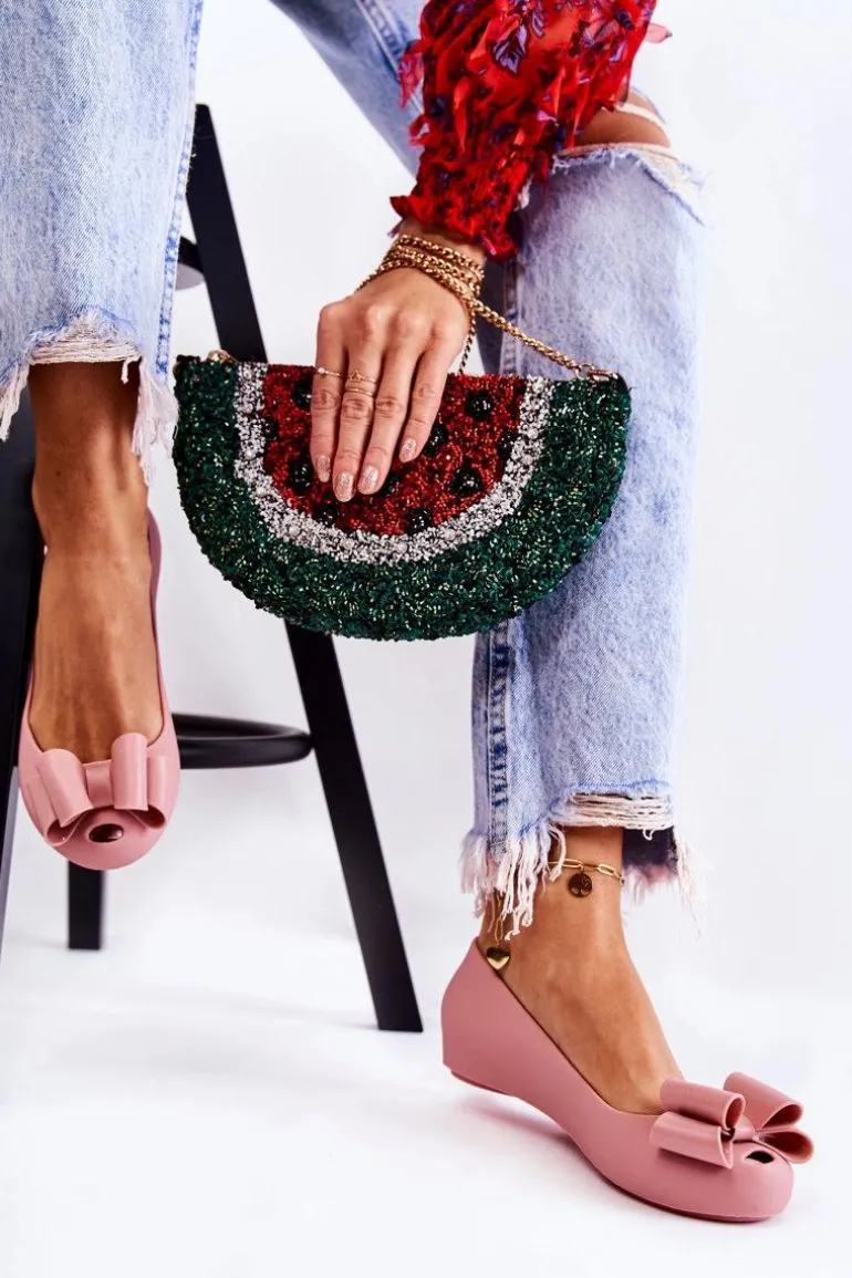 Wyjątkowe baleriny z ozdobną kokardą na przodzie. Dodatkowo na zaokrąglonym nosku znajduje się delikatne wycięcie. Buty zostały wykonane z gumowego tworzywa. Baleriny osadzone są na płaskim obcasie z antypoślizgową podeszwą. Miękka wkładka zapewni komfort podczas użytkowania. Z boku cholewki znajduje się ozdobny element. Te baleriny świetnie sprawdzą się na różnego rodzaju uroczystościach. Przy wyborze rozmiaru prosimy sugerować się tabelą rozmiarów.