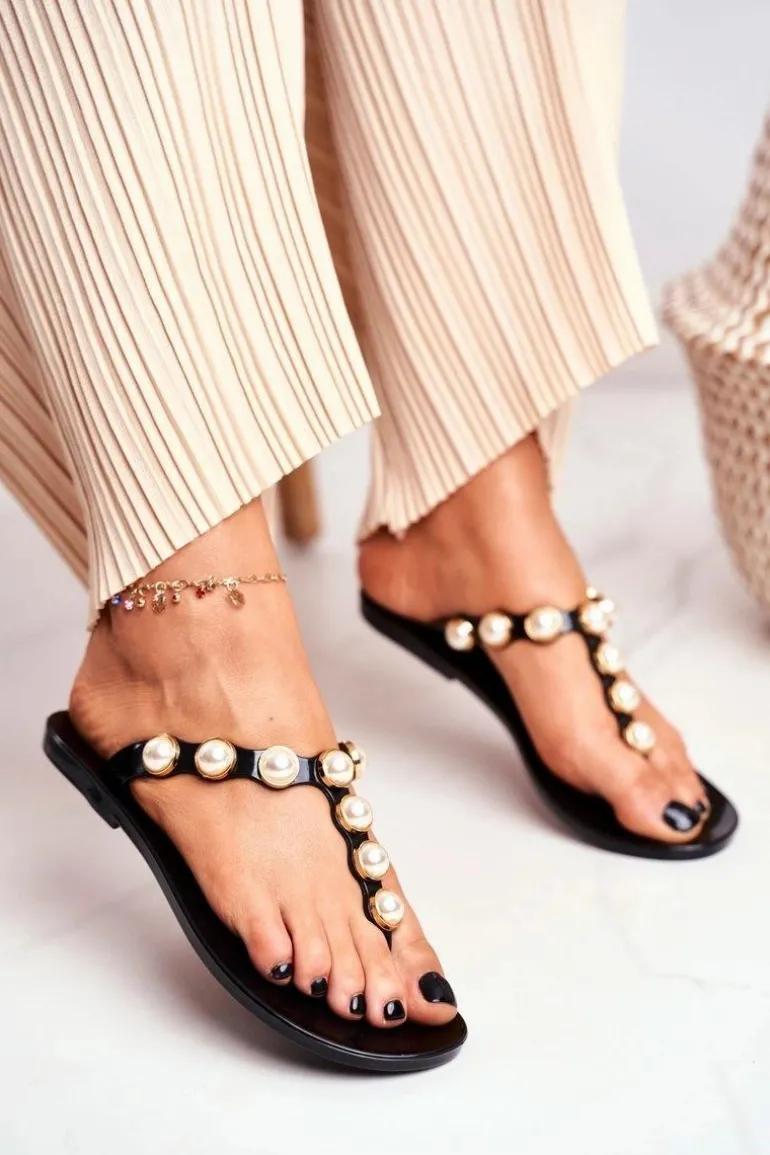 Damskie Gumowe Klapki Czarne Japonki Perełki Edith