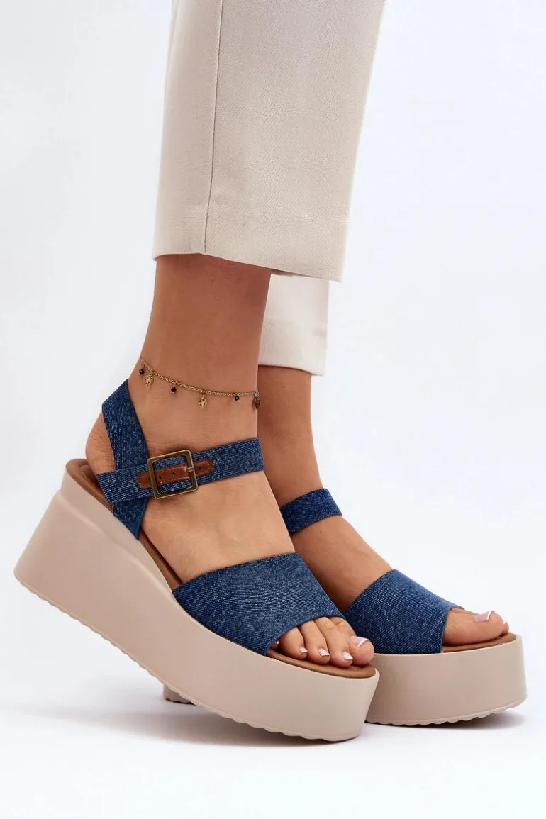Damskie Jeansowe Sandały Na Koturnie Niebieskie Geferia
