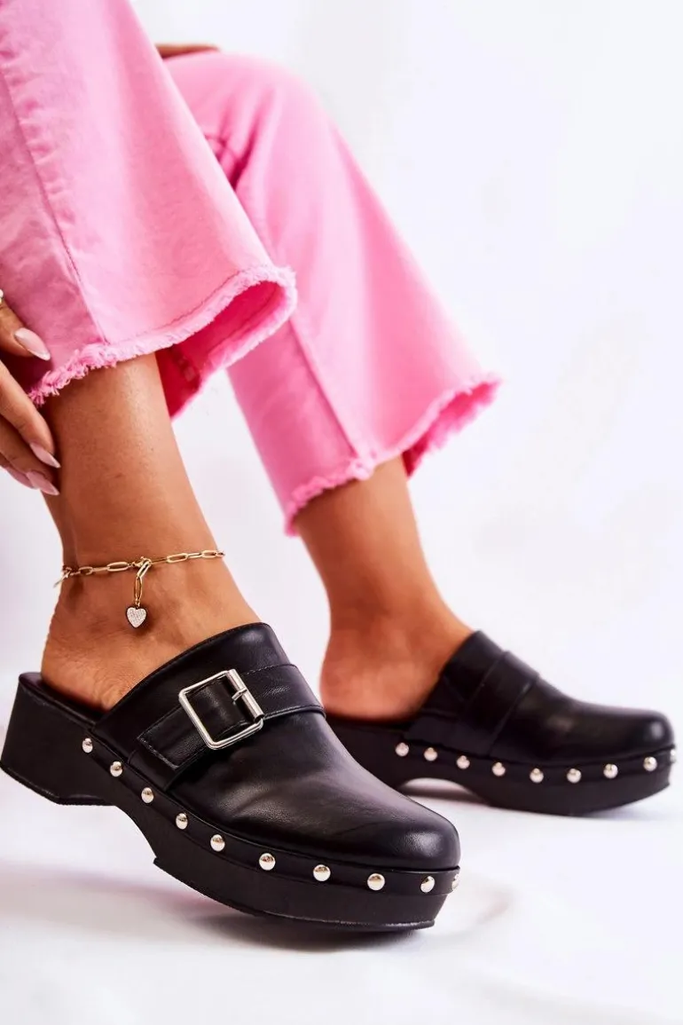 Klasyczny model damskich chodaków osadzony na obcasie i platformie. Model wsuwany. Przyozdobione na przodzie paskiem ze sprzączką. Dodatkowo wokół podeszwy znajdują się ozdobne ćwieki. Podeszwa wykonana z gumowego tworzywa, antypoślizgowa. Model ten dodatkowo posiada gumkę, dzięki której but będzie odpowiednio dopasowany do tęgości nogi. Wkładka wykonana z eko skóry. Model ten świetnie sprawdzi się na co dzień. Nosek zakryty, zaokrąglony. Przy wyborze rozmiaru prosimy sugerować się tabelą rozmiarów.