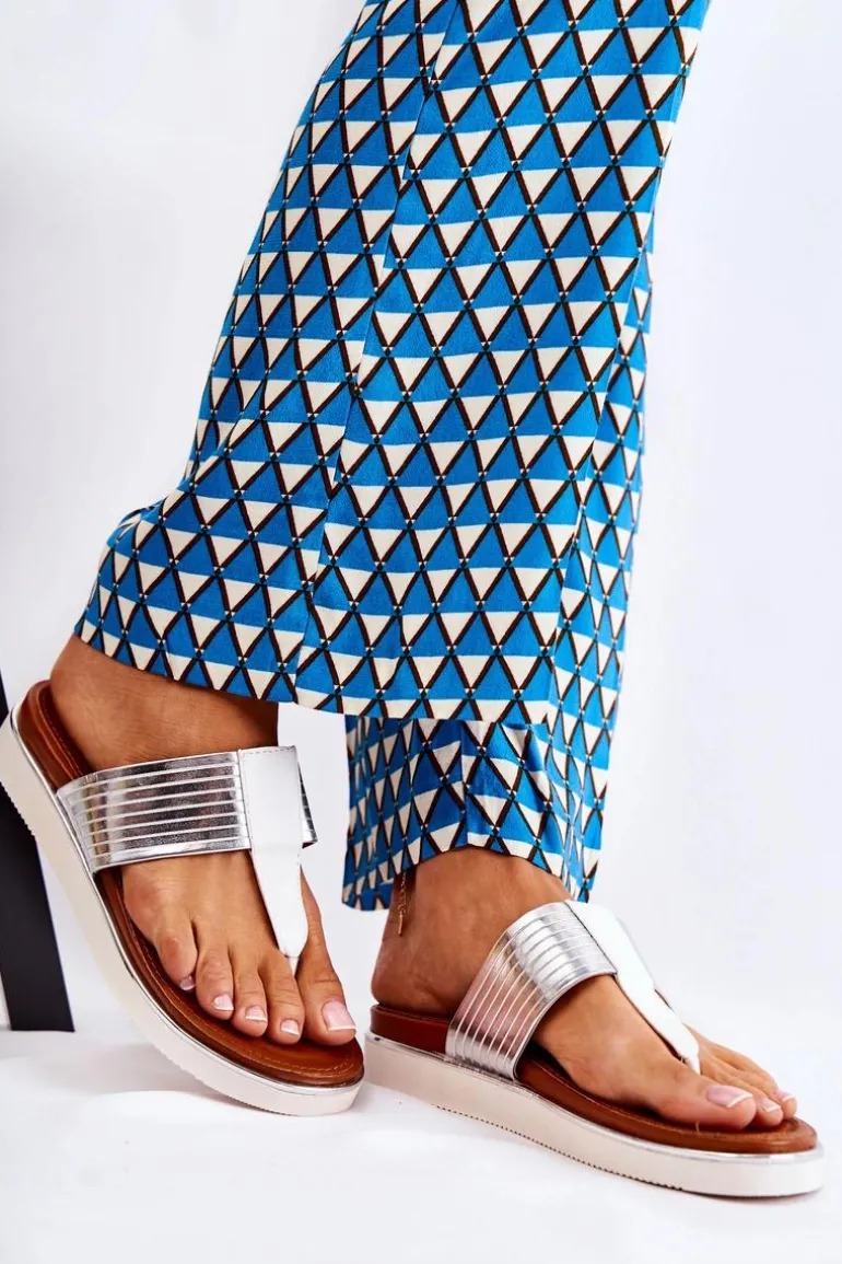 Klasyczne klapki o fasonie japonek. Wykonane z wierzchu z eko skóry. Japonki osadzone na niewysokiej platformie. Podeszwa wykonana z tworzywa sztucznego. Nosek odkryty, zaokrąglony. Miękka wkładka wykonana z eko skóry zapewni komfort oraz wygodę w użytkowaniu. Świetny model na co dzień.