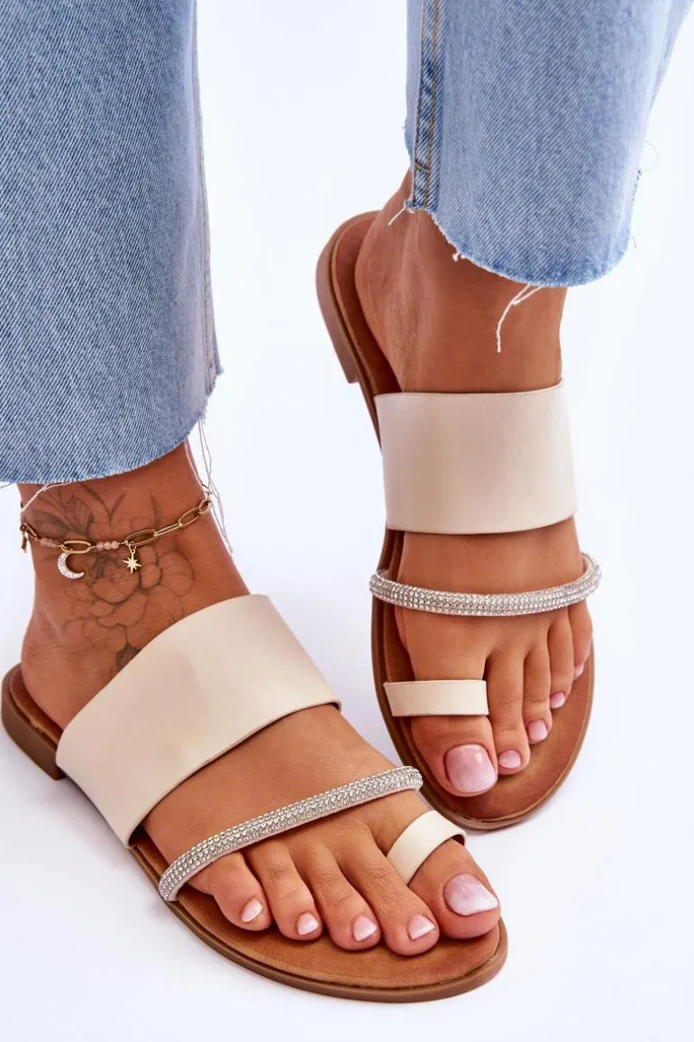 Klasyczne klapki o fasonie japonek zostały wykonane z eko skóry. Posiadają ozdobny paseczek z mieniącymi się dżetami imitującymi cyrkonie. Osadzone na płaskim obcasie z podeszwą z tworzywa sztucznego. Model ten świetnie sprawdzi się do wielu letnich stylizacji. Japonki posiadają miękką, eko skórzaną wkładkę.