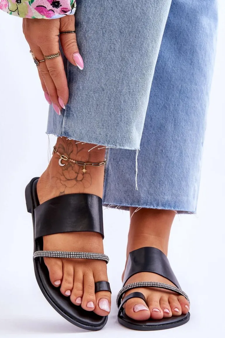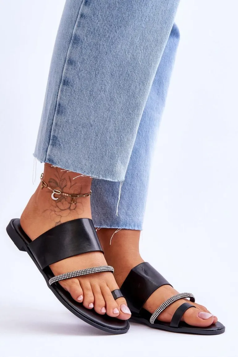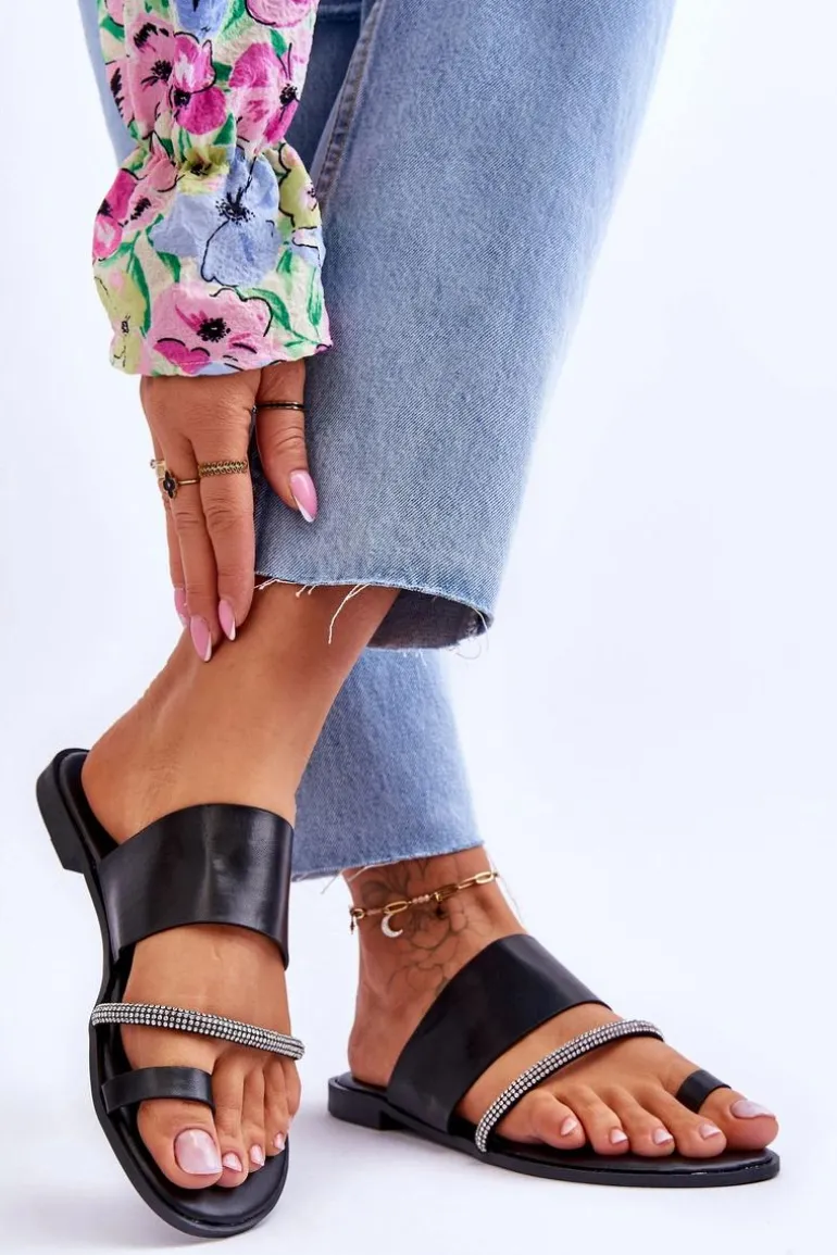 Klasyczne klapki o fasonie japonek zostały wykonane z eko skóry. Posiadają ozdobny paseczek z mieniącymi się dżetami imitującymi cyrkonie. Osadzone na płaskim obcasie z podeszwą z tworzywa sztucznego. Model ten świetnie sprawdzi się do wielu letnich stylizacji. Japonki posiadają miękką, eko skórzaną wkładkę.