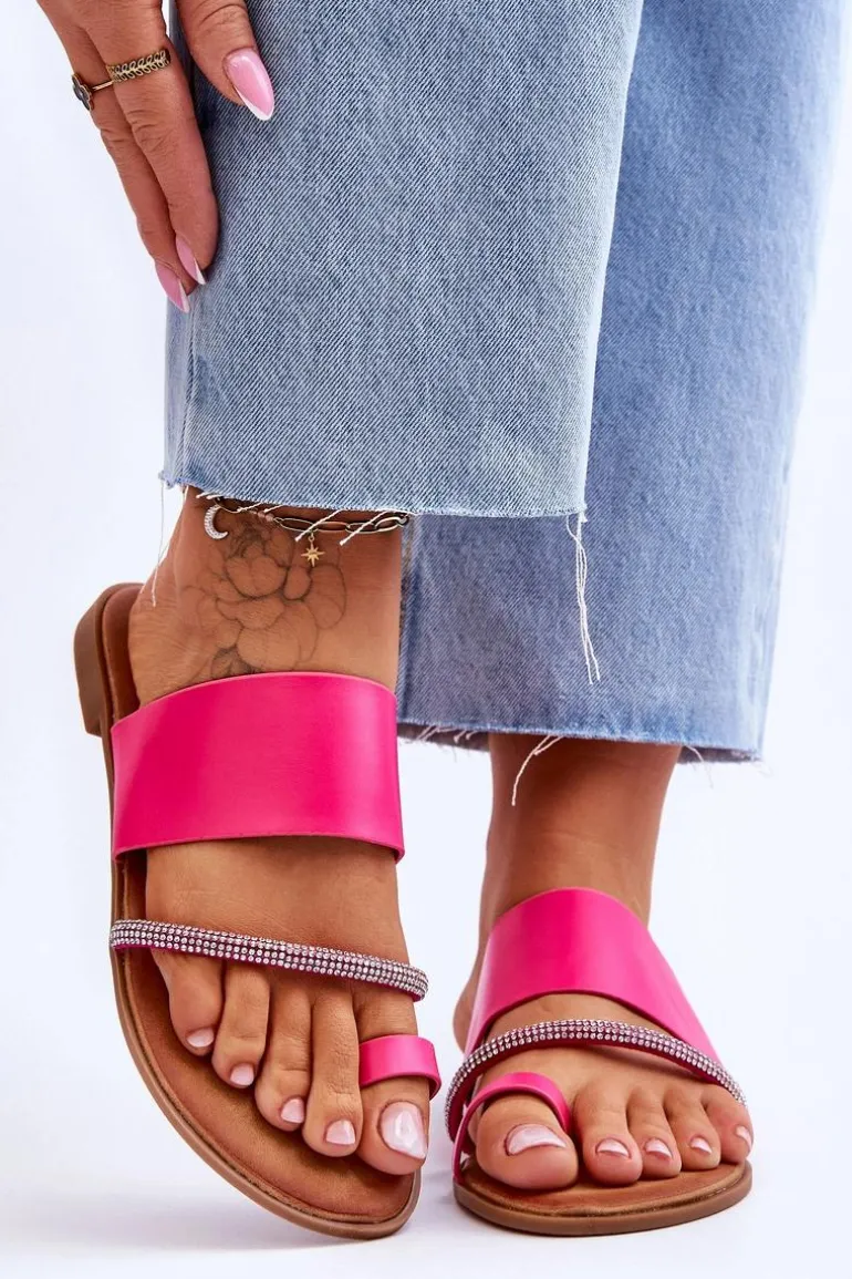Klasyczne klapki o fasonie japonek zostały wykonane z eko skóry. Posiadają ozdobny paseczek z mieniącymi się dżetami imitującymi cyrkonie. Osadzone na płaskim obcasie z podeszwą z tworzywa sztucznego. Model ten świetnie sprawdzi się do wielu letnich stylizacji. Japonki posiadają miękką, eko skórzaną wkładkę.