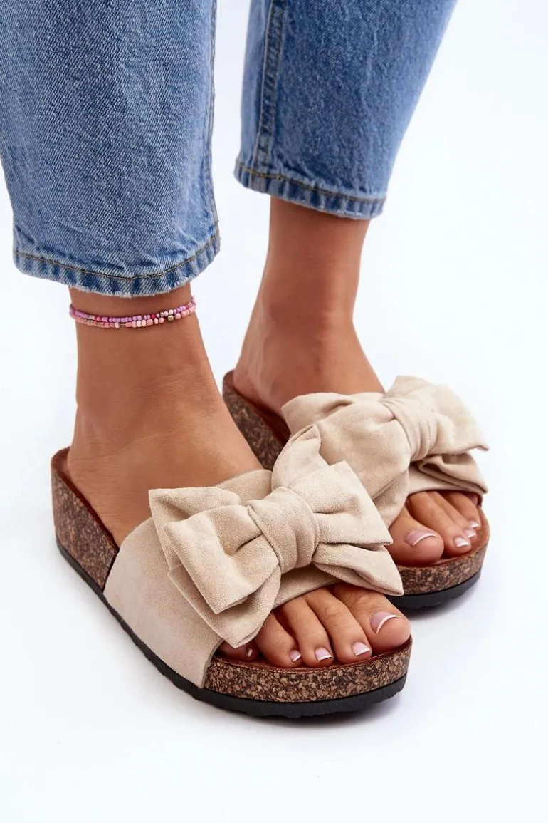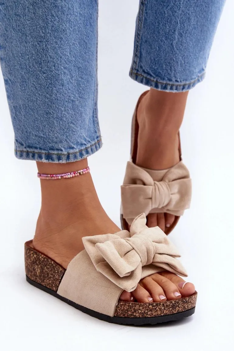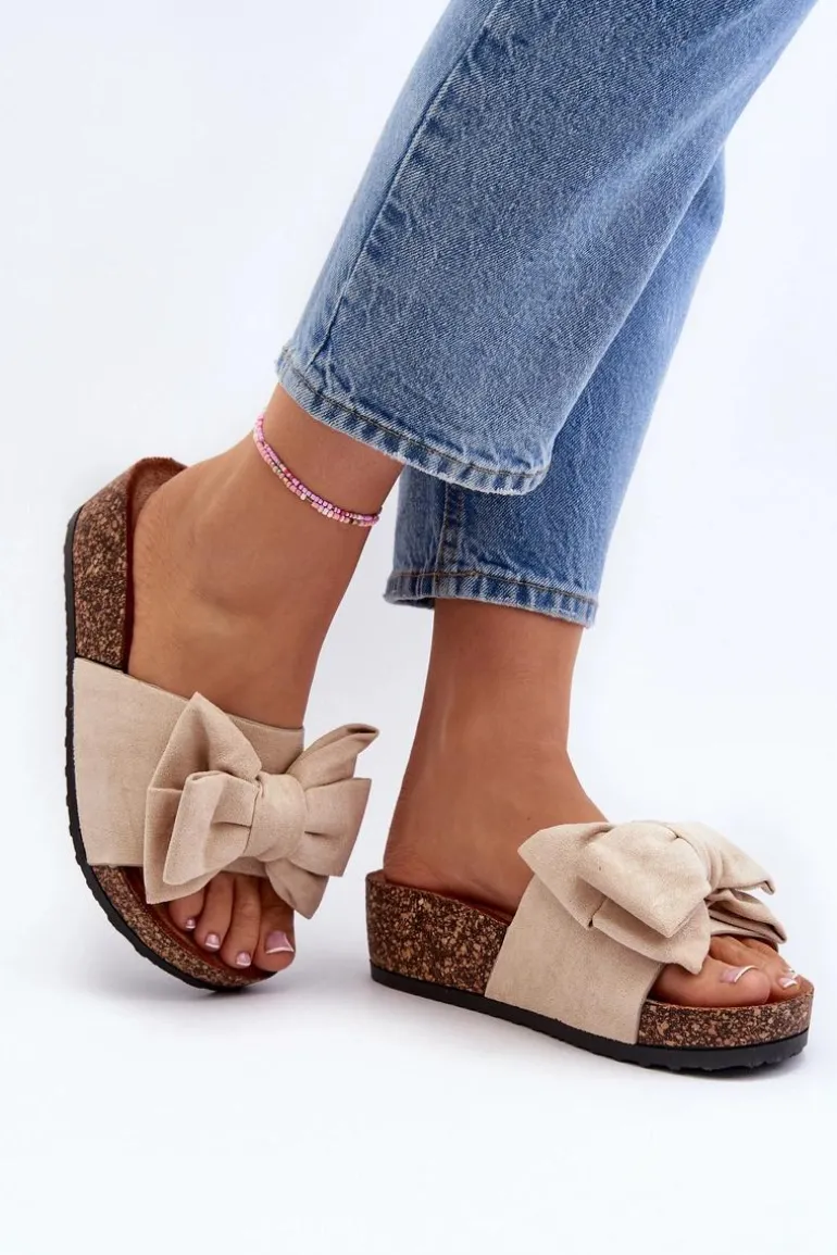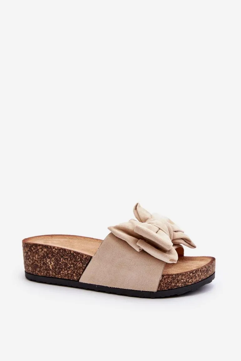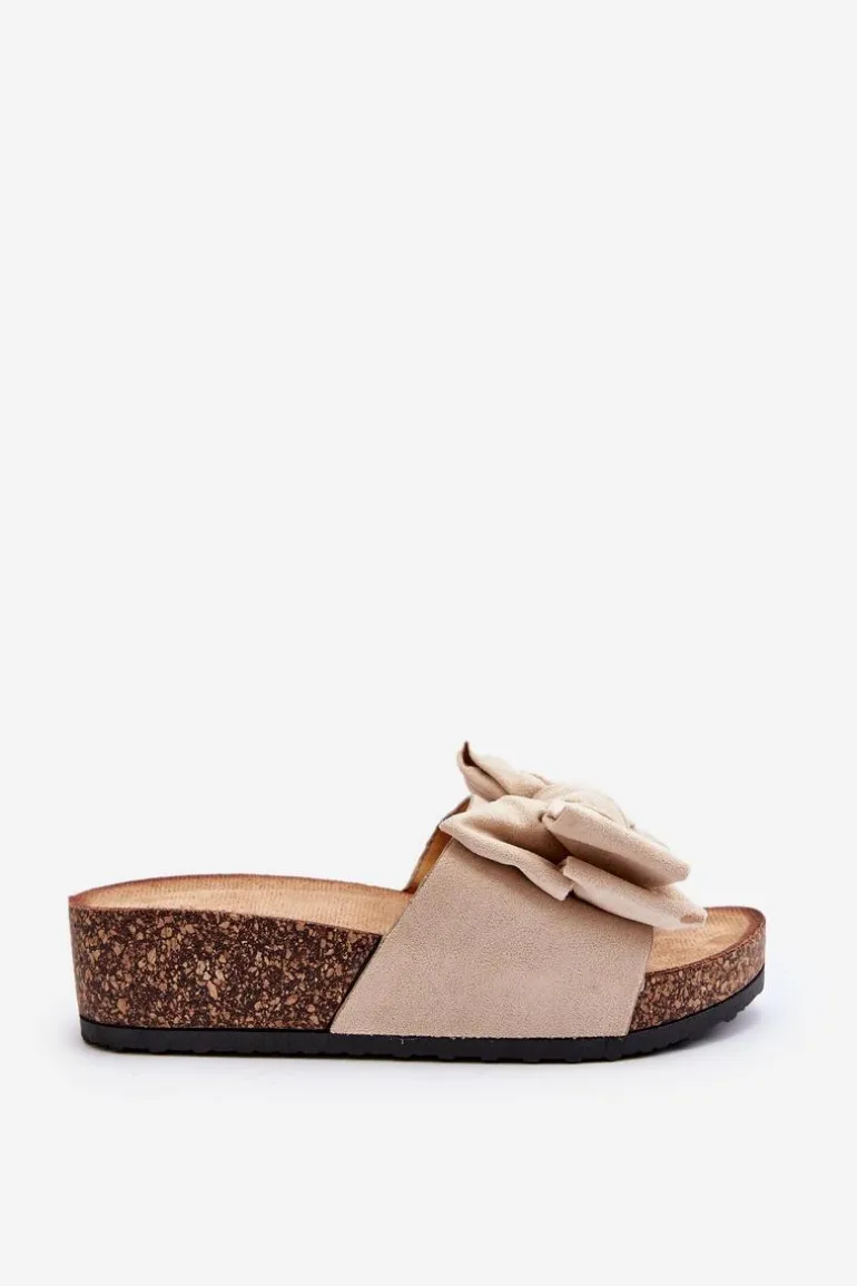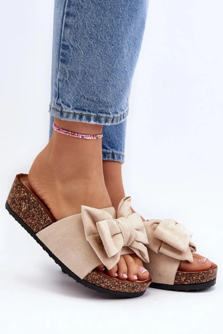 Klapki damskie na korkowej platformie. Buty posiadają lekko profilowaną wkładkę, która zagwarantuje komfort podczas użytkowania. Cholewka wykonana z przyjemnego w dotyku eko zamszu. Urocza kokarda na przodzie. Model ten idealnie sprawdzi się na co dzień, do pracy czy na zakupy. Idealne na upalne dni! Koniecznie powinnaś je mieć! Przy wyborze rozmiaru prosimy sugerować się tabelą rozmiarów.