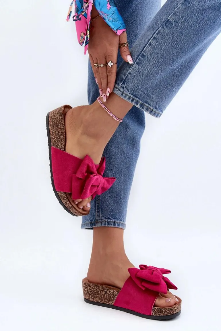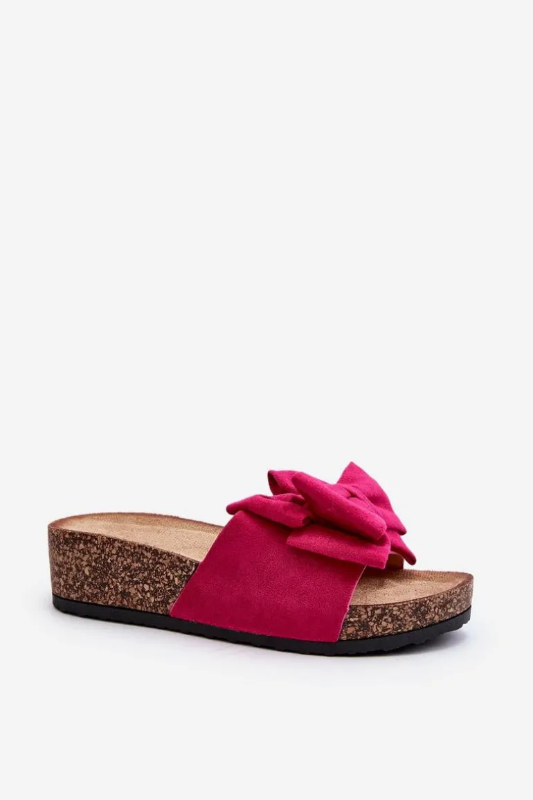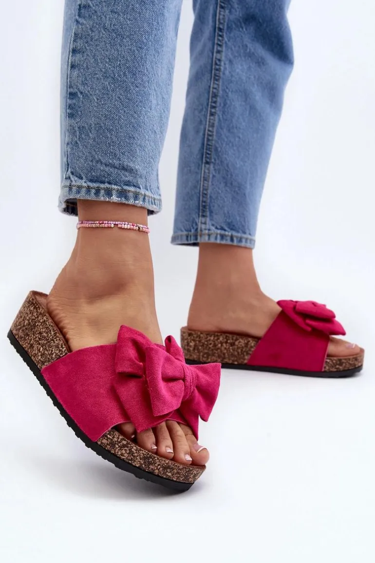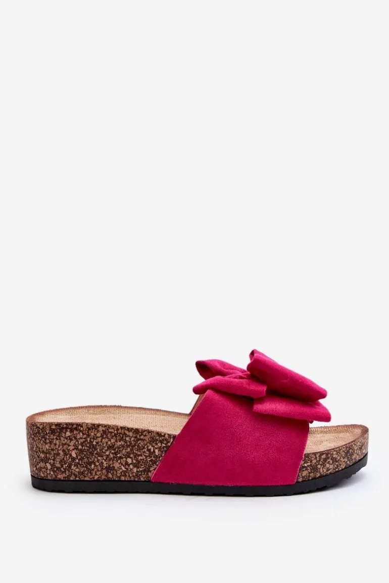 Klapki damskie na korkowej platformie. Buty posiadają lekko profilowaną wkładkę, która zagwarantuje komfort podczas użytkowania. Cholewka wykonana z przyjemnego w dotyku eko zamszu. Urocza kokarda na przodzie. Model ten idealnie sprawdzi się na co dzień, do pracy czy na zakupy. Idealne na upalne dni! Koniecznie powinnaś je mieć! Przy wyborze rozmiaru prosimy sugerować się tabelą rozmiarów.