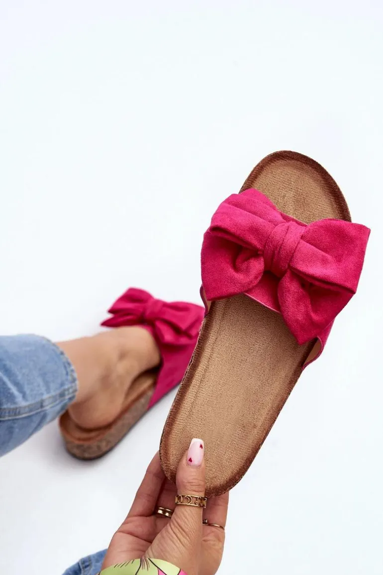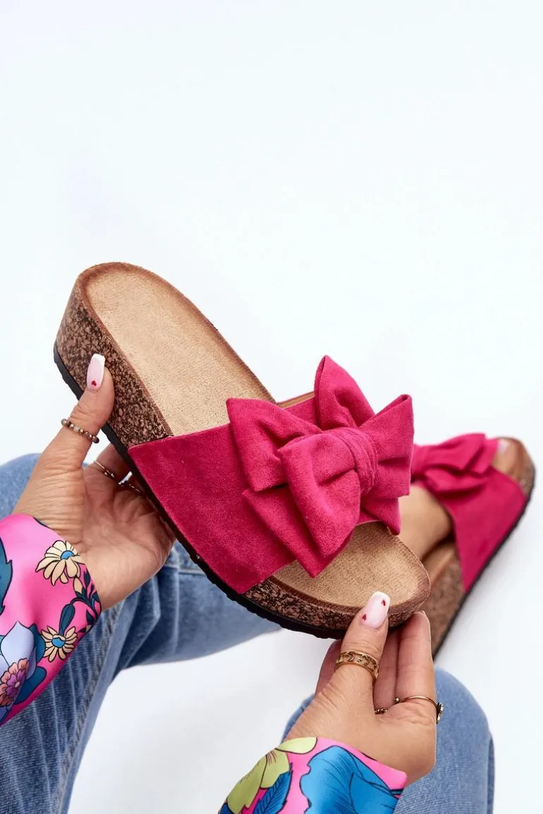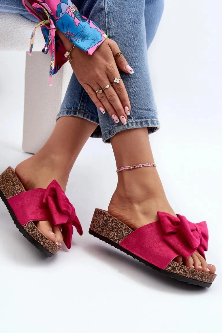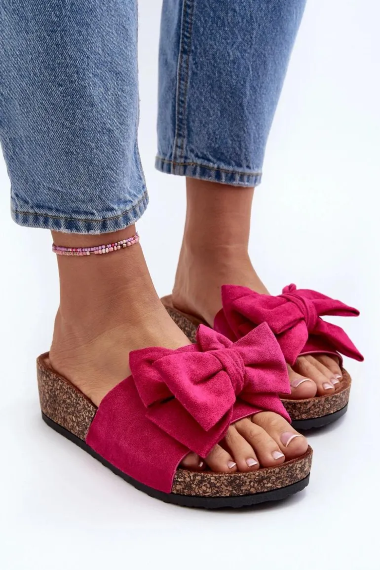 Klapki damskie na korkowej platformie. Buty posiadają lekko profilowaną wkładkę, która zagwarantuje komfort podczas użytkowania. Cholewka wykonana z przyjemnego w dotyku eko zamszu. Urocza kokarda na przodzie. Model ten idealnie sprawdzi się na co dzień, do pracy czy na zakupy. Idealne na upalne dni! Koniecznie powinnaś je mieć! Przy wyborze rozmiaru prosimy sugerować się tabelą rozmiarów.