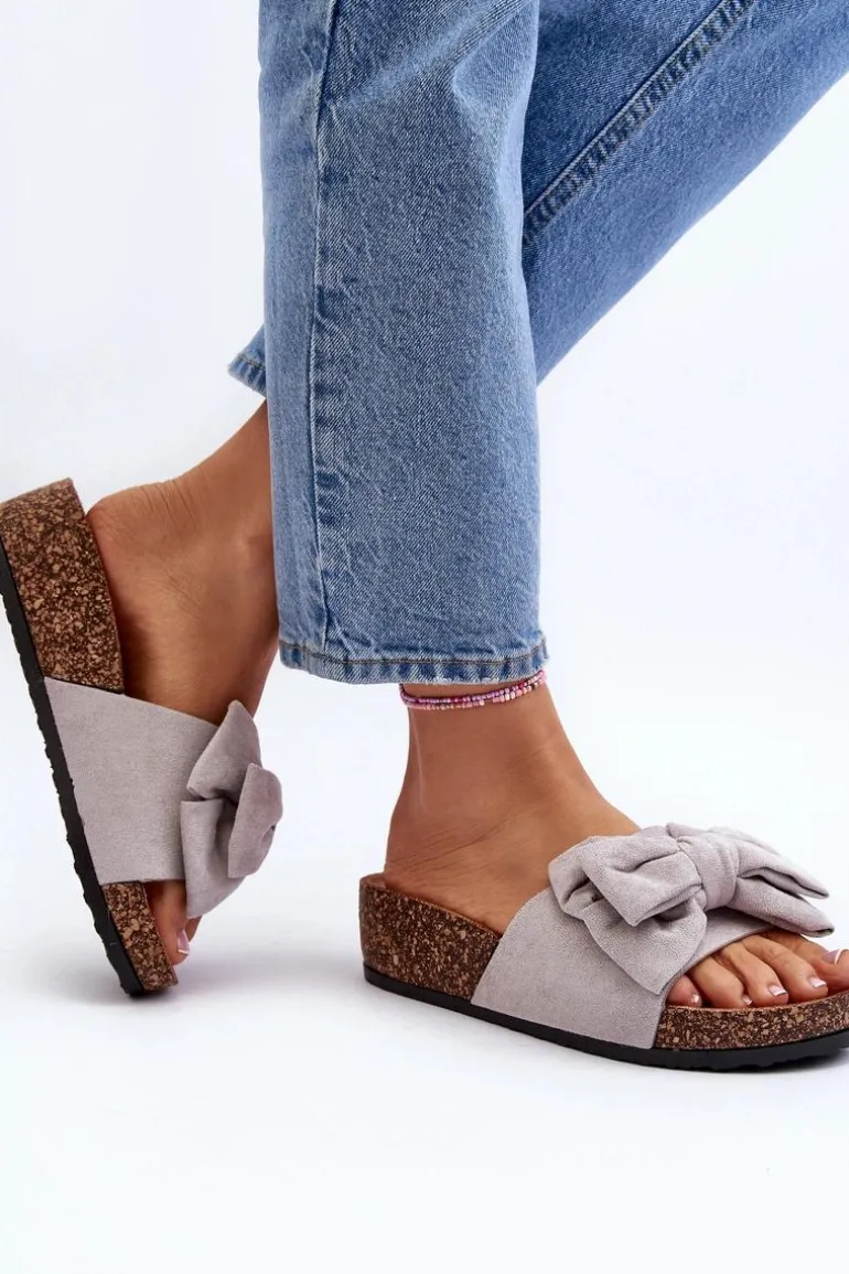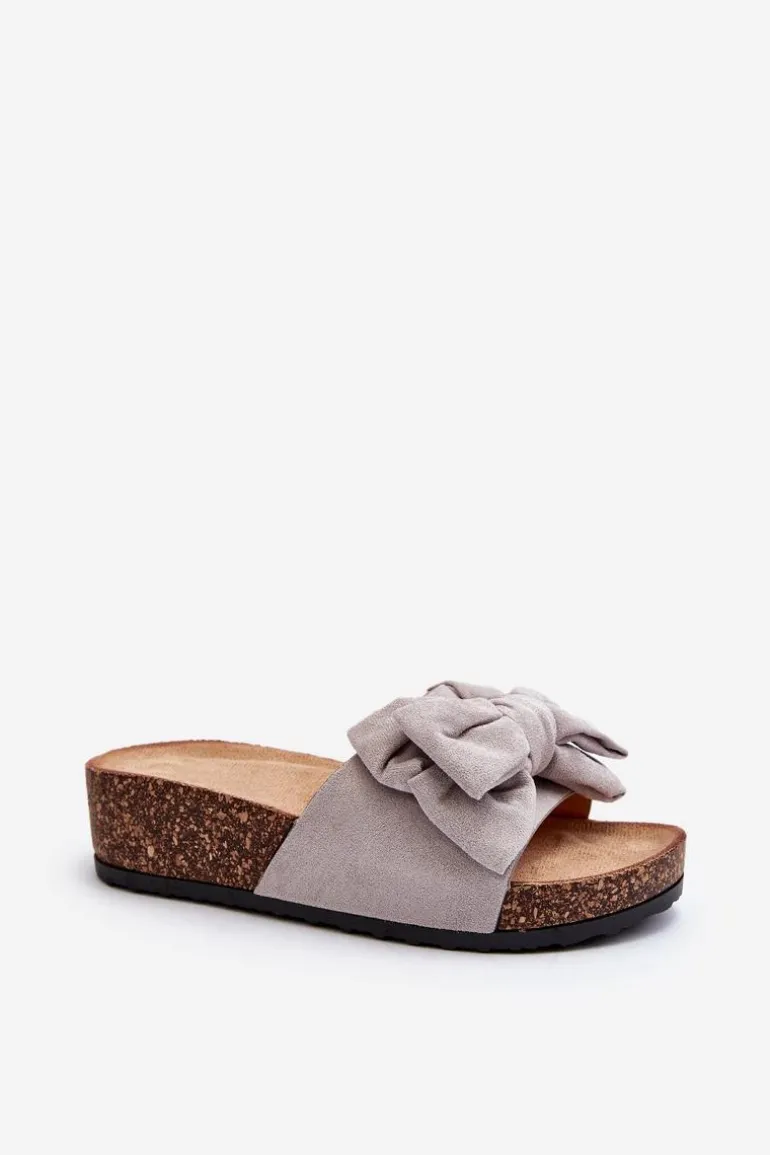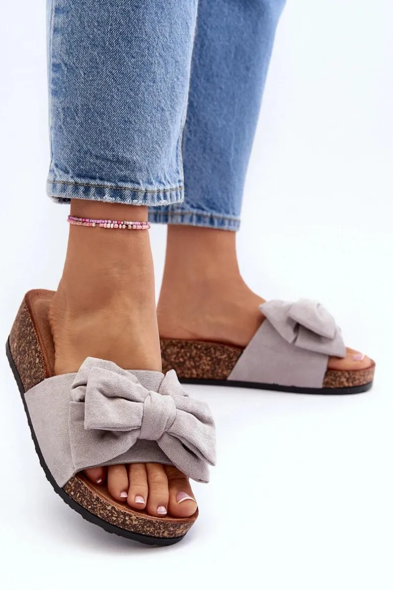 Klapki damskie na korkowej platformie. Buty posiadają lekko profilowaną wkładkę, która zagwarantuje komfort podczas użytkowania. Cholewka wykonana z przyjemnego w dotyku eko zamszu. Urocza kokarda na przodzie. Model ten idealnie sprawdzi się na co dzień, do pracy czy na zakupy. Idealne na upalne dni! Koniecznie powinnaś je mieć! Przy wyborze rozmiaru prosimy sugerować się tabelą rozmiarów.